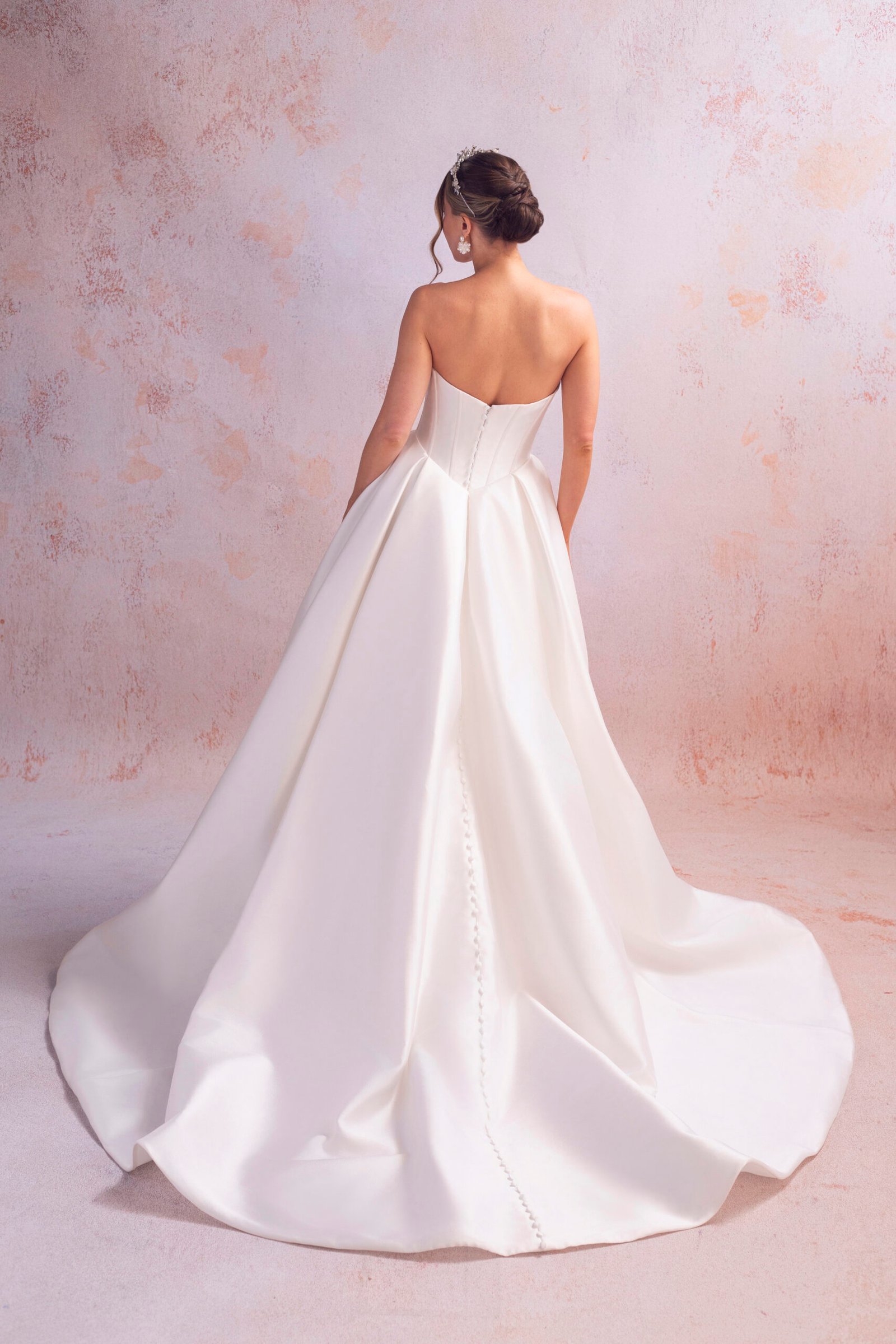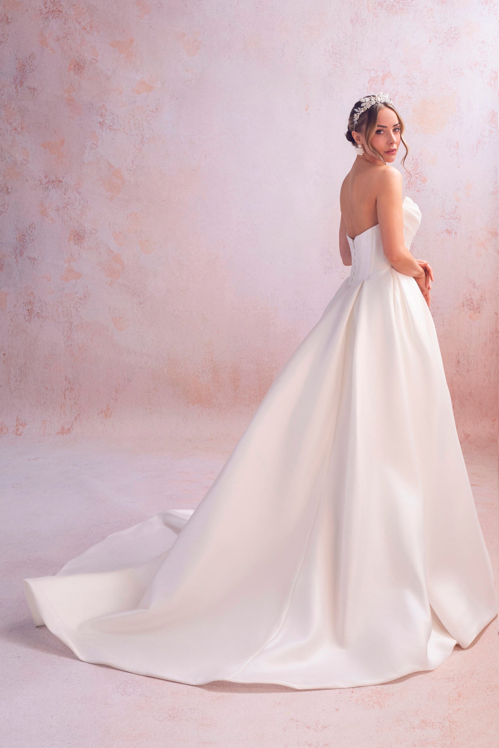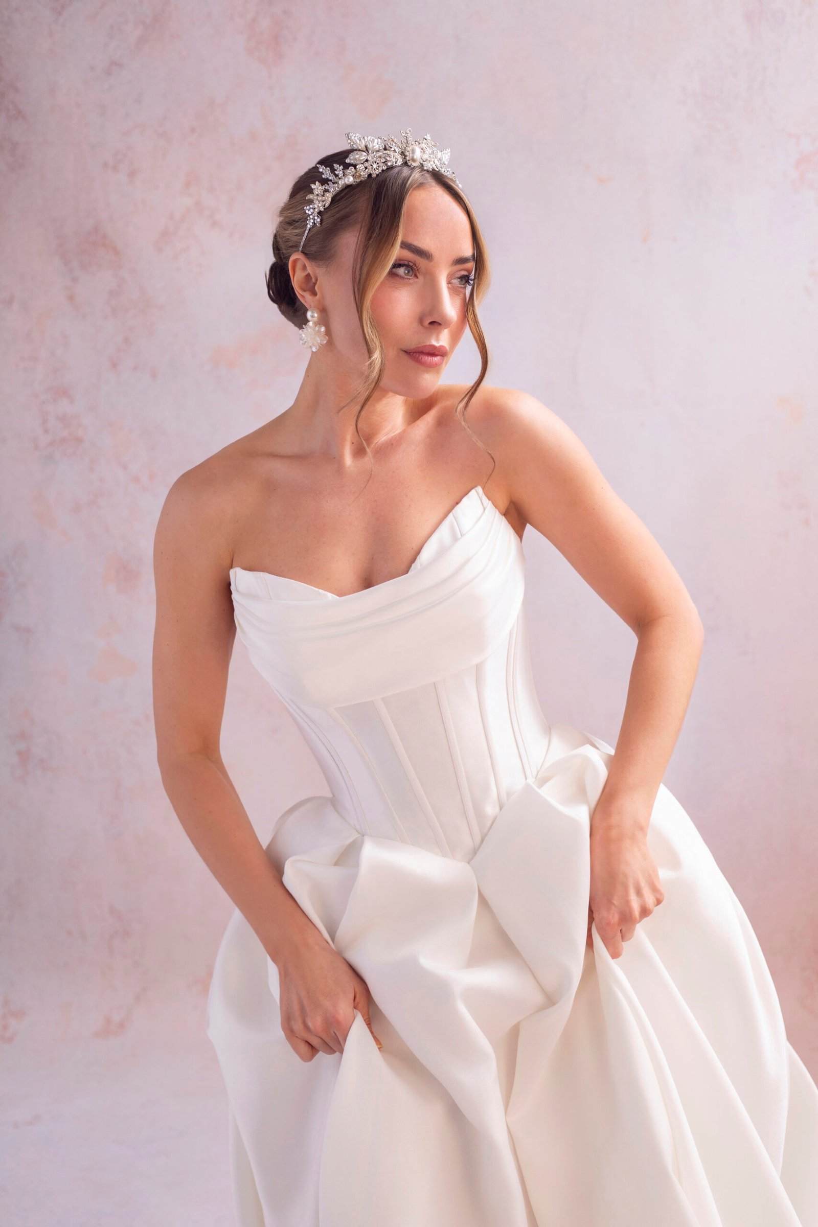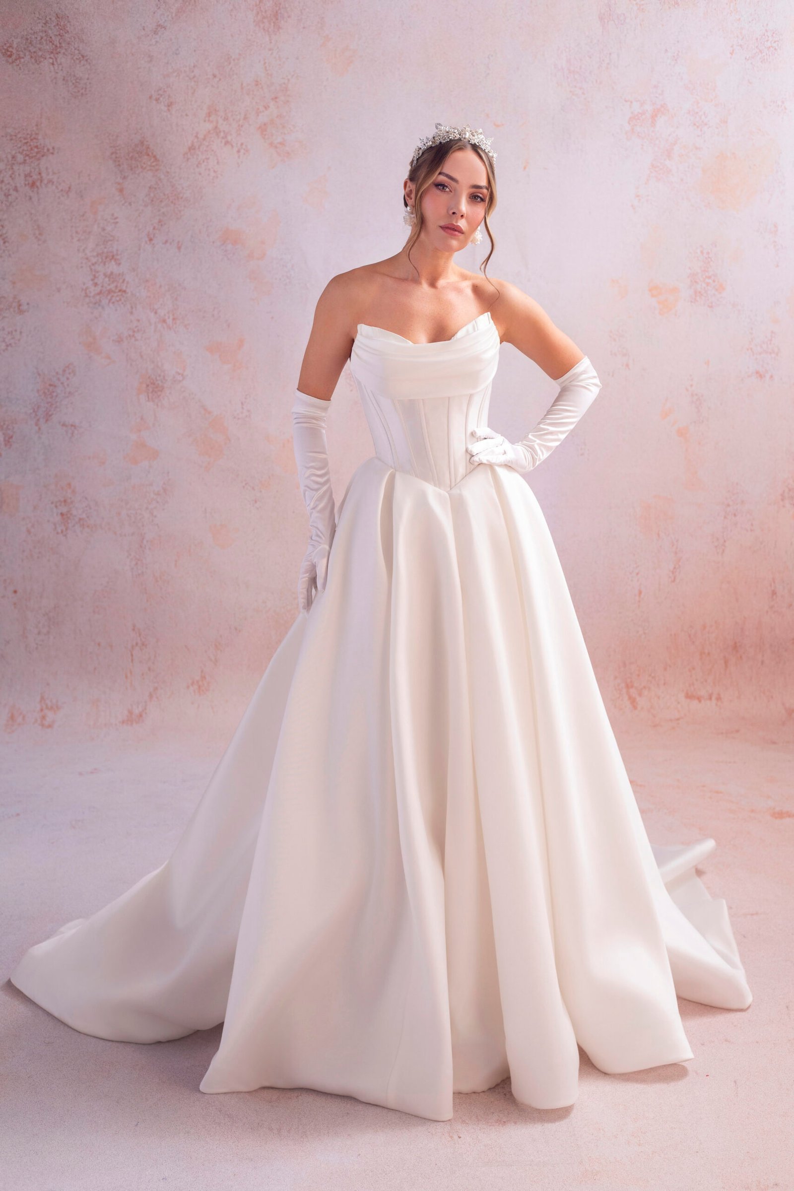Aria is a classic and minimalist ball gown with an elegant and timeless feel. It features a strapless bodice with a clean, structured silhouette that highlights the shoulders and neckline. The full skirt flows gracefully from the waist, creating volume.