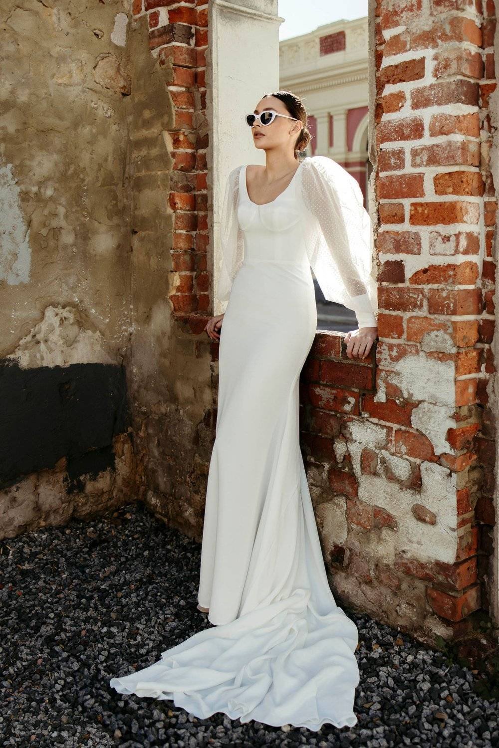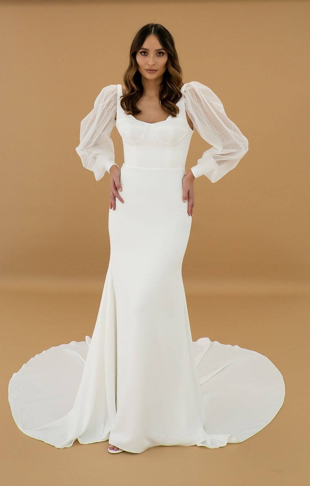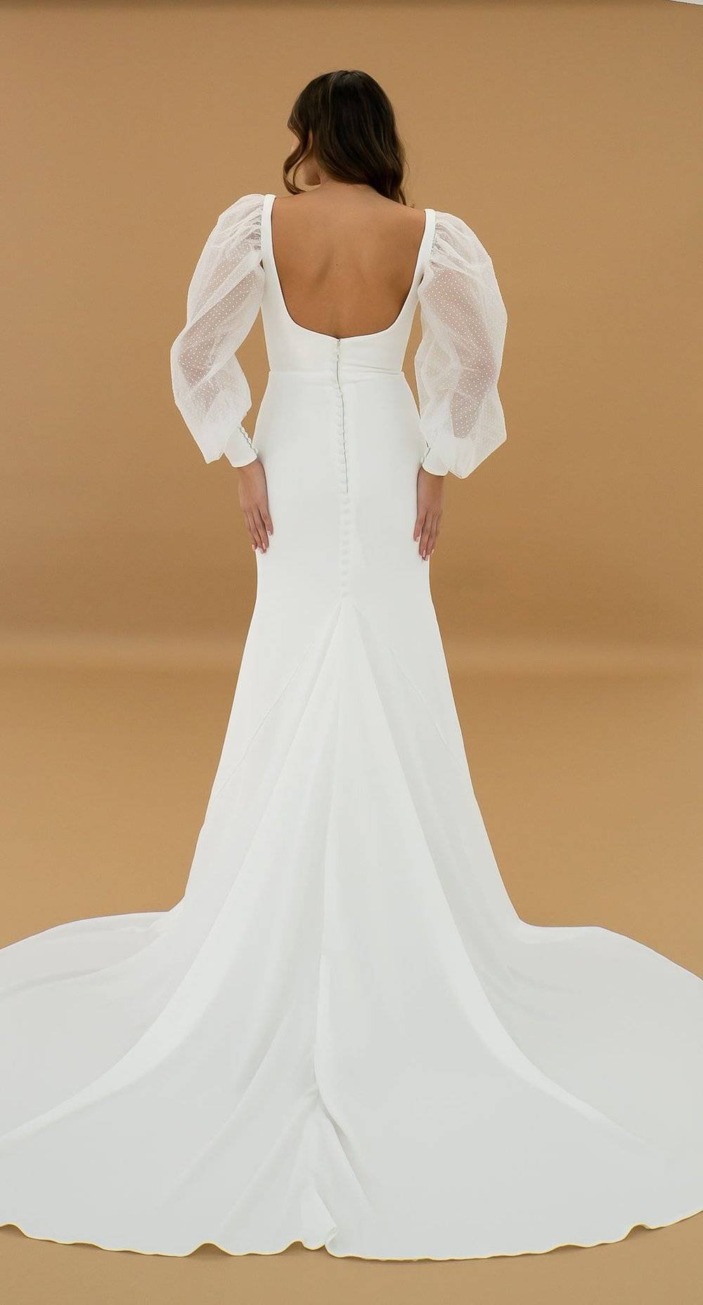 A stunning crepe gown featuring a scoop neck and balloon sleeves.
