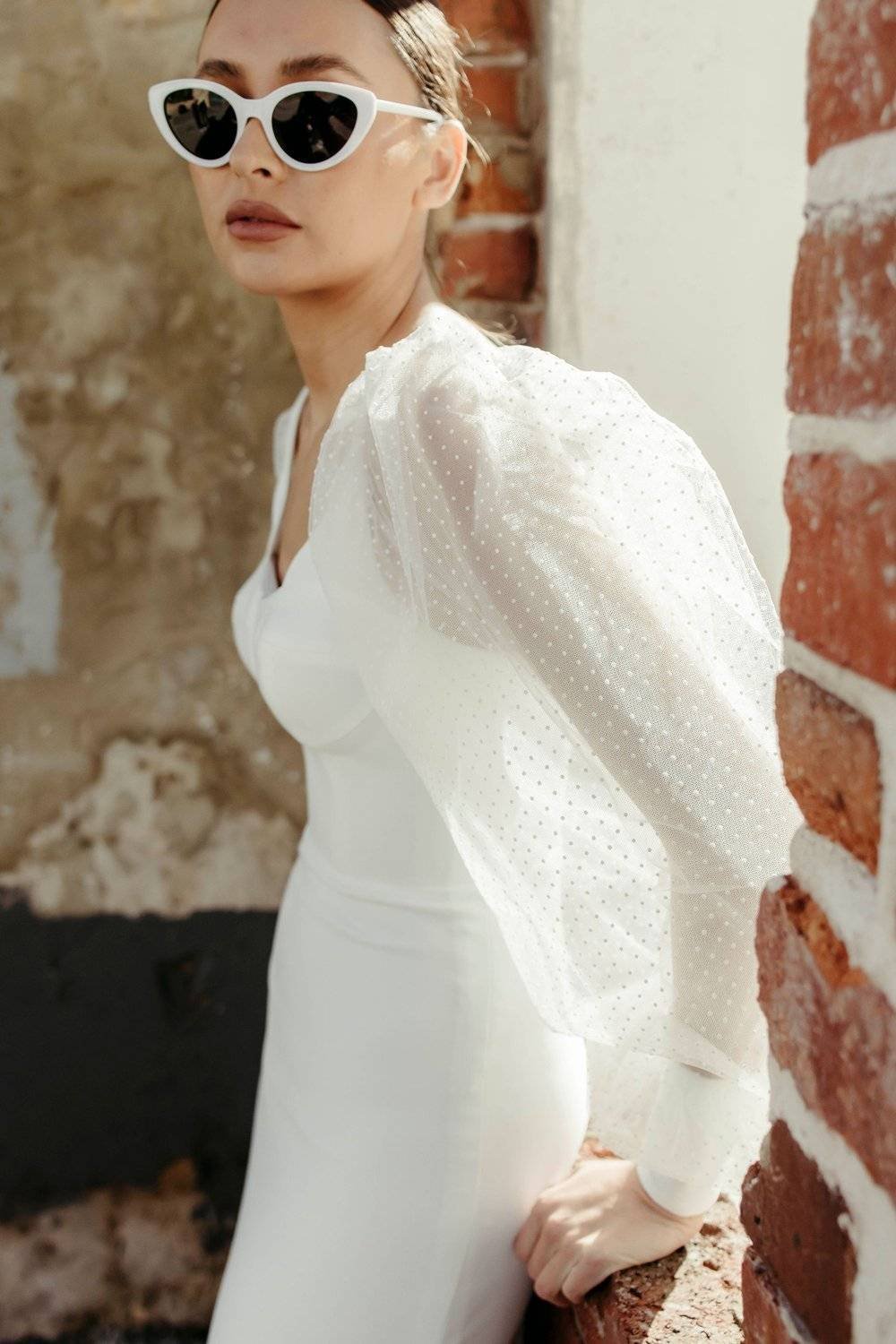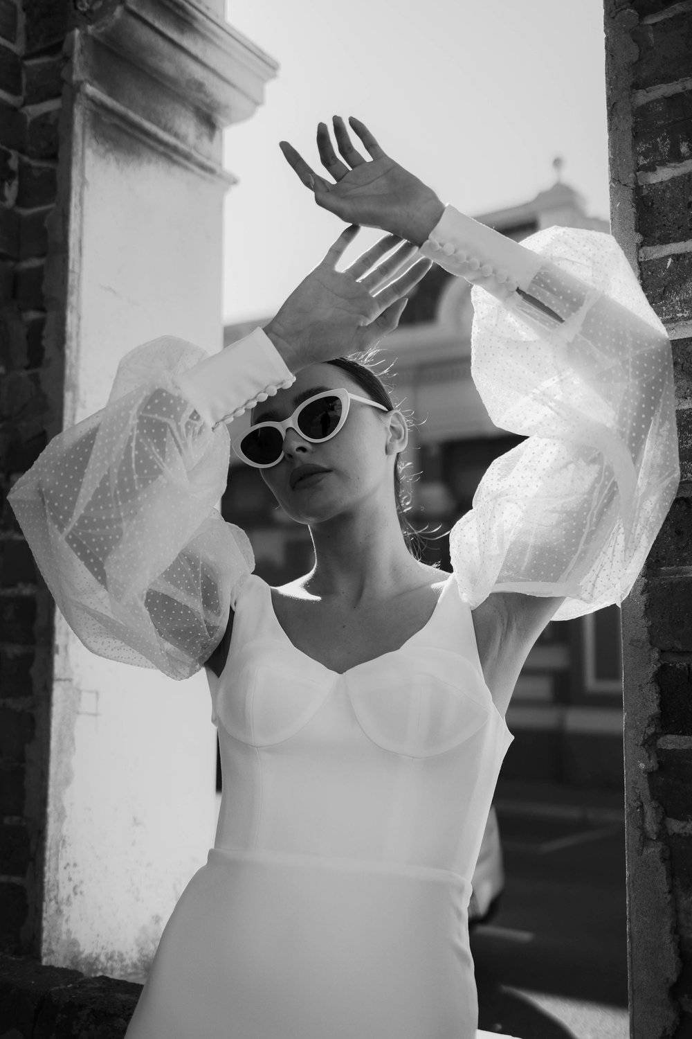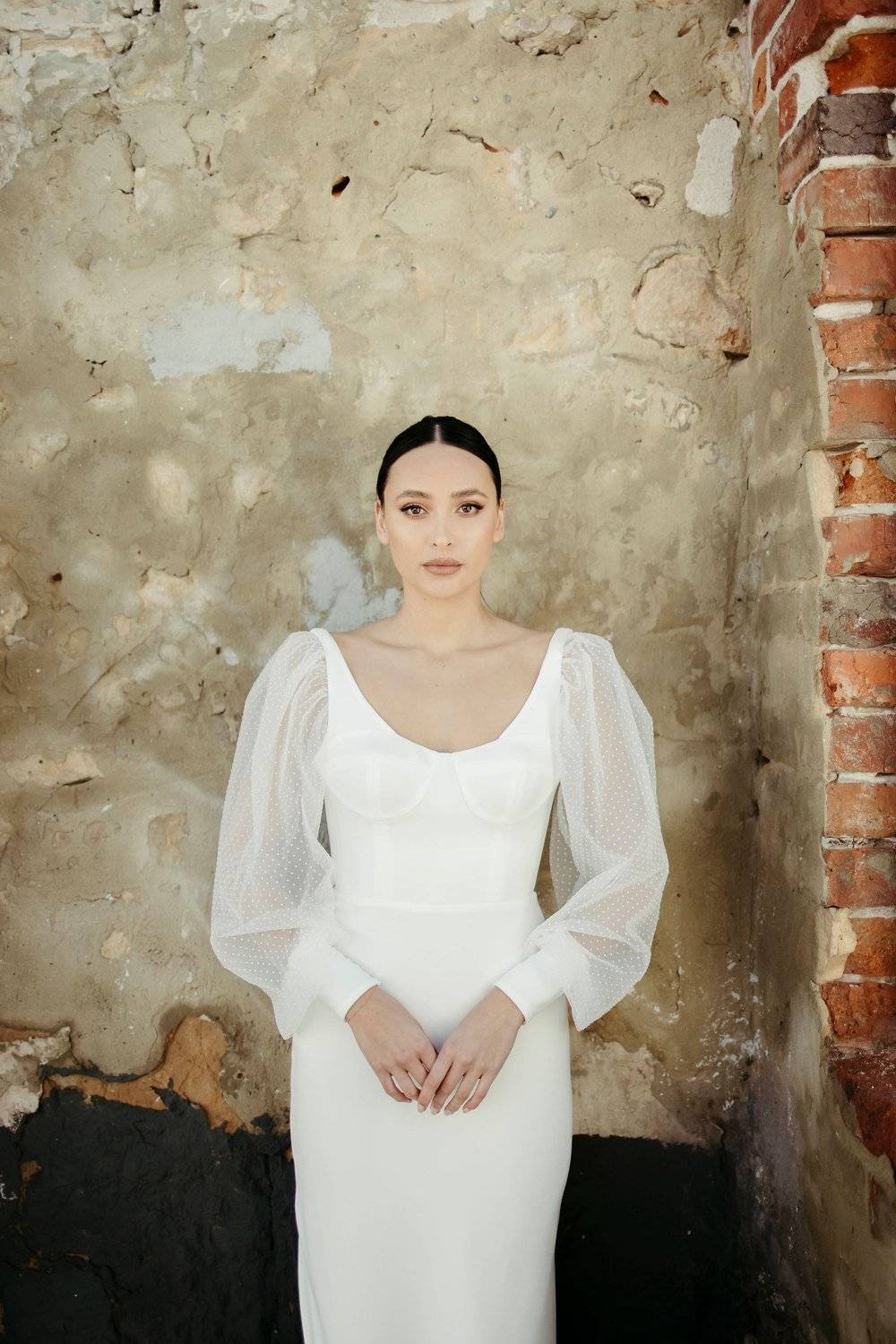 A stunning crepe gown featuring a scoop neck and balloon sleeves.