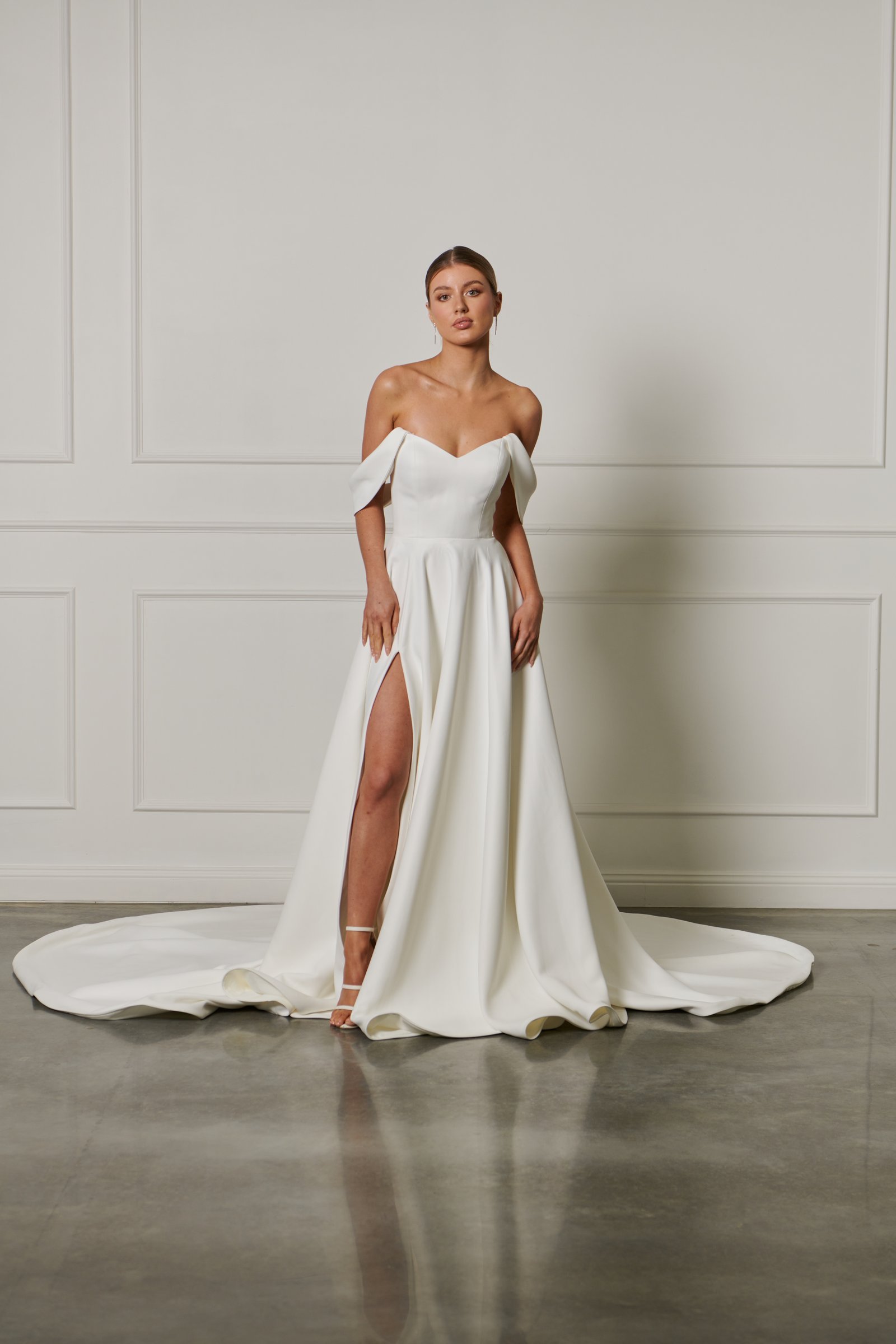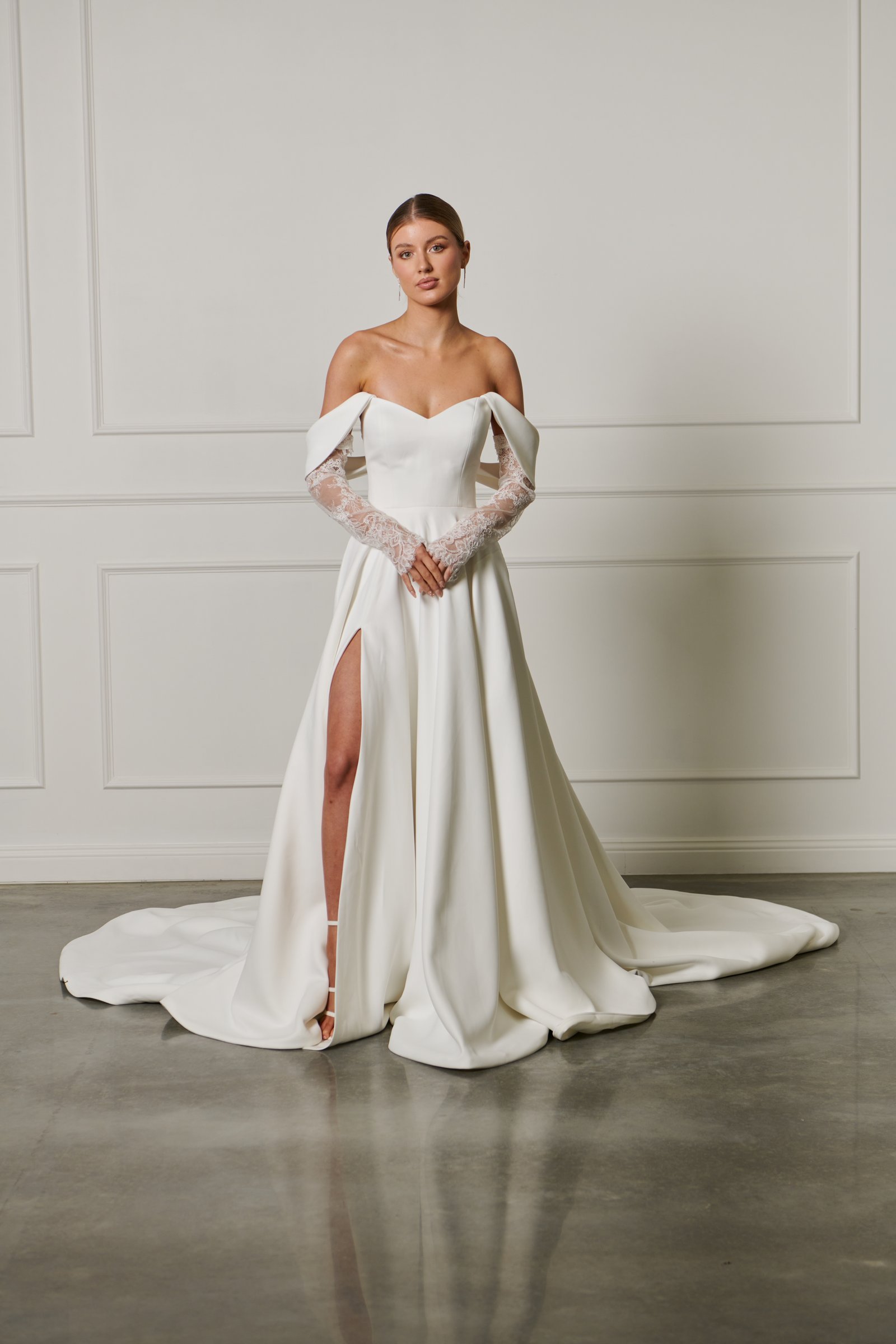 A simple feminine off-shoulder gown with a cat eye neckline and detachable lace long sleeves