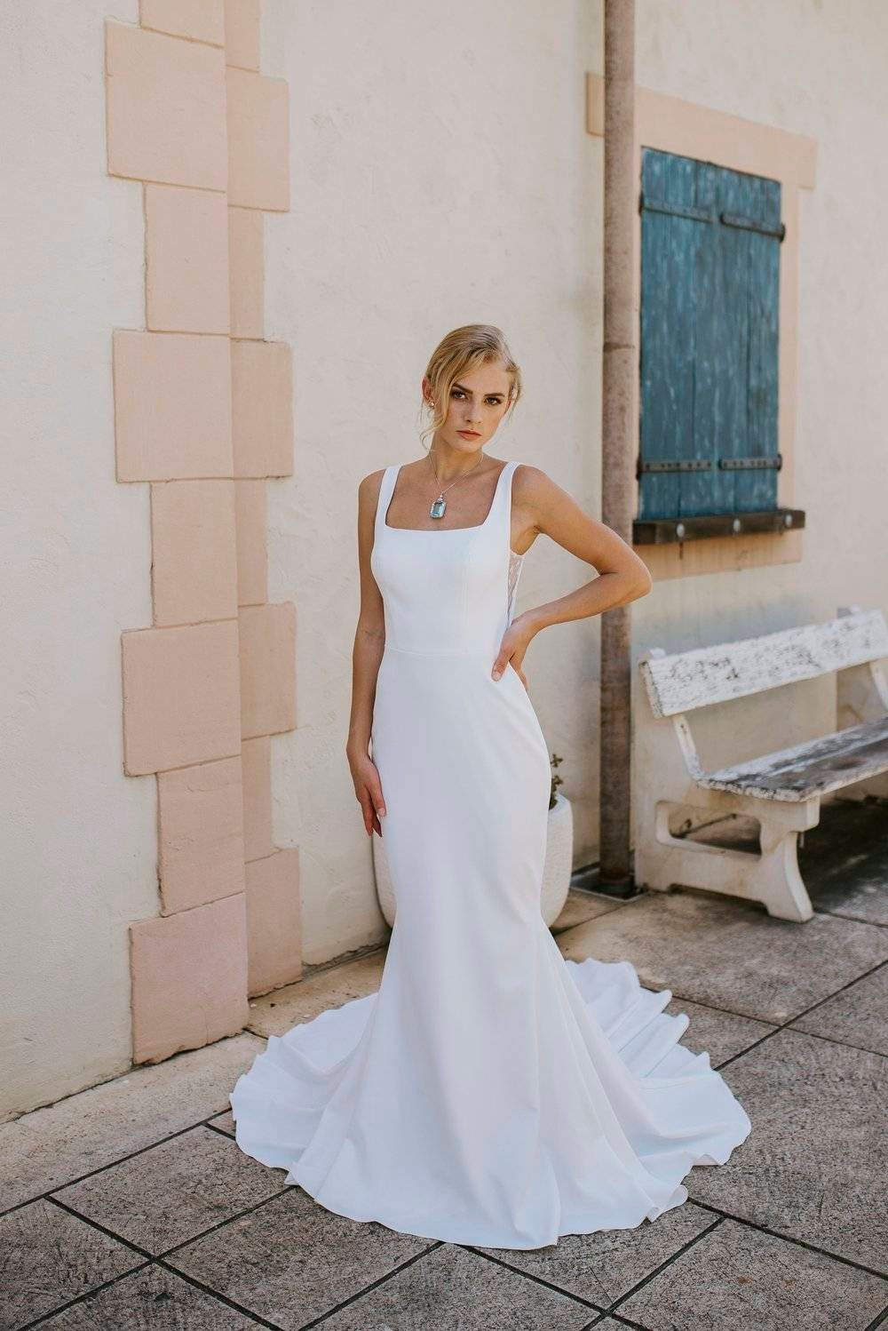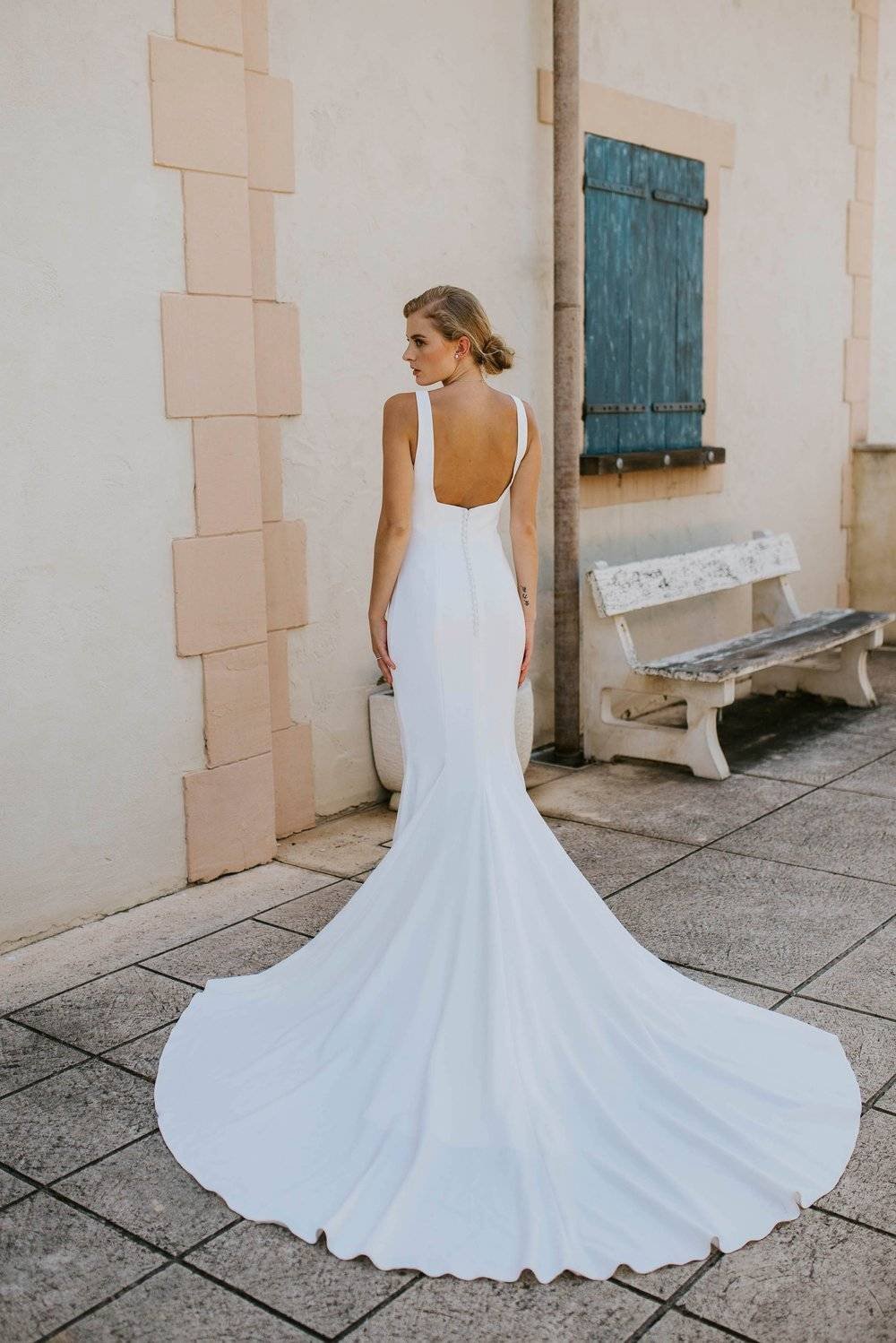 Minimal, modern and timeless. Crafted with ivory crepe that smooths over every curve, paired with a stunning train.