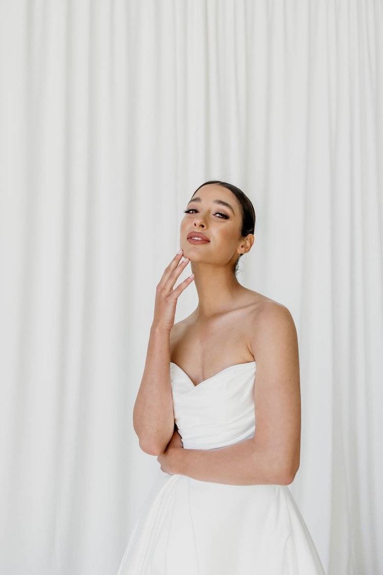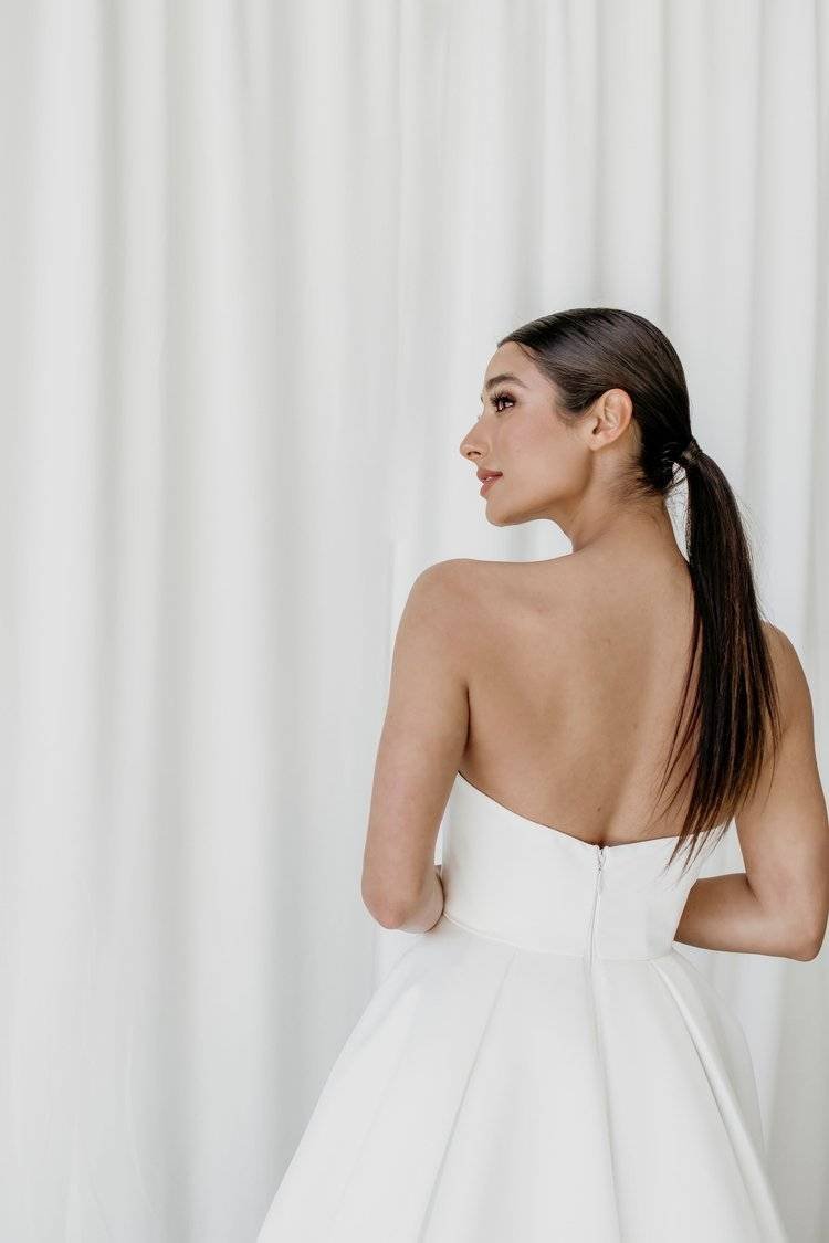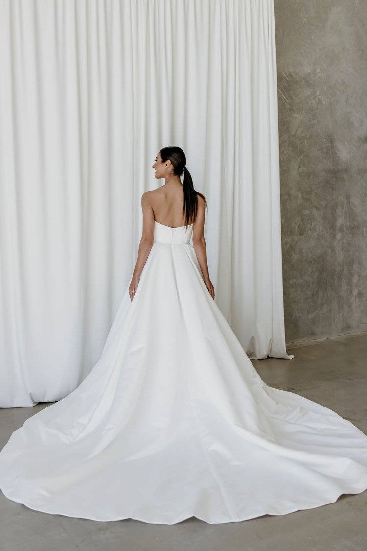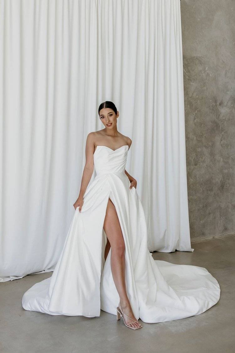 An A-line skirt gown featuring a daring split, structured bodice and glamorous train.