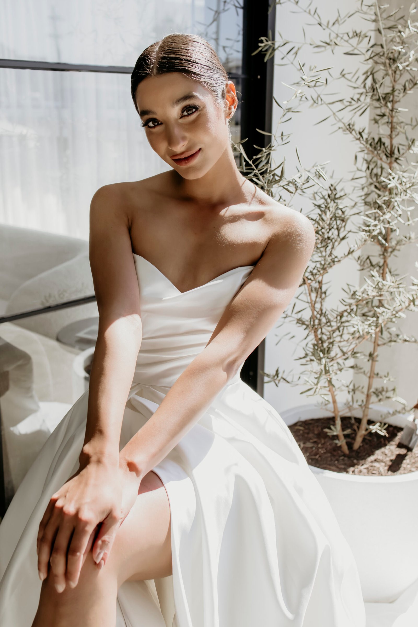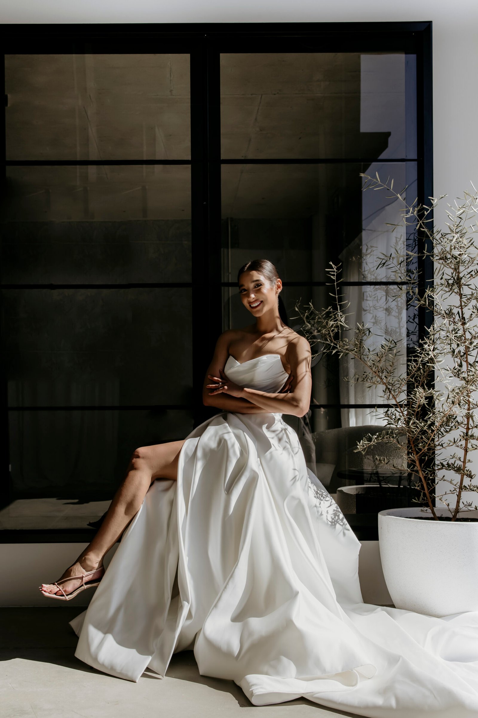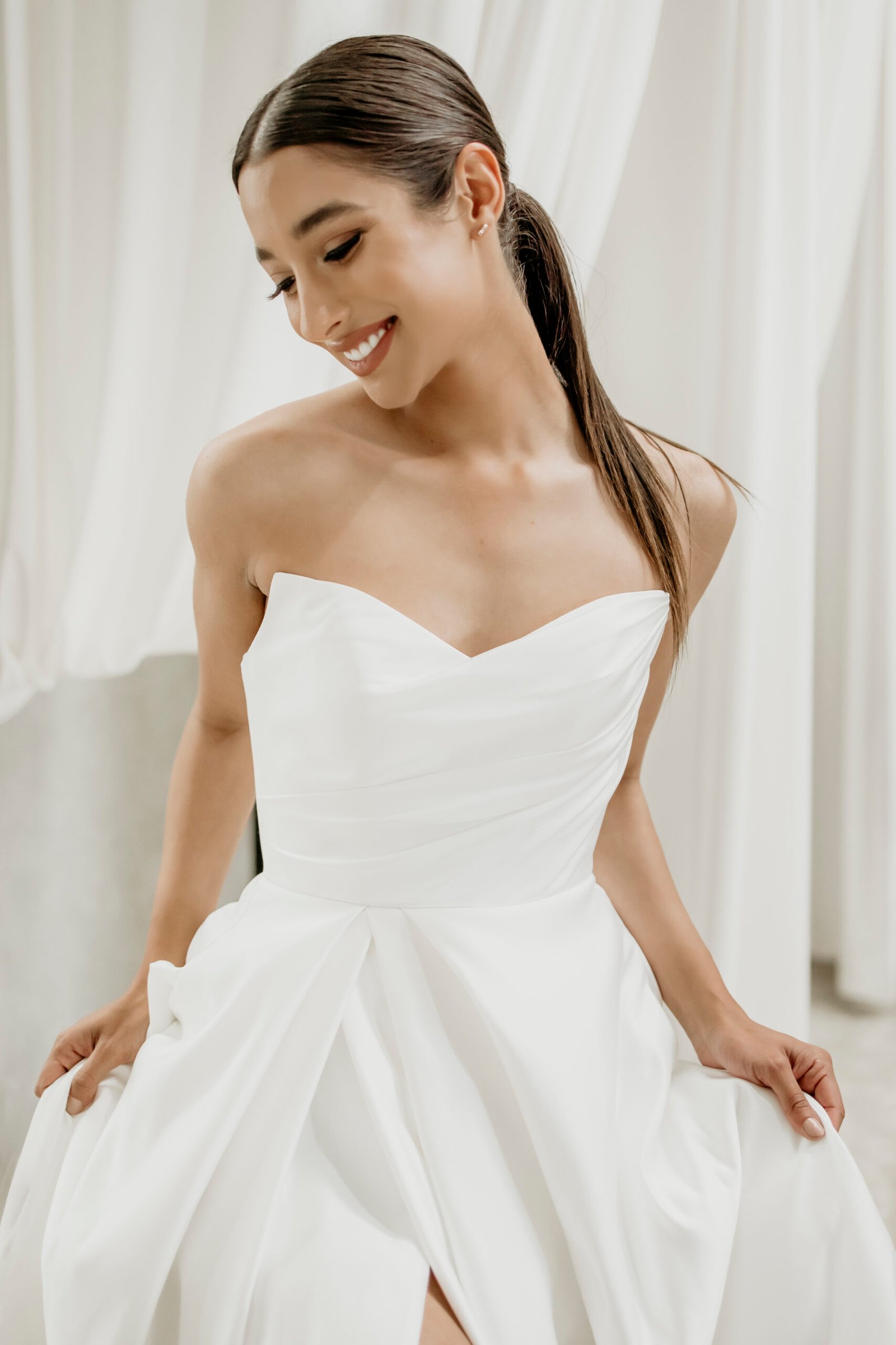 An A-line skirt gown featuring a daring split, structured bodice and glamorous train.