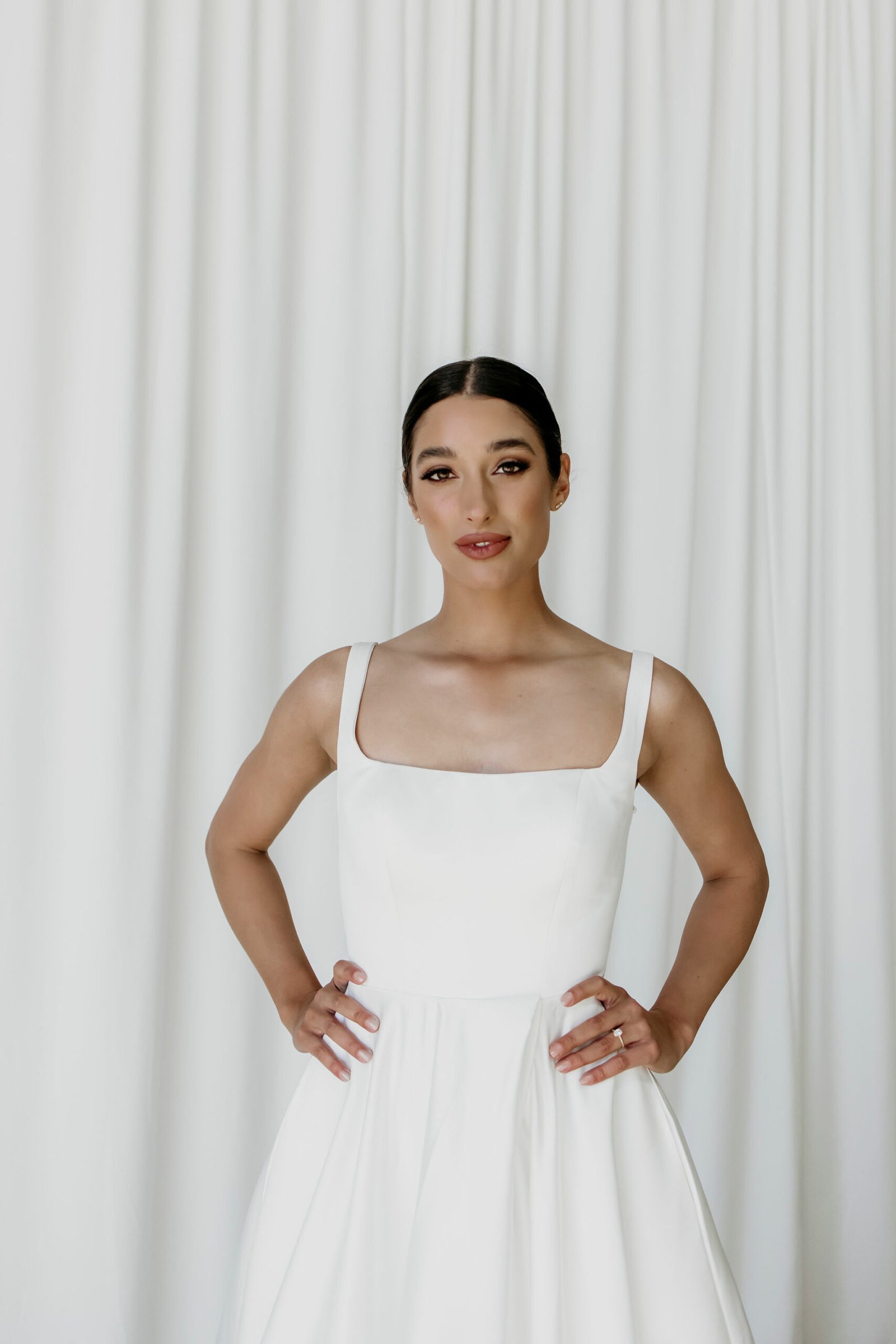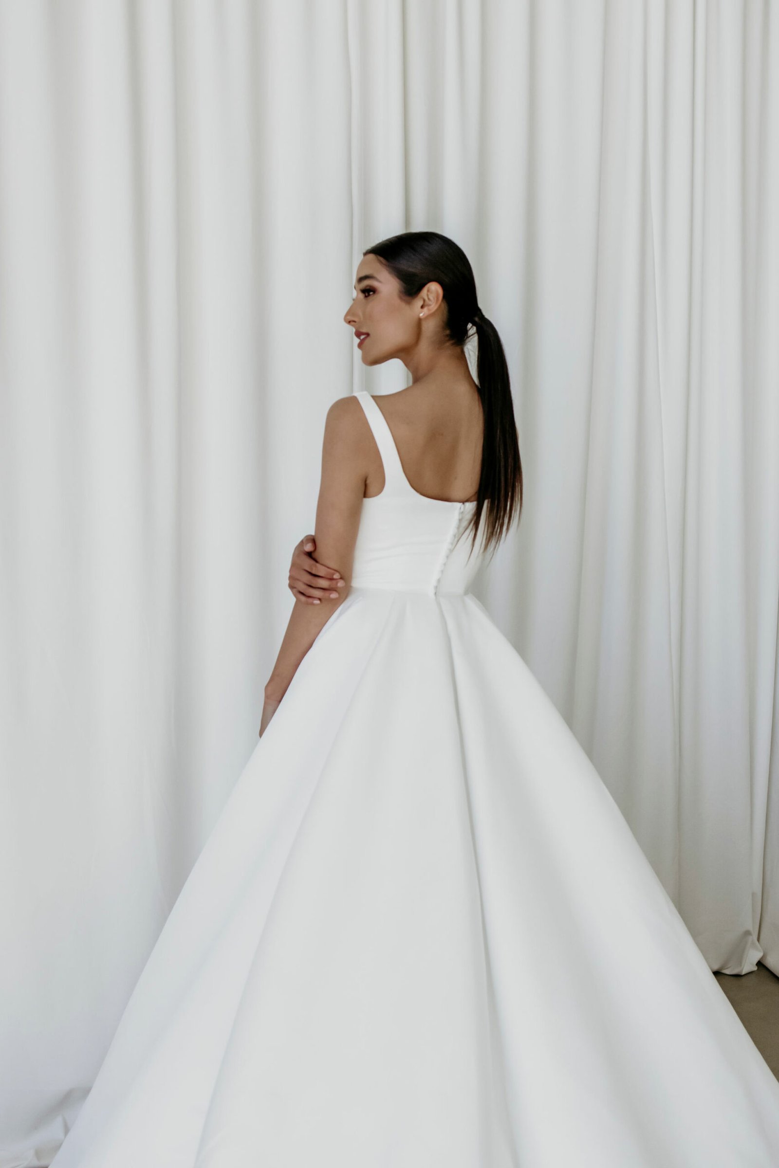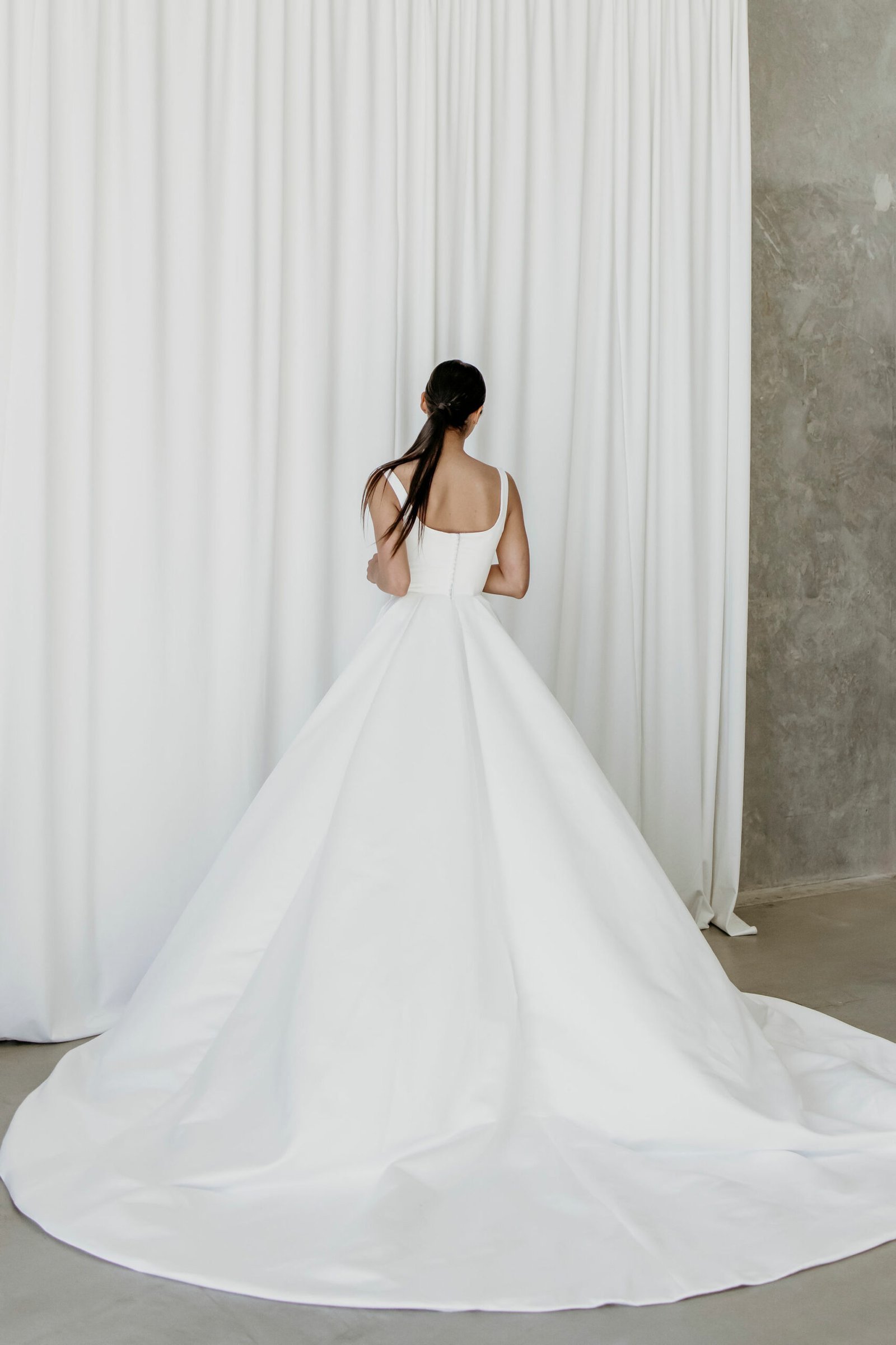 An ivory gown, complemented by a timeless square neckline and dramatic a-line skirt