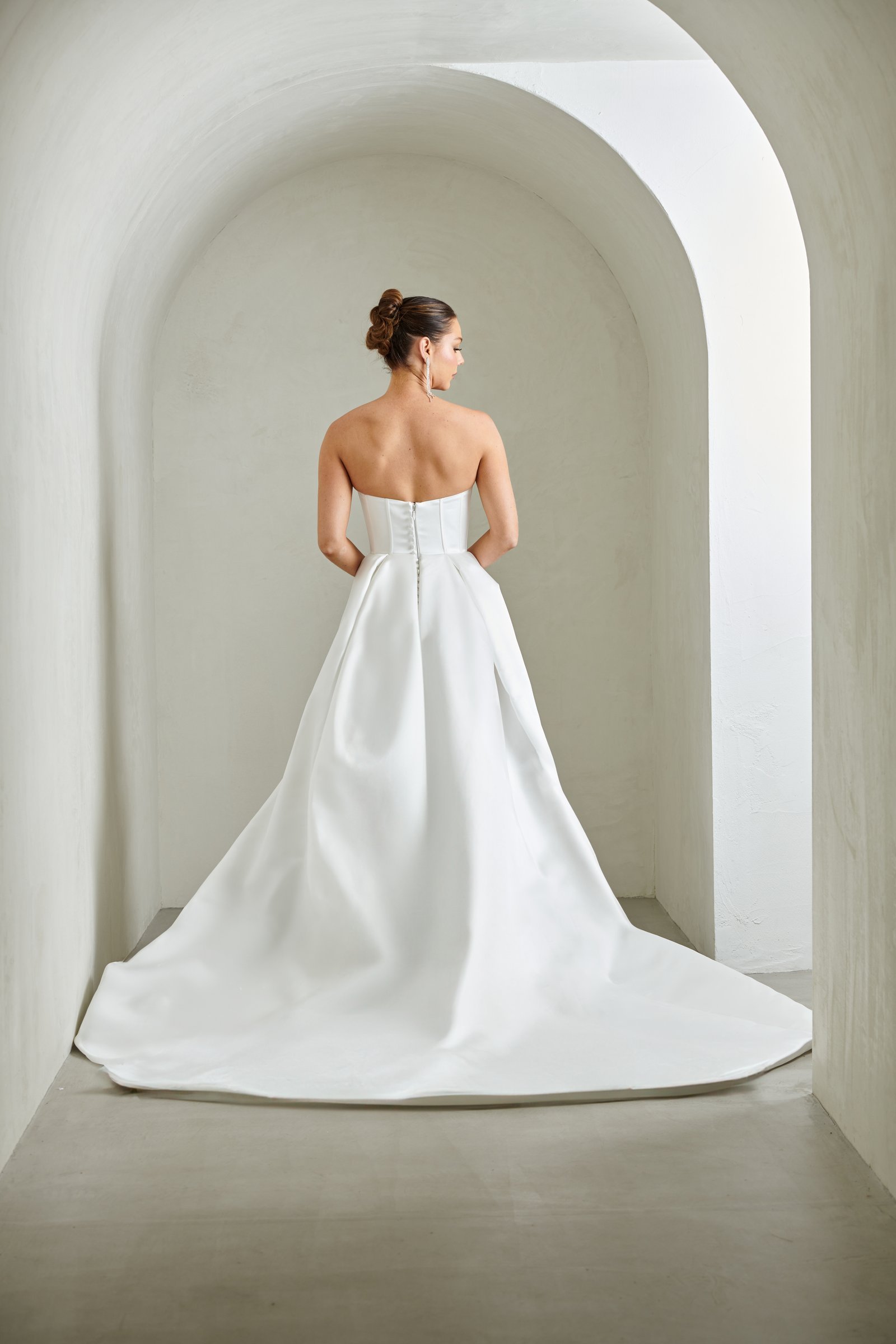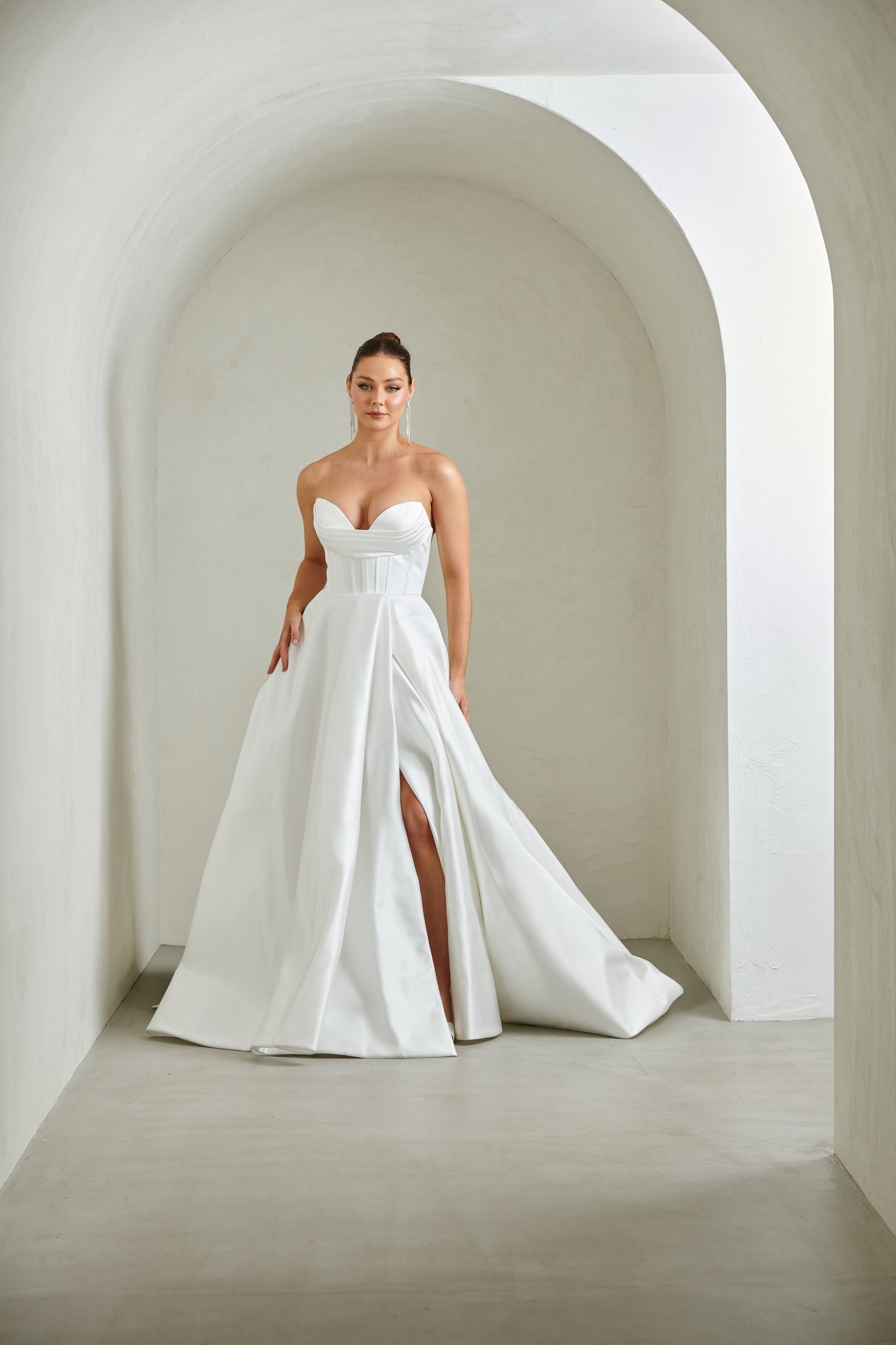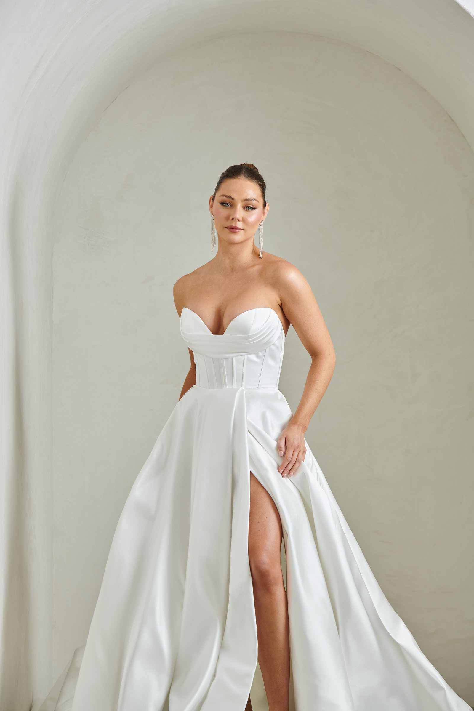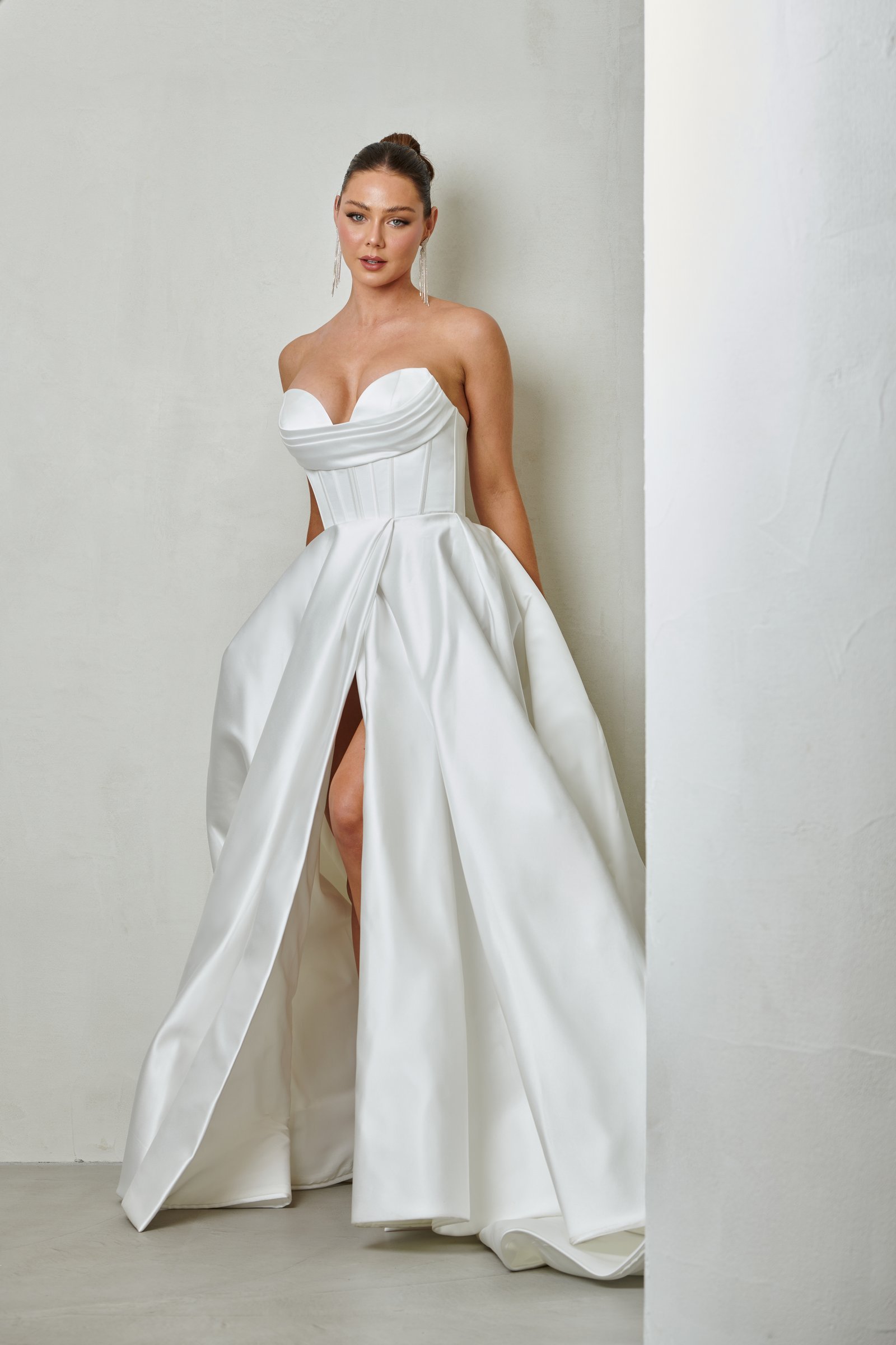 An a-line skirt gown featuring a daring split, structured bodice and a stunning sweetheart neckline