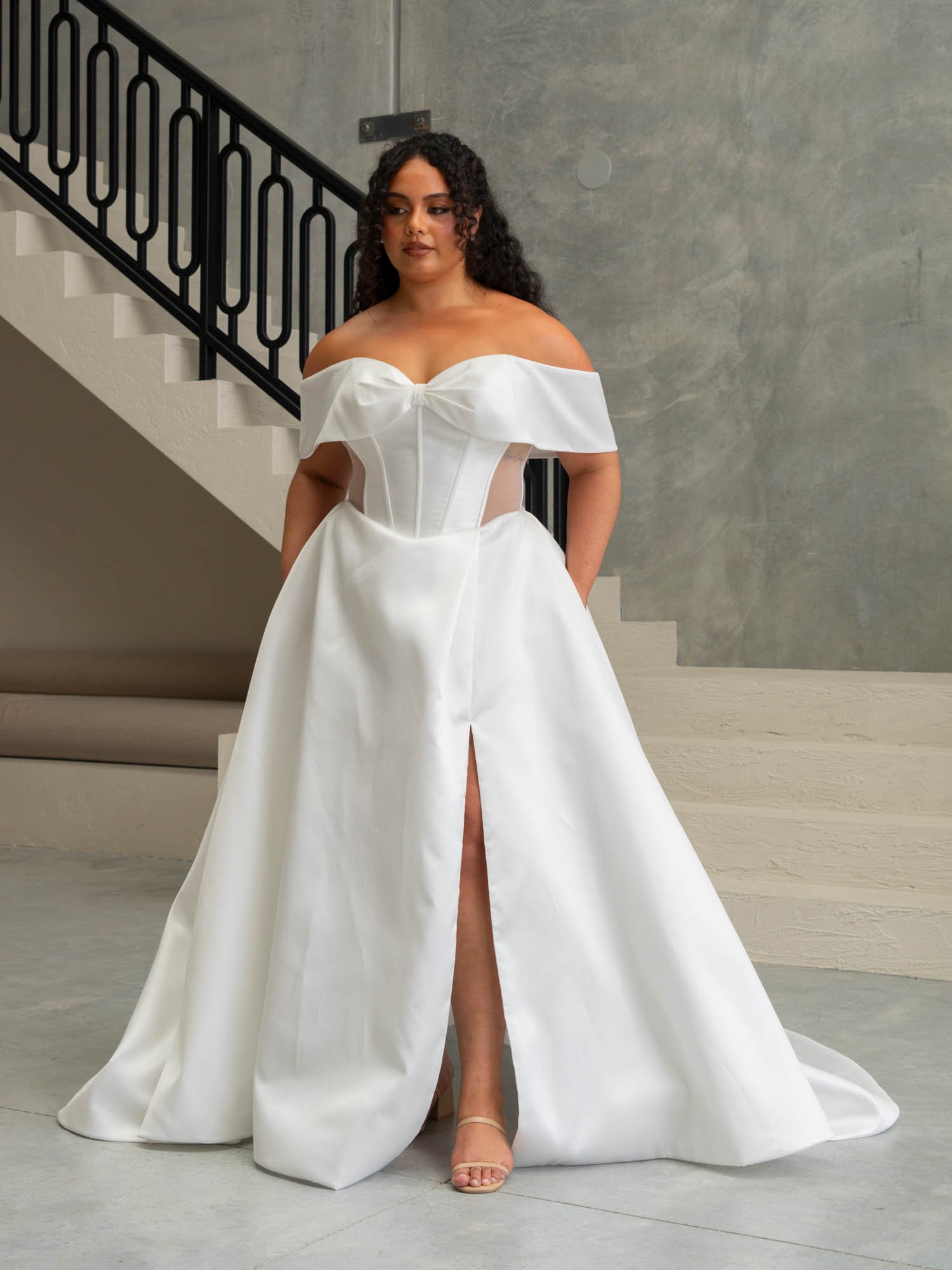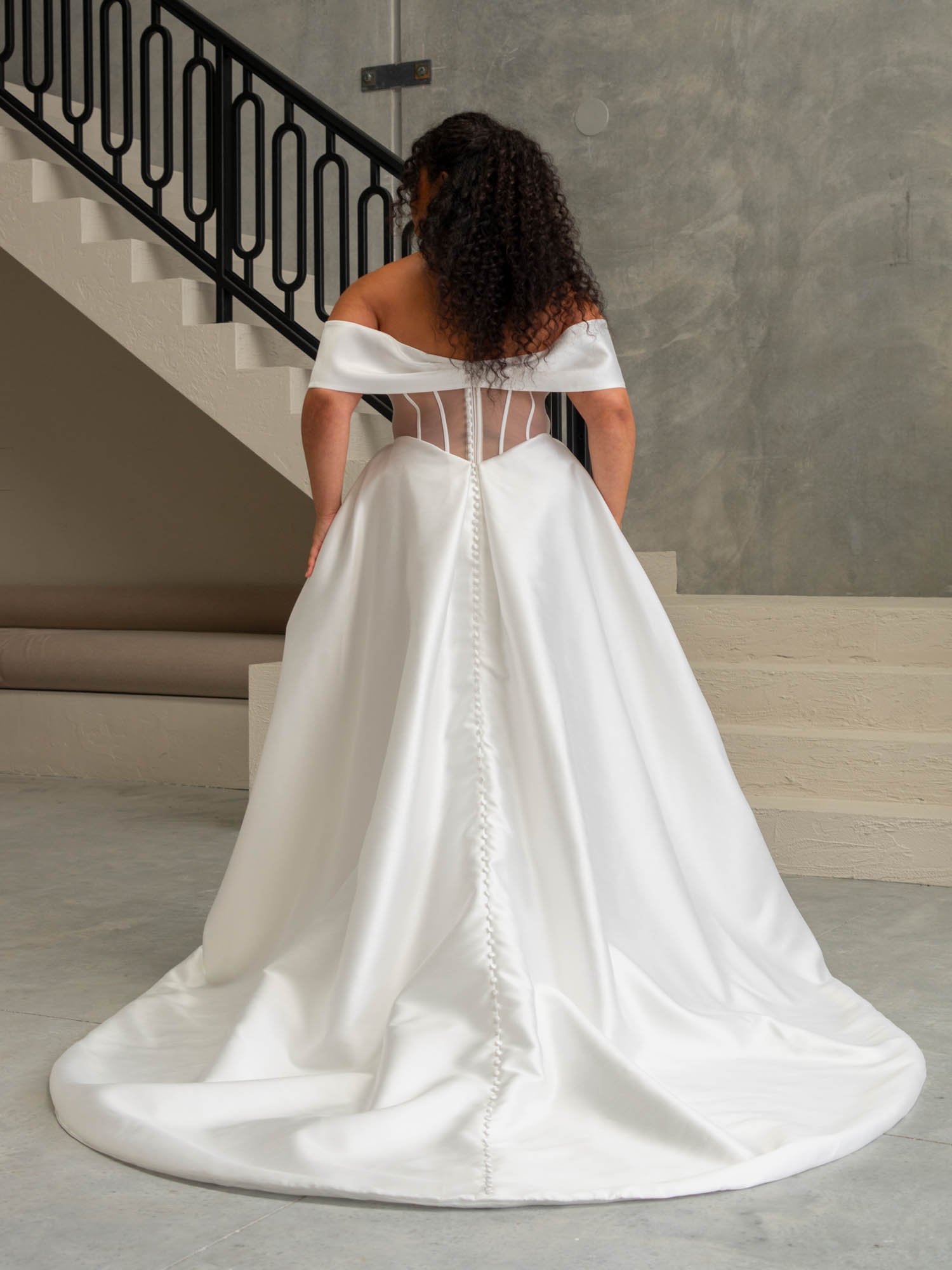 Effie from our Noir collection is a show-stopping statement gown for brides seeking drama and a modern twist. Crafted in lightweight ivory Shantung, it balances boldness with elegance. The reimagined sweetheart neckline features a pleated off-the-shoulder cuff for a bow-like effect. A corset bodice with boning highlights a modern V-shaped Basque waist and side panels for subtle allure. The voluminous A-line skirt includes a flat front and pockets. At the back, a bodice flows into a princess skirt and train, finished with a row of buttons from bodice to to hem.