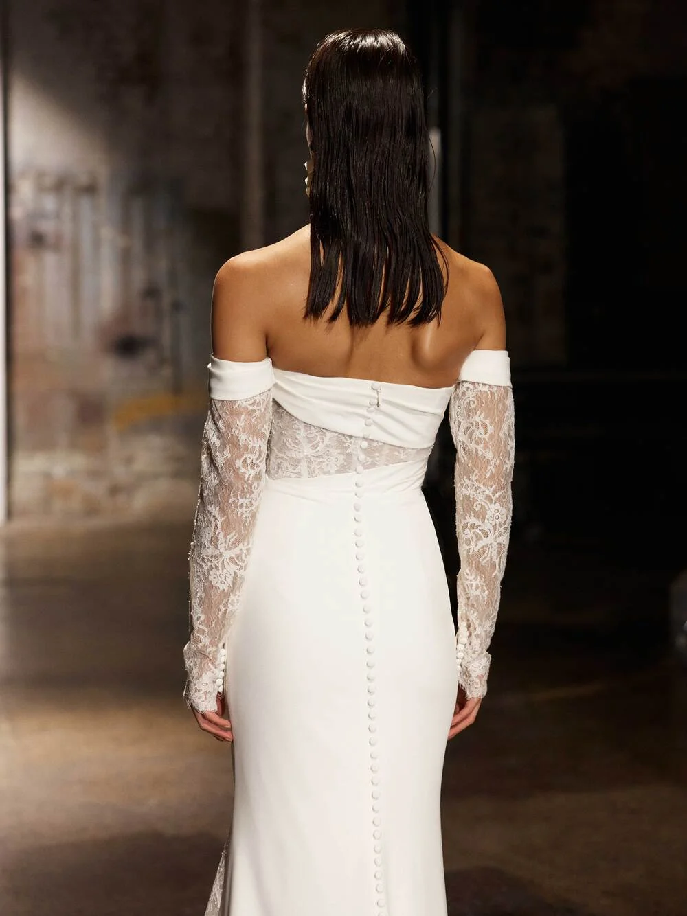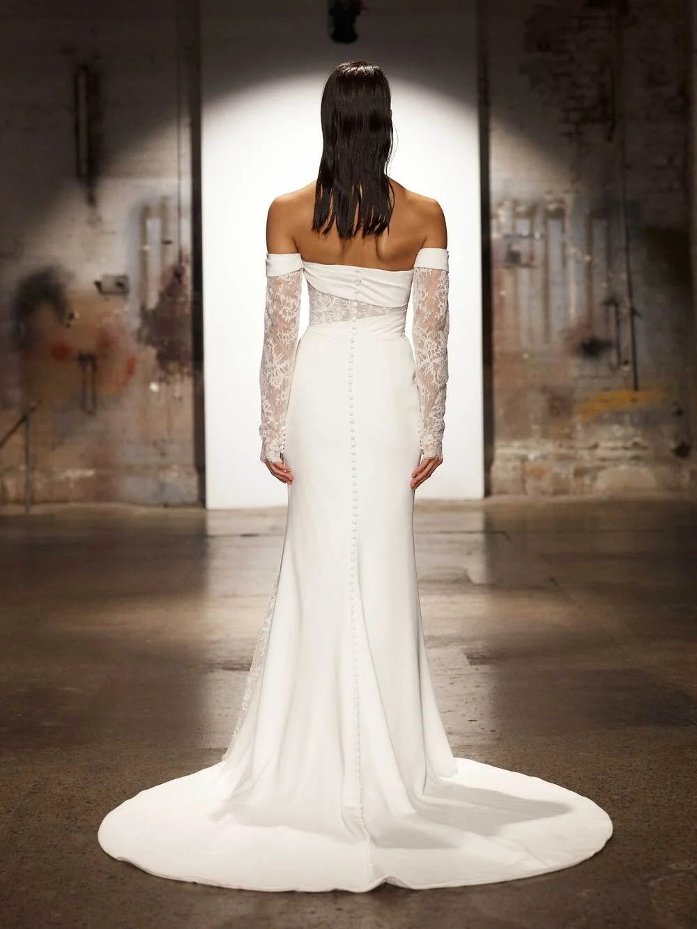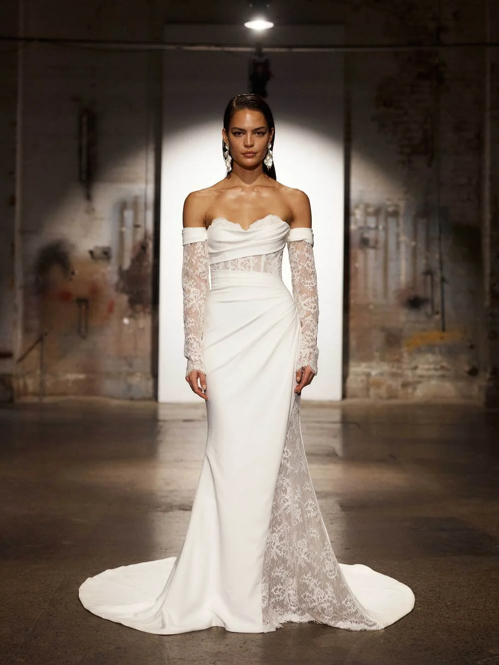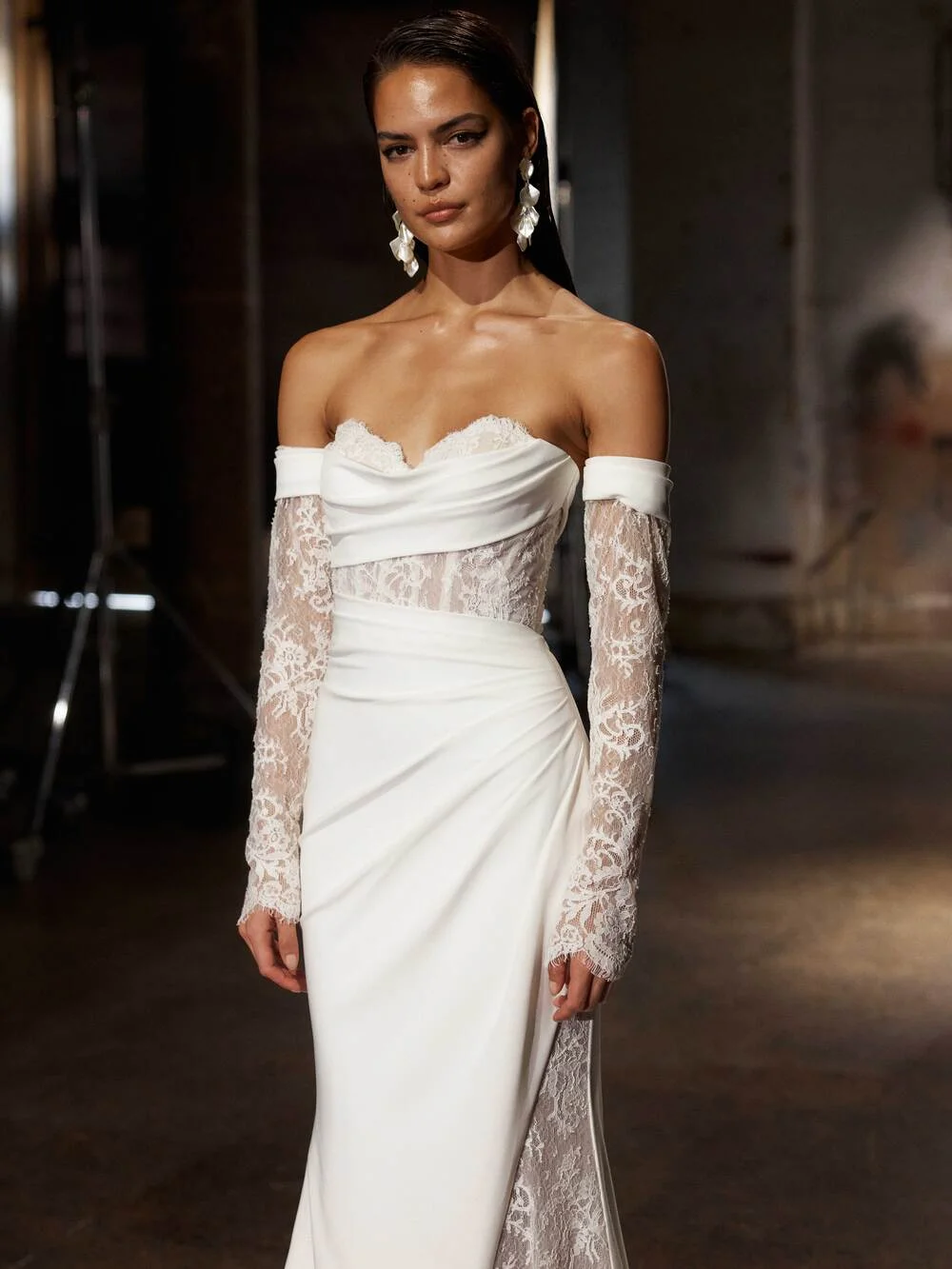 The Gray wedding gown by Evie Young combines contemporary cool with a fit-and-flare silhouette and lace details. It features a strapless sweetheart neckline with asymmetrical pleating over a Chantilly lace corset bodice, detachable long sleeves, and a slim skirt with diagonal micro pleats and a lace side godet. The back has buttons flowing from the bodice to the mermaid train. A matching Chantilly lace veil completes the look.