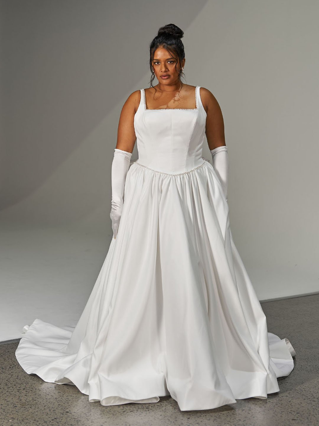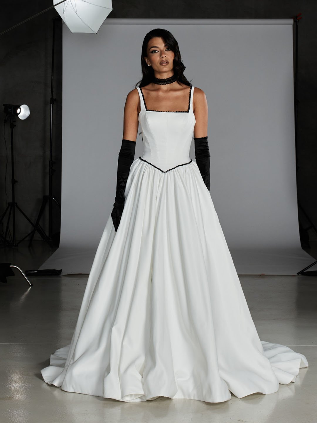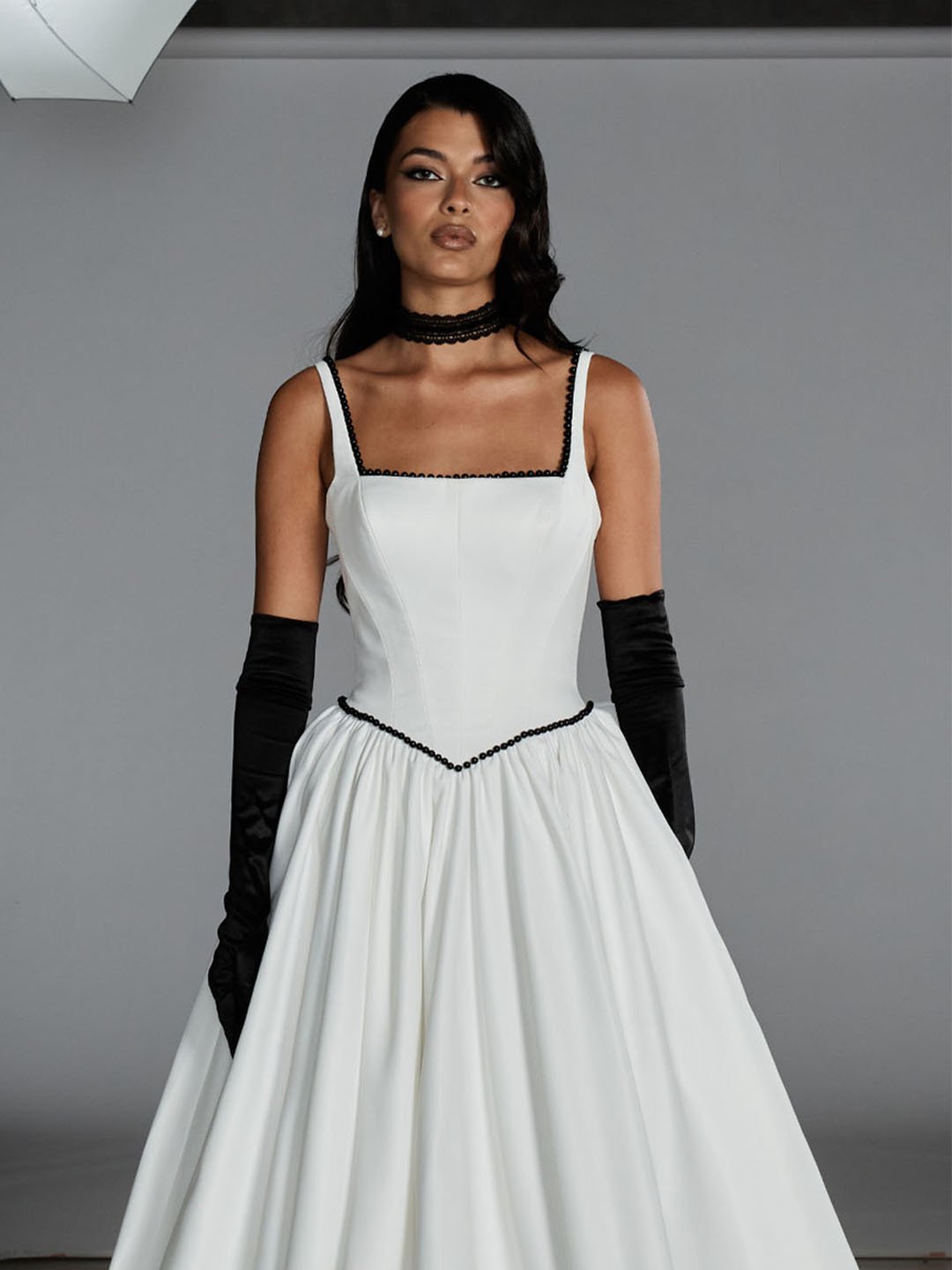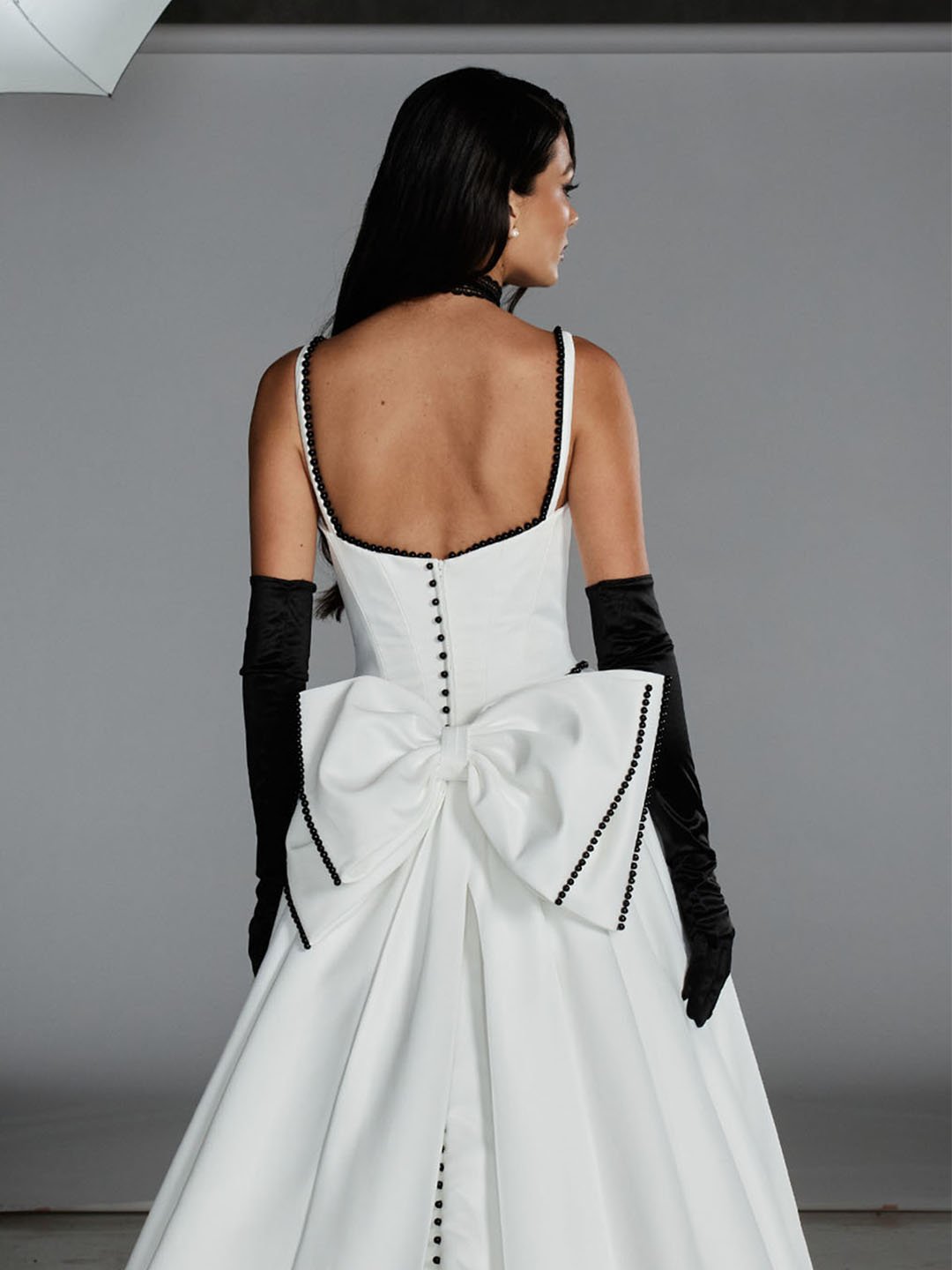 The Hayworth gown exudes Old Hollywood glamour with a modern square neckline, strong-boned bodice, and sharp Basque waist edged in black beads. A full A-line skirt adds volume, while a dramatic beaded bow and trailing black buttons complete the look. Personalise with gloves, collars, or veils for starlet-worthy style.
