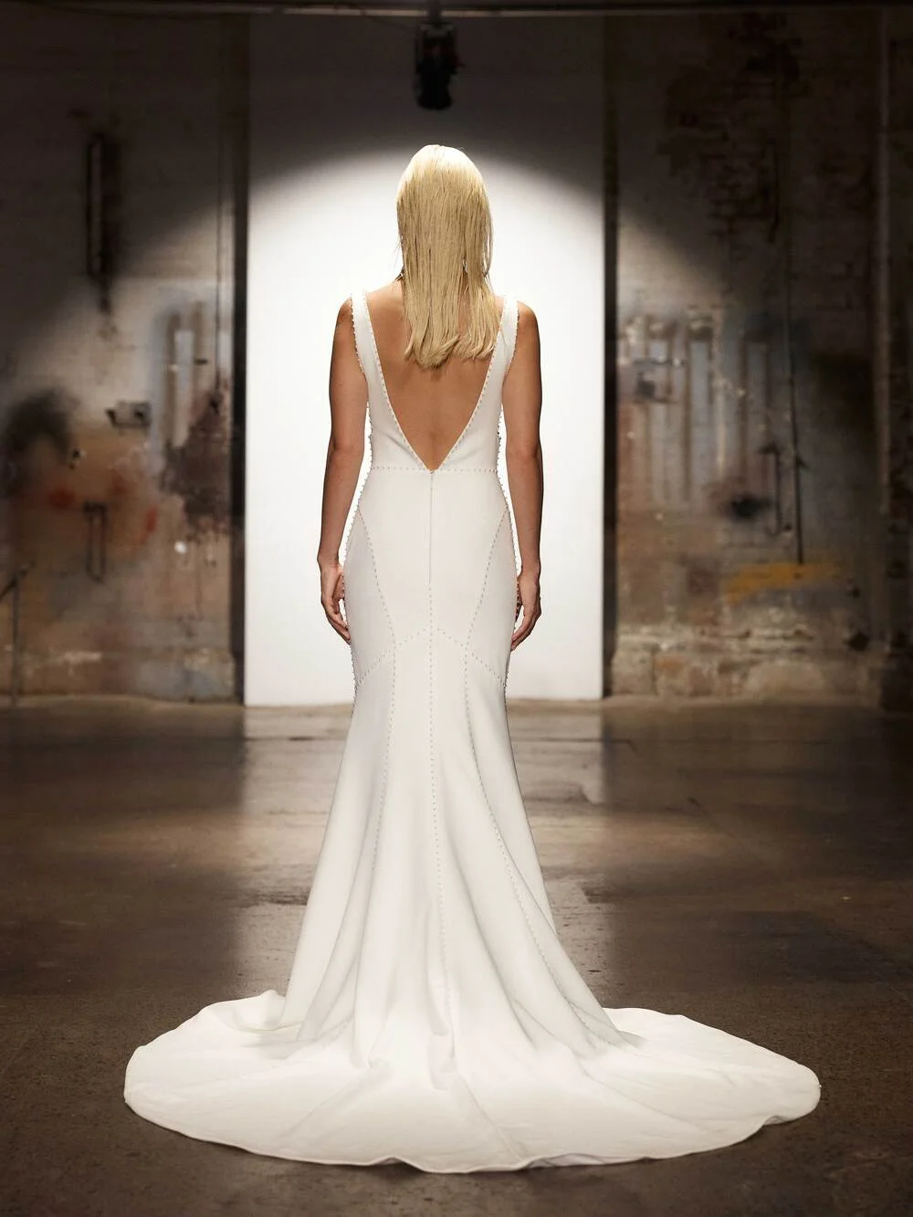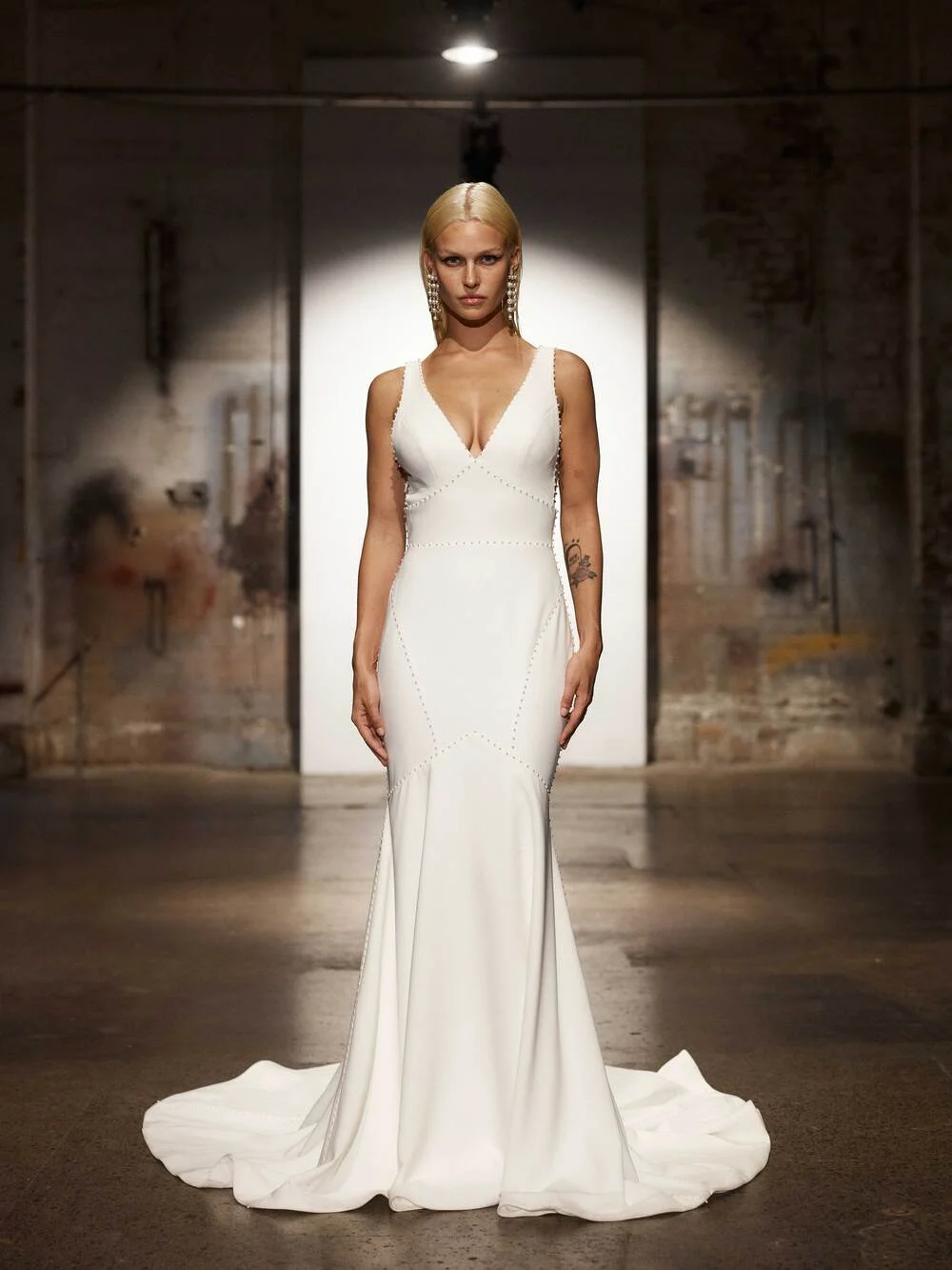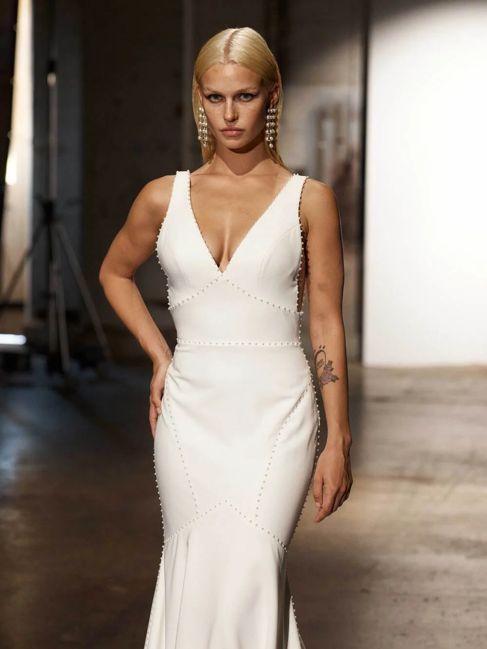 The Joni wedding gown from Evie Young's Noir collection is cool and feminine. Made of light ivory crepe, it features a fit-and-flare silhouette with pearl trim. The V-neck bodice has straps and illusion tulle side insets. The pearl-trimmed waistband creates a snatched waist look. The skirt shapes curves into an hourglass mermaid silhouette with a deep V back and train. Joni's clean aesthetic and pearl details make it a modern masterpiece. Customizable with corset boning for support.