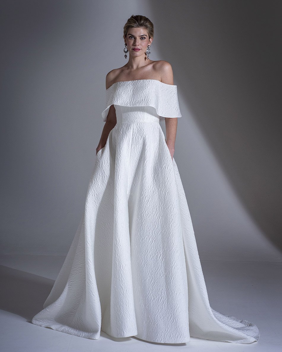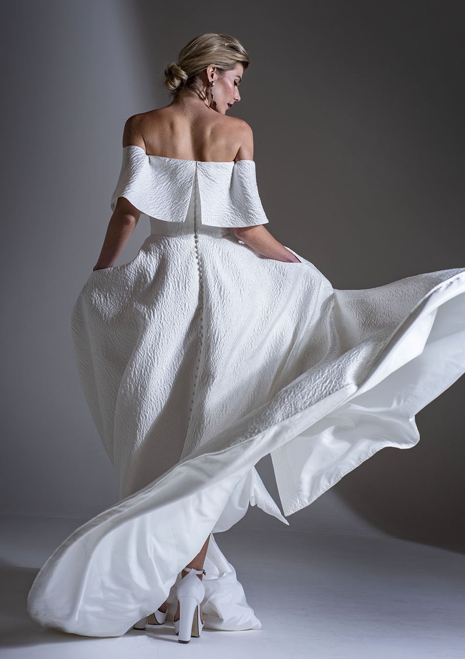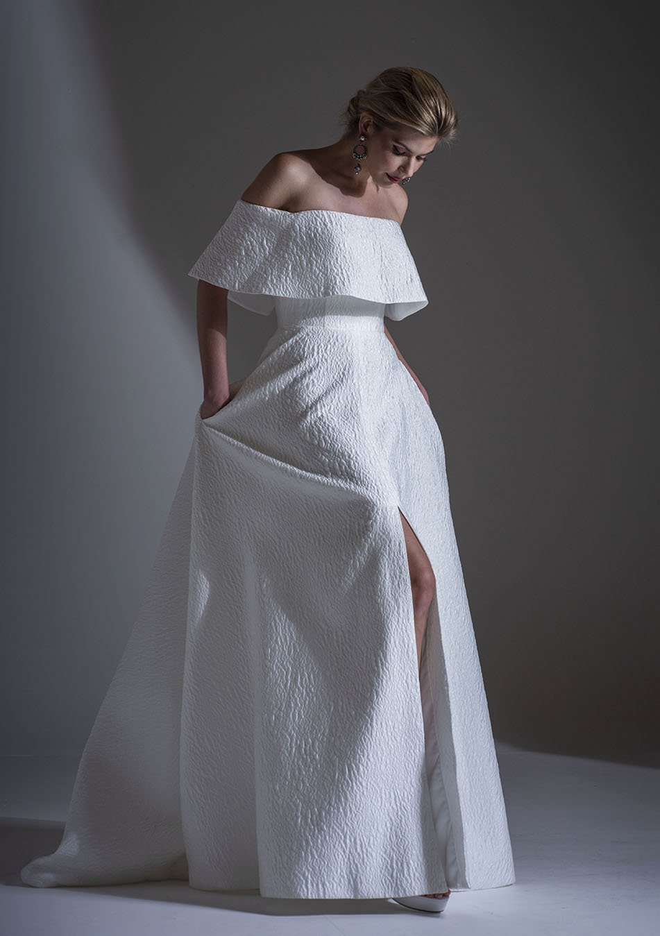 Cloque Contemporary dress with wide collar neckline. Split front A’ line skirt.