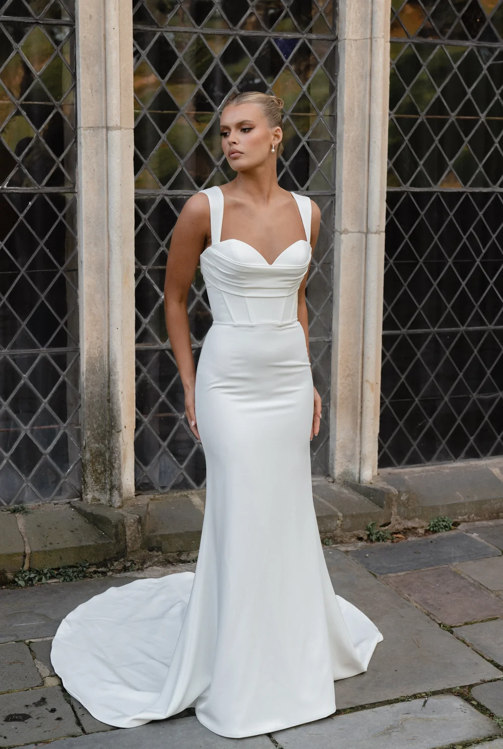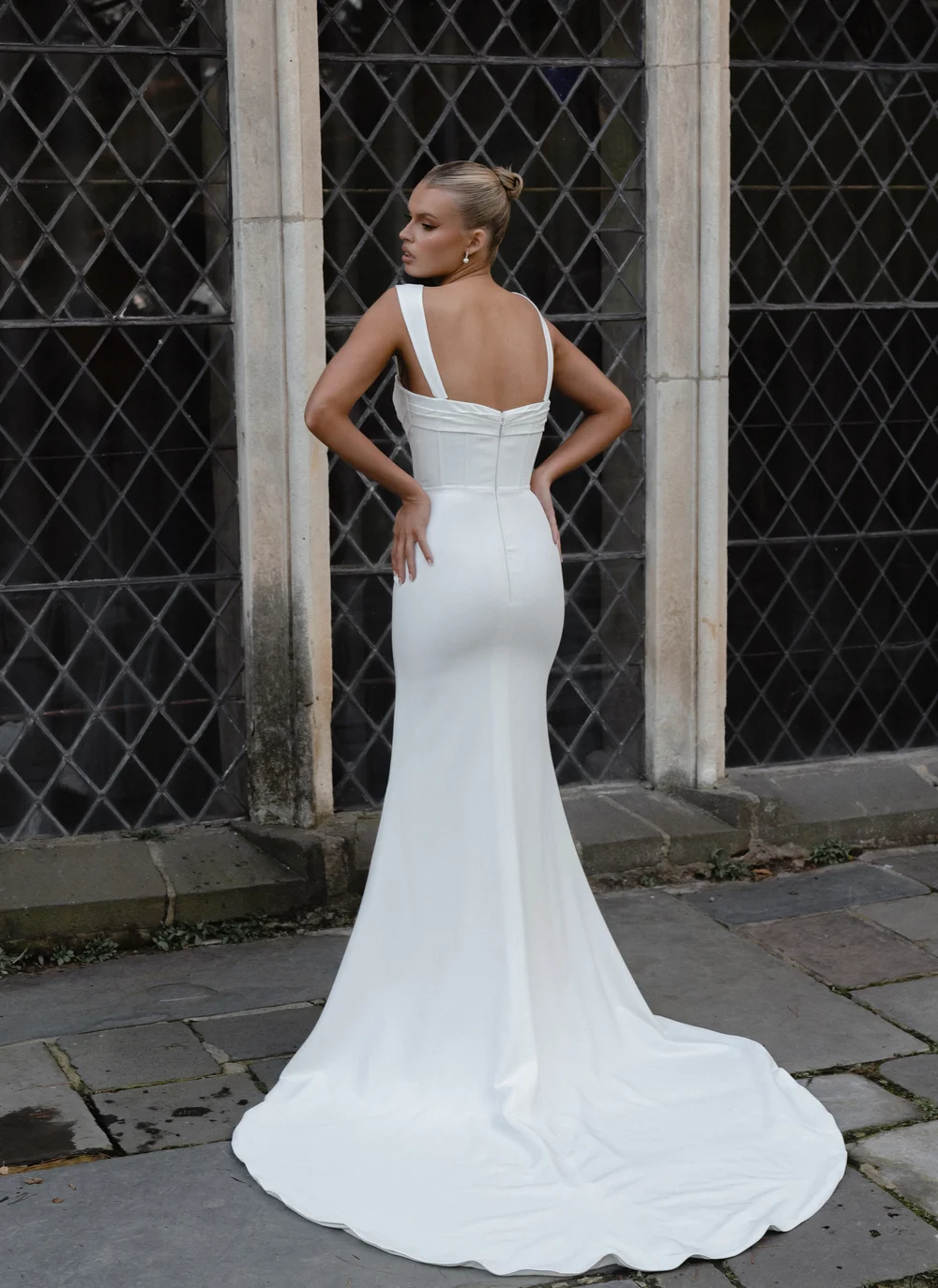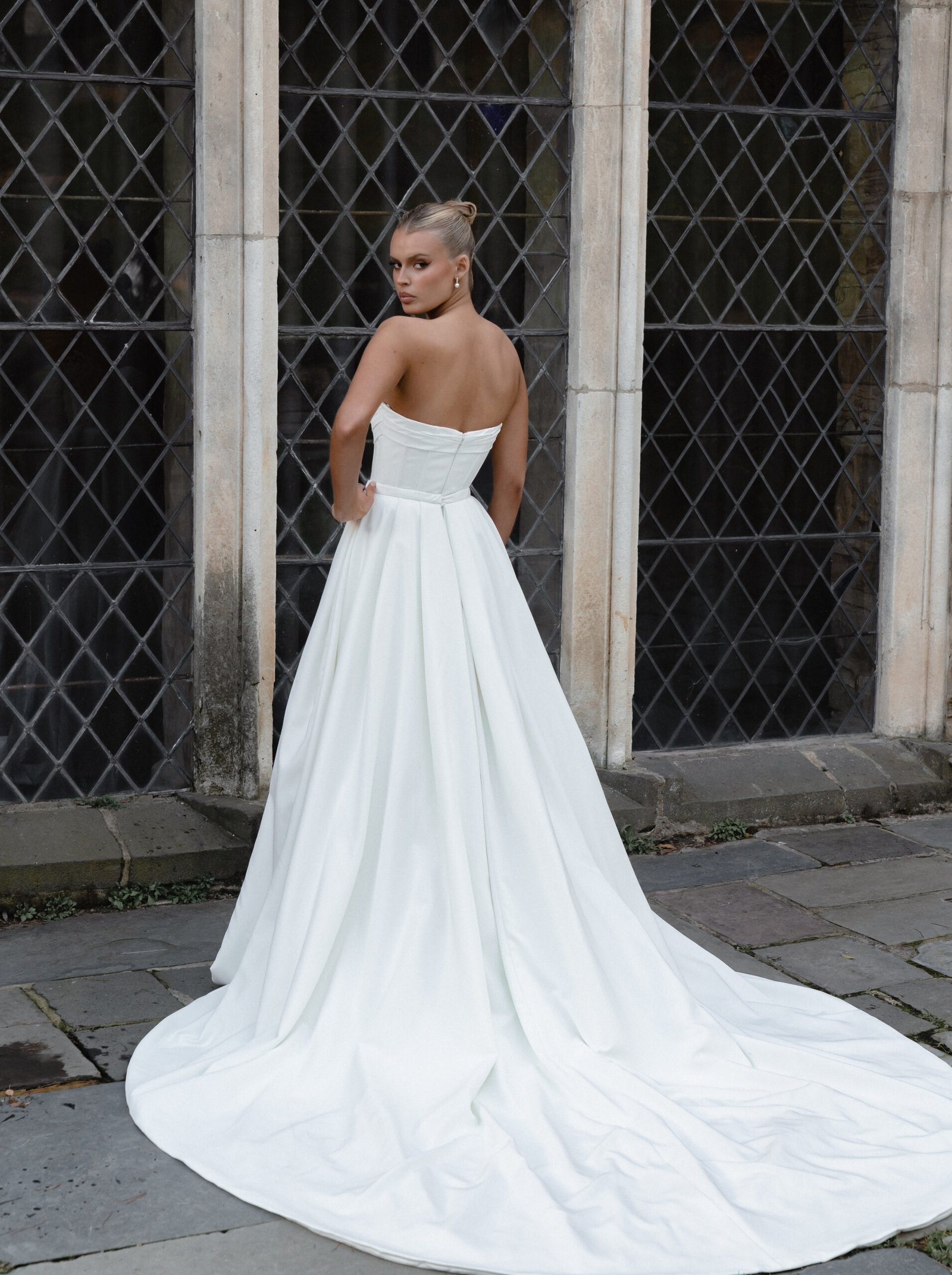 MASEN is modern elegance at its finest. Crafted from light crepe with jersey lining, this gown features a confident strapless bodice with pleating and exposed boning detail. The slim fit and flare skirt promise a captivating silhouette, perfect for a red-carpet moment. Detachable tapered off-shoulder straps offer versatility, while a detachable circular pleated overskirt with a front opening adds dramatic flair. MASEN celebrates your unique love story with contemporary sophistication.