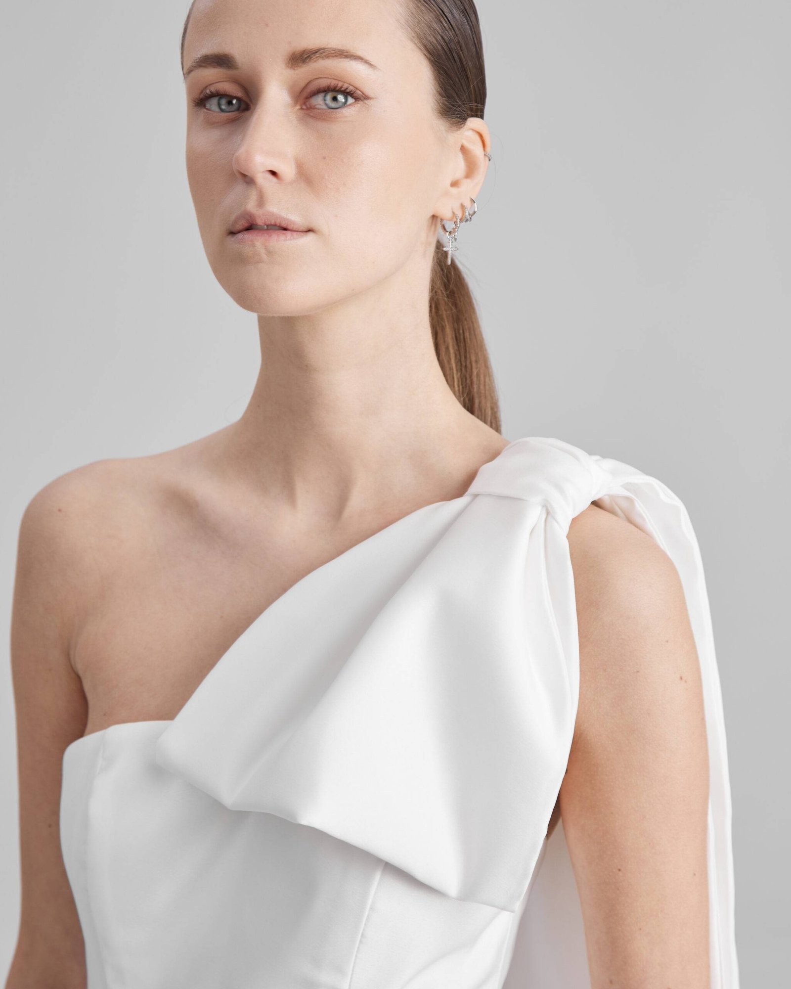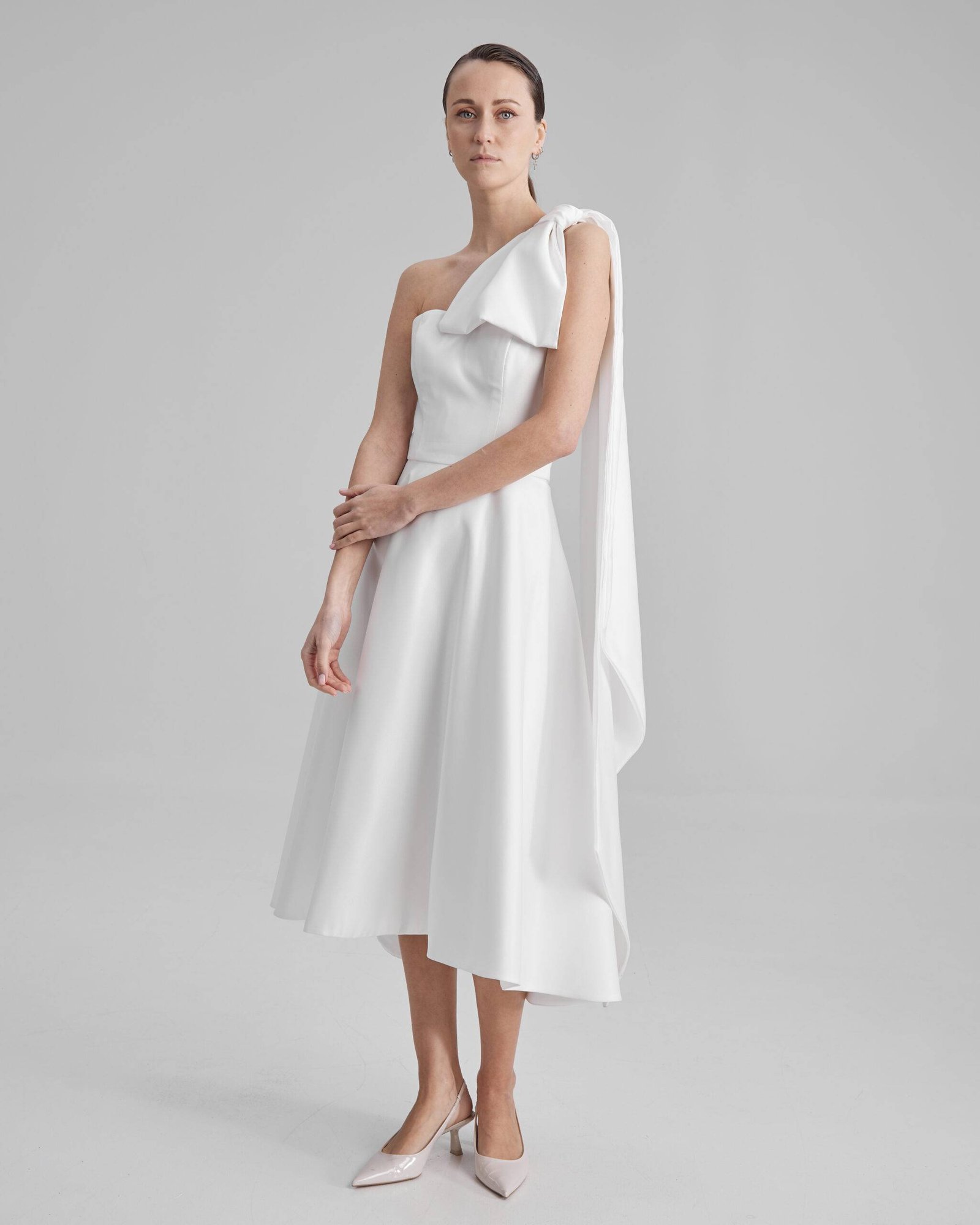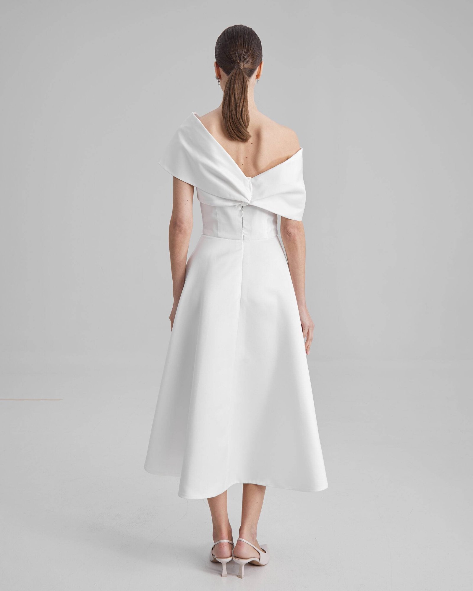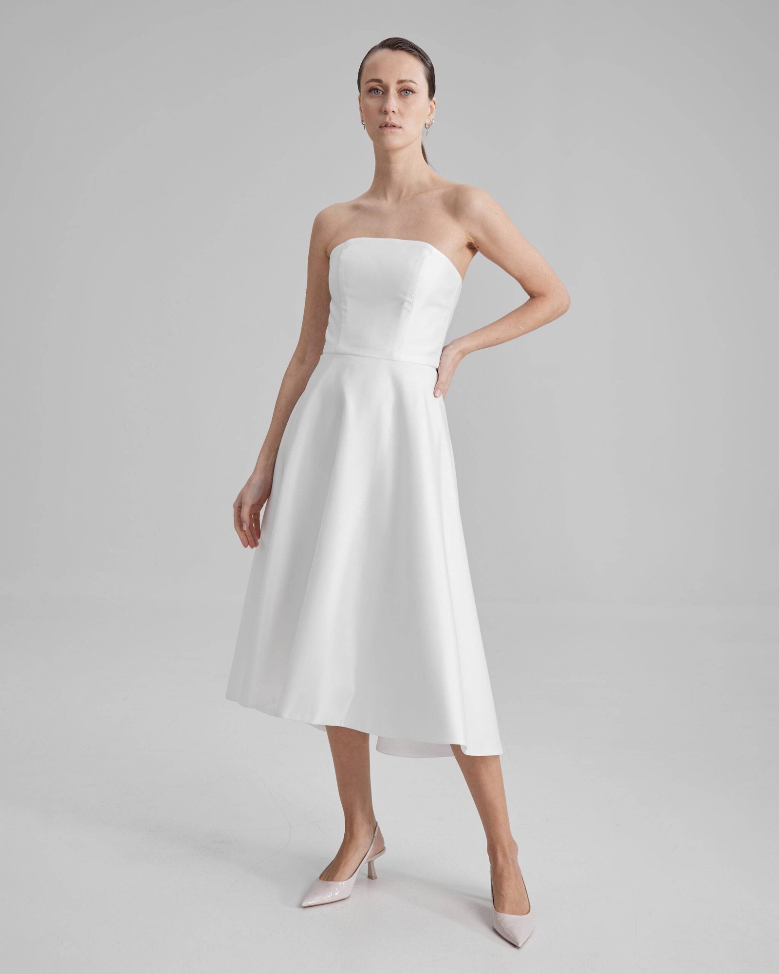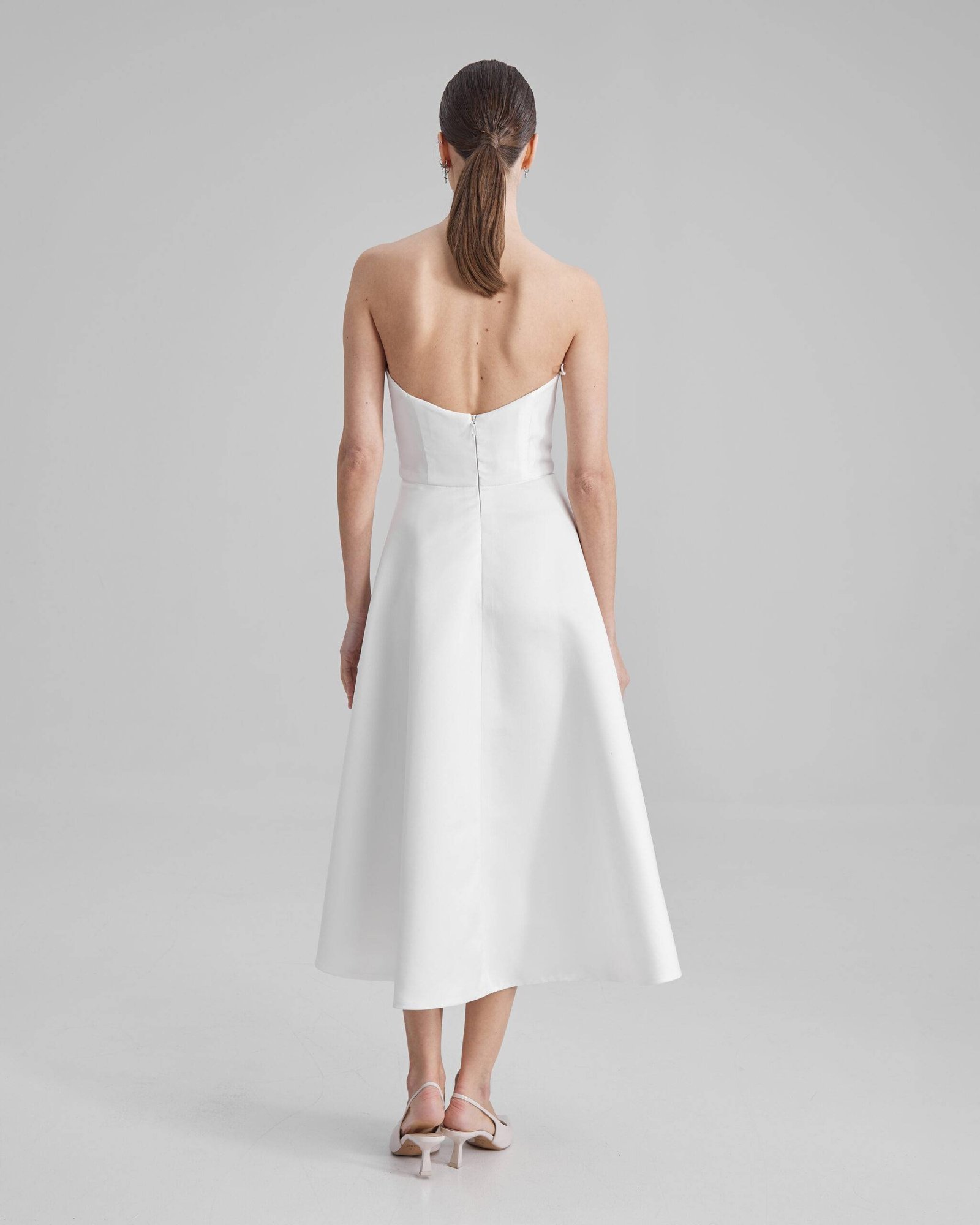 The A-line skirt of this midi dress adds feminine sophistication, flowing gracefully from the cinched waist. The Mikado fabric's clean lines and structured design enhance the refined, contemporary look. The strapless corset contours your figure, exuding confidence and grace. Ideal for chic cocktail parties or elegant weddings.