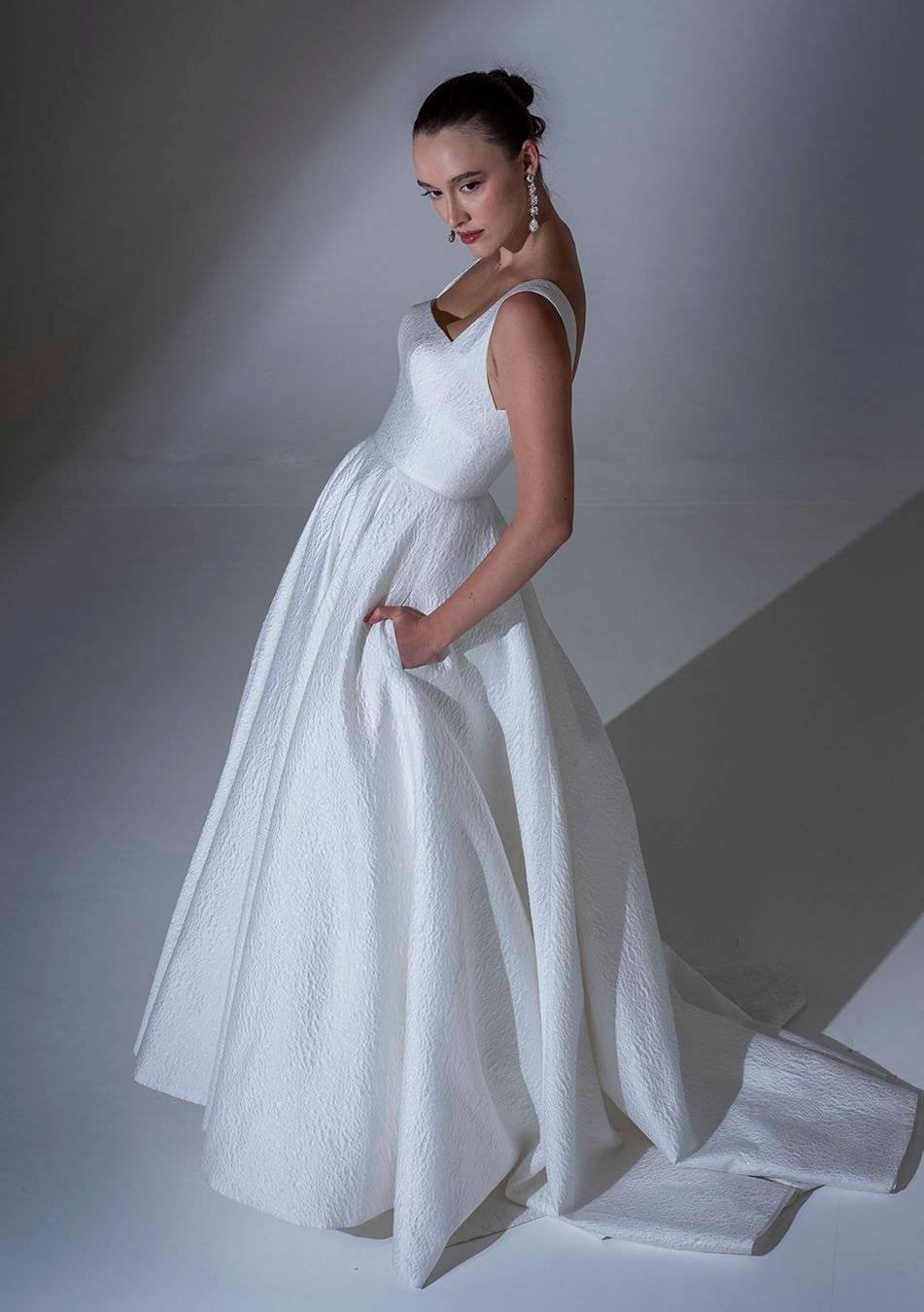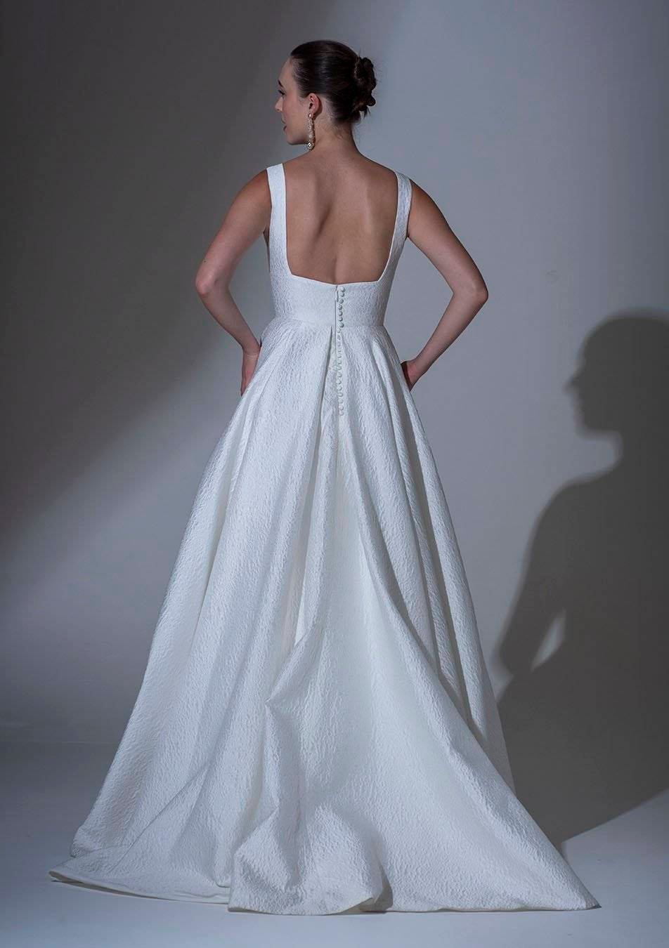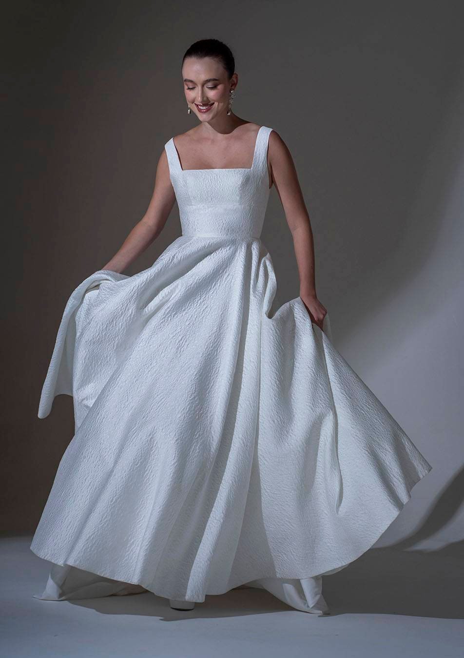 Contemporary dress in textured cloque fabric with fitted bodice, square neckline and full skirt with pockets.