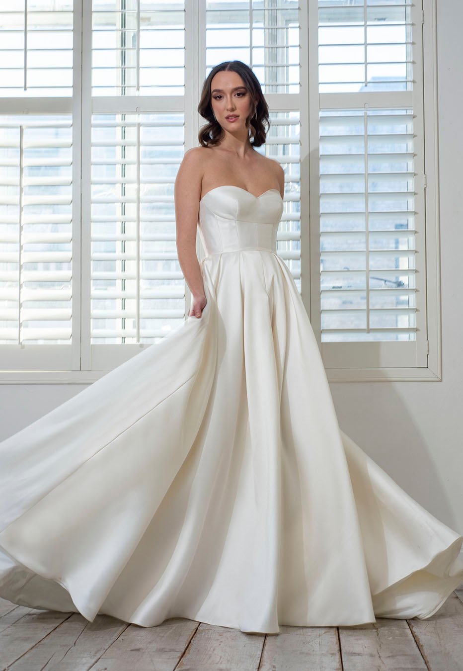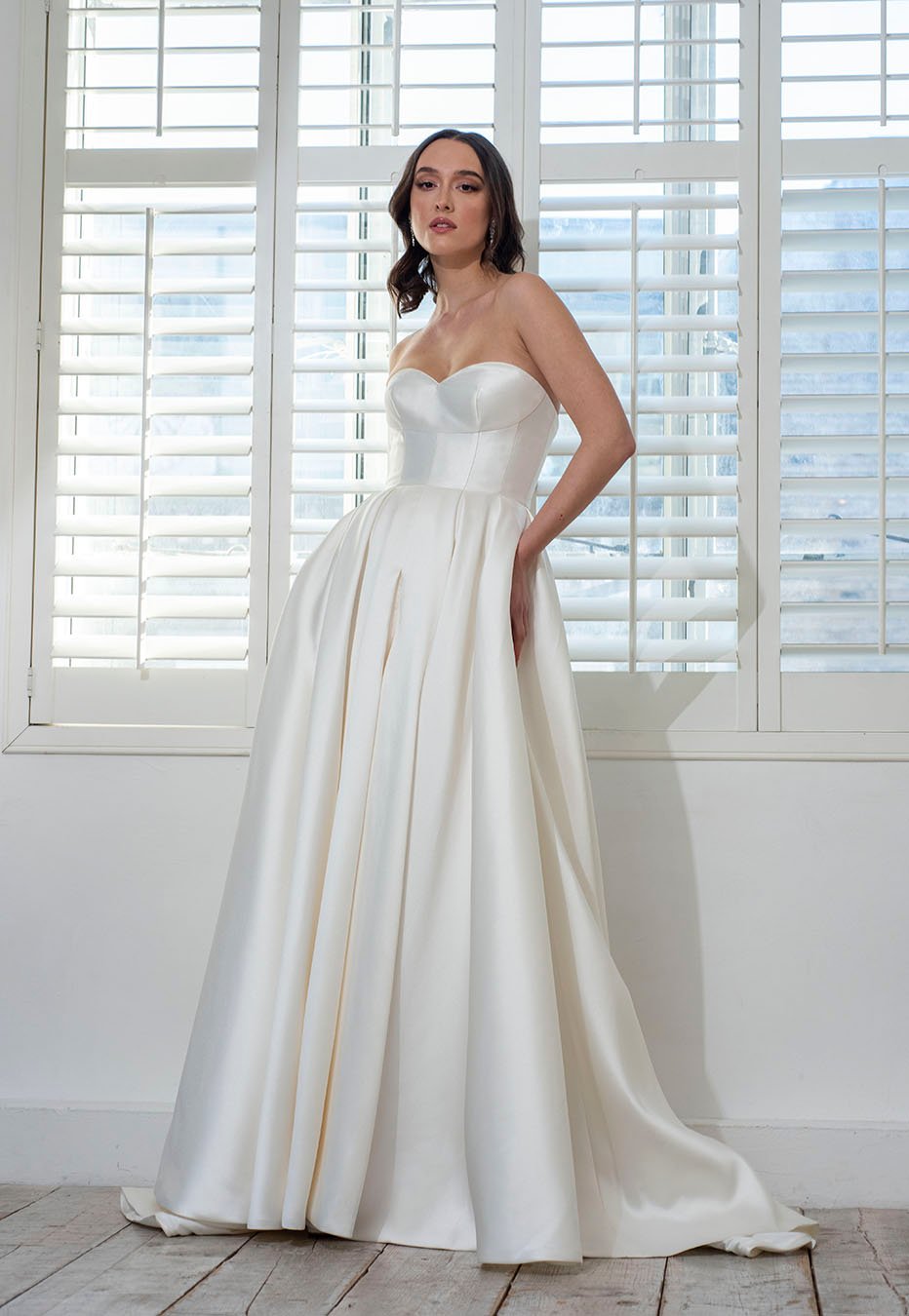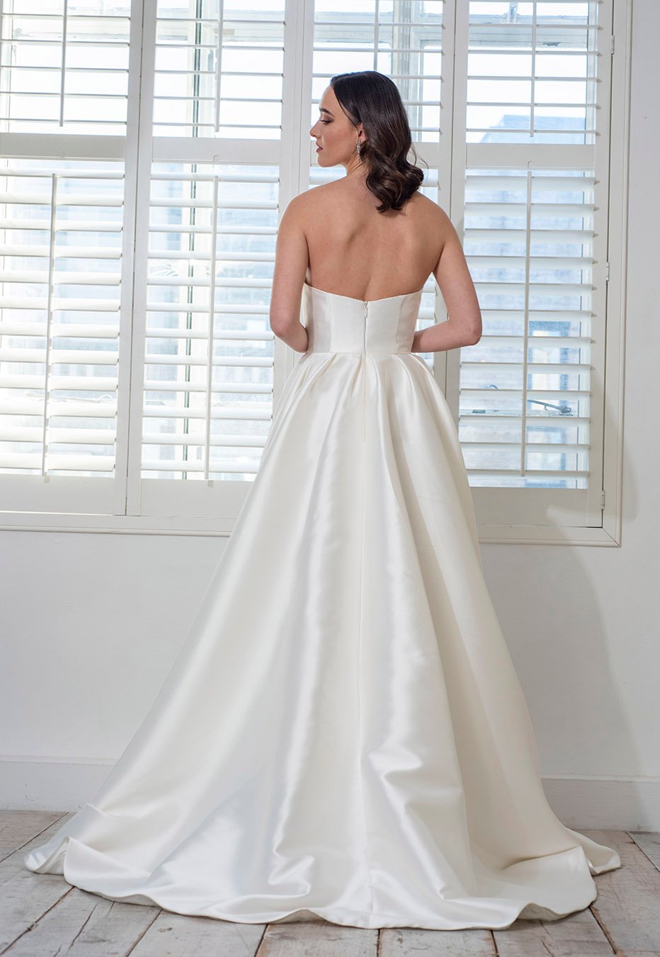 Mikado Contemporary dress with a fitted bodice and full split skirt with train.