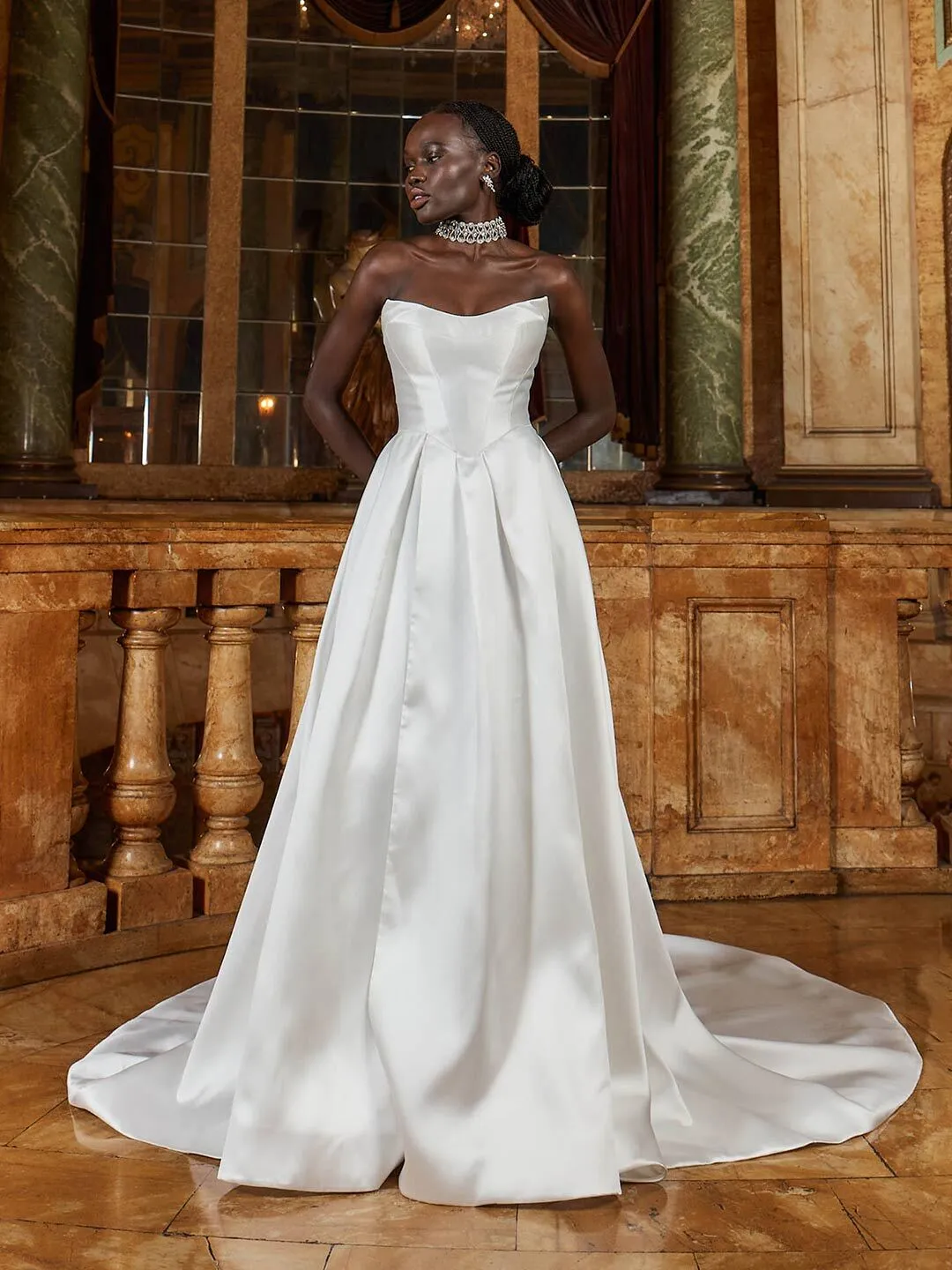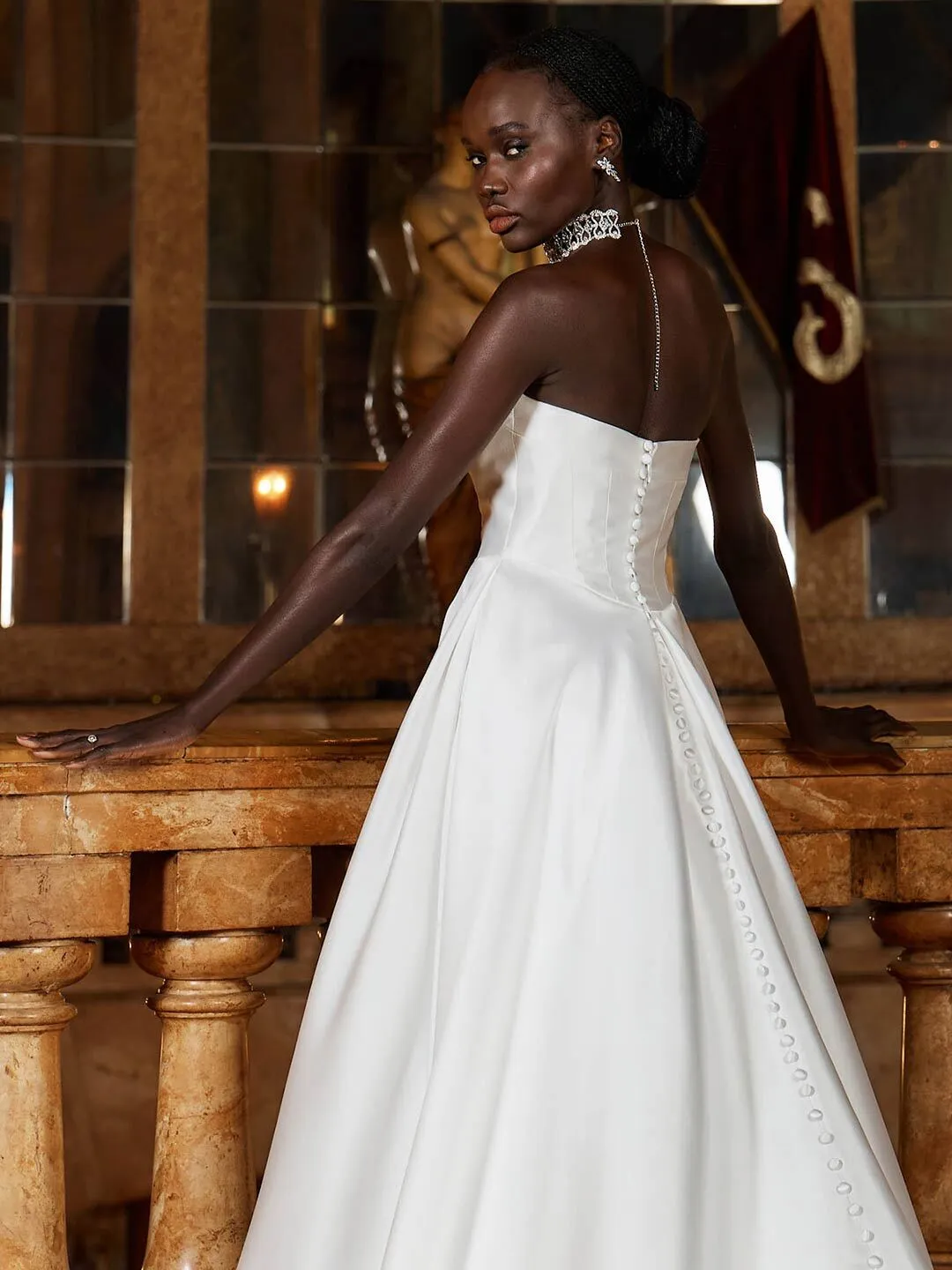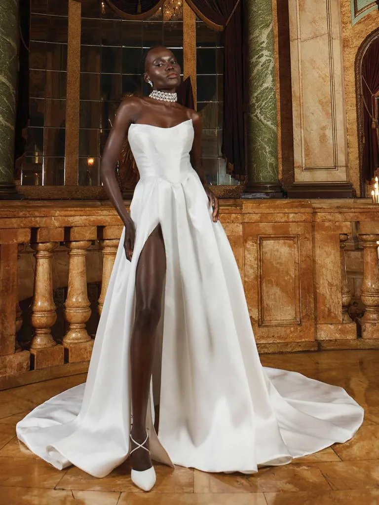 A customizable right-leg split adds lightness and a modern edge, while the corset back sits high for support and seamless elegance. Satin buttons trail down to a generous train, completing the look.