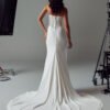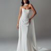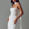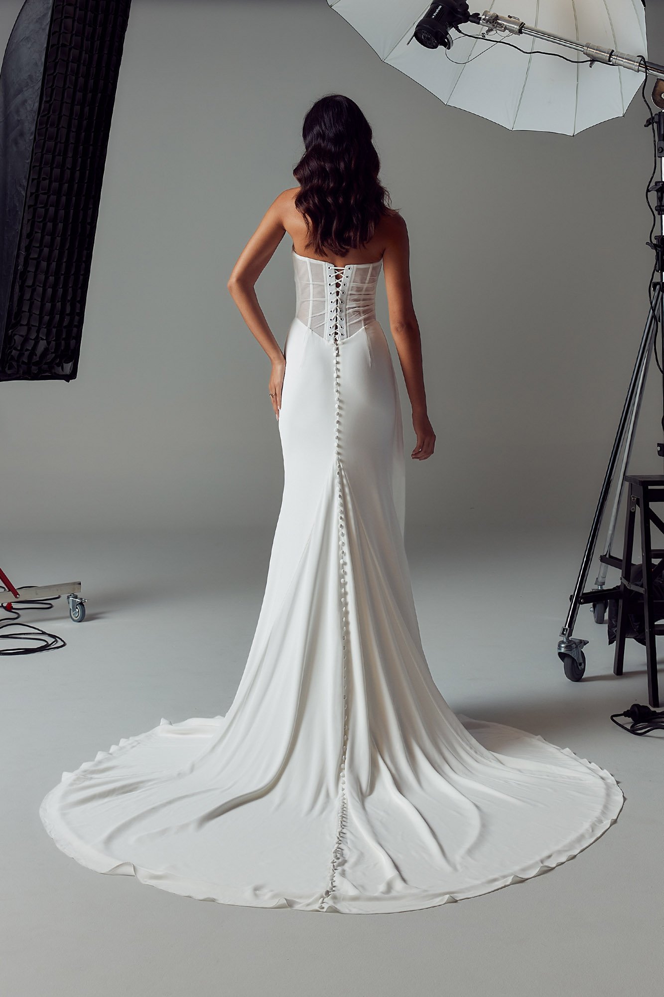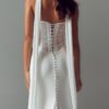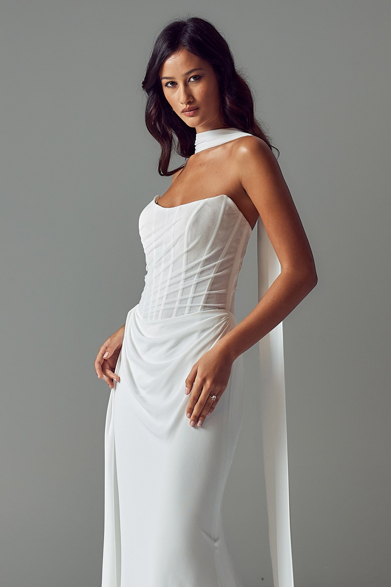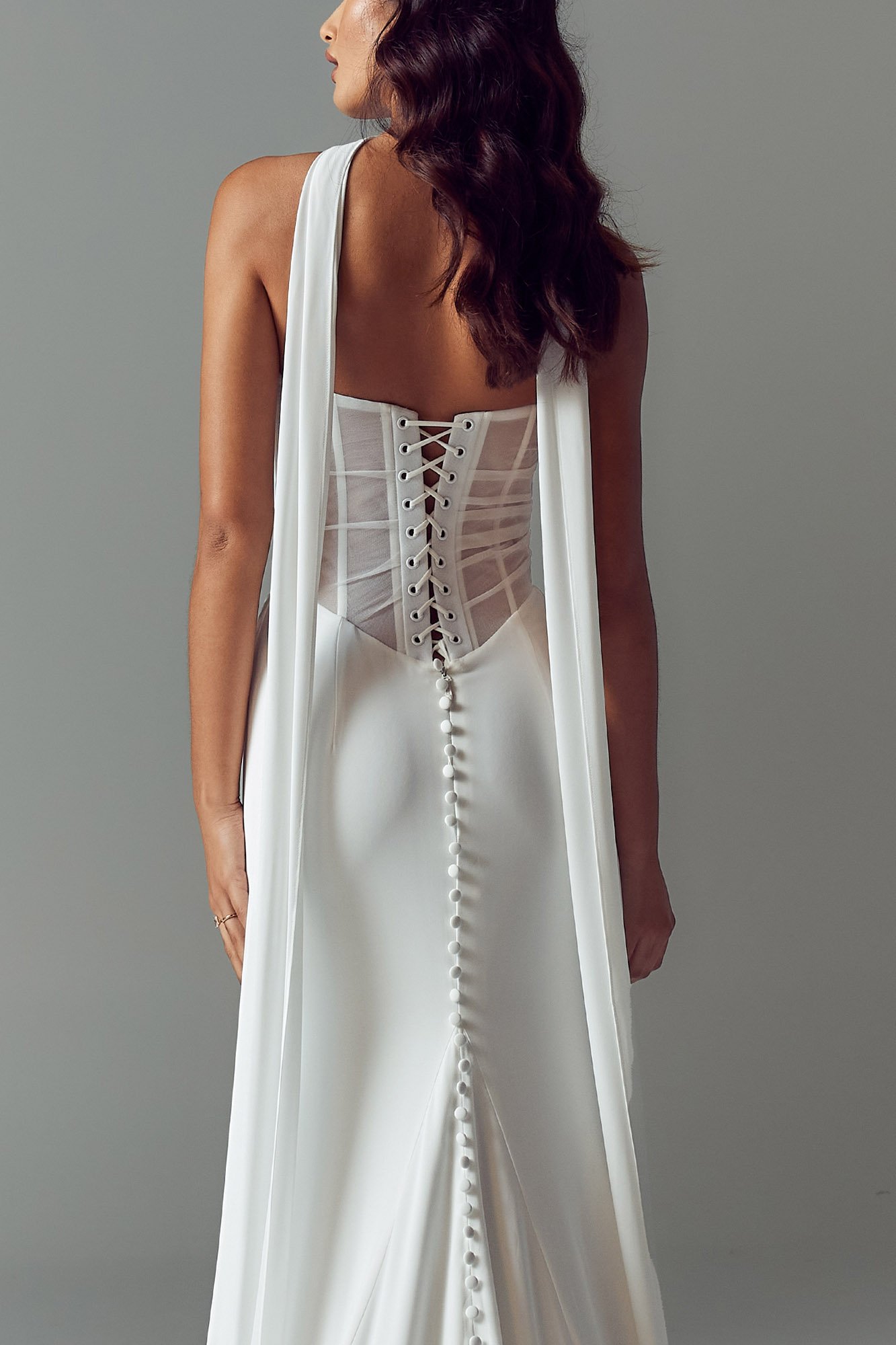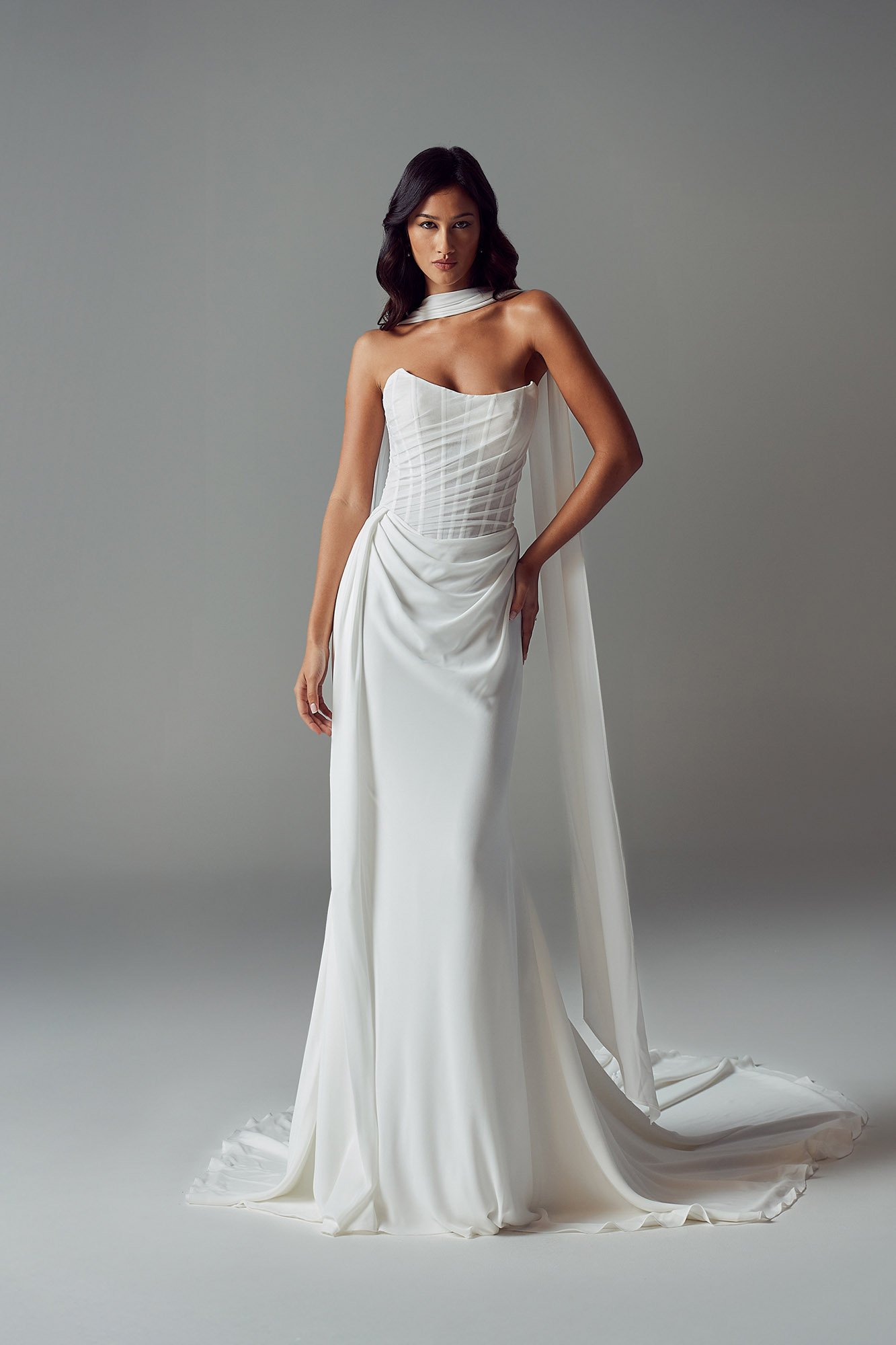 Designed for the minimalist, fashion-forward bride, the Valerie dress is effortlessly glamorous. Draped tulle and chiffon create a soft yet sexy silhouette, with a chic scoop neckline, illusion tulle, and exposed boning for modern shaping. The corset-style lace-up back adds a sensual touch, while the Basque waist and asymmetric side drape elongate the figure. Finished with a sleek chiffon skirt, vintage-inspired draping, and a vertical row of buttons along the train. Complete the look with the Valerie chiffon scarf for timeless elegance.