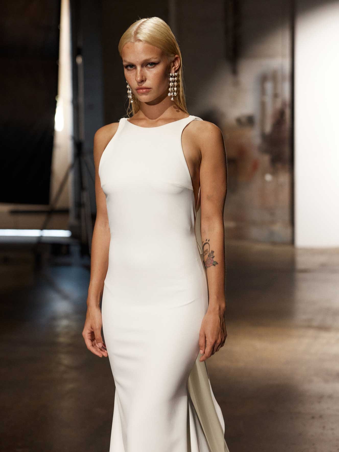 Made from light ivory crepe, it features a high neckline, illusion sides, and a seamless fit-and-flare silhouette.