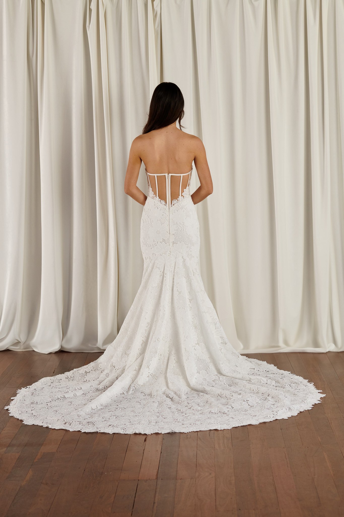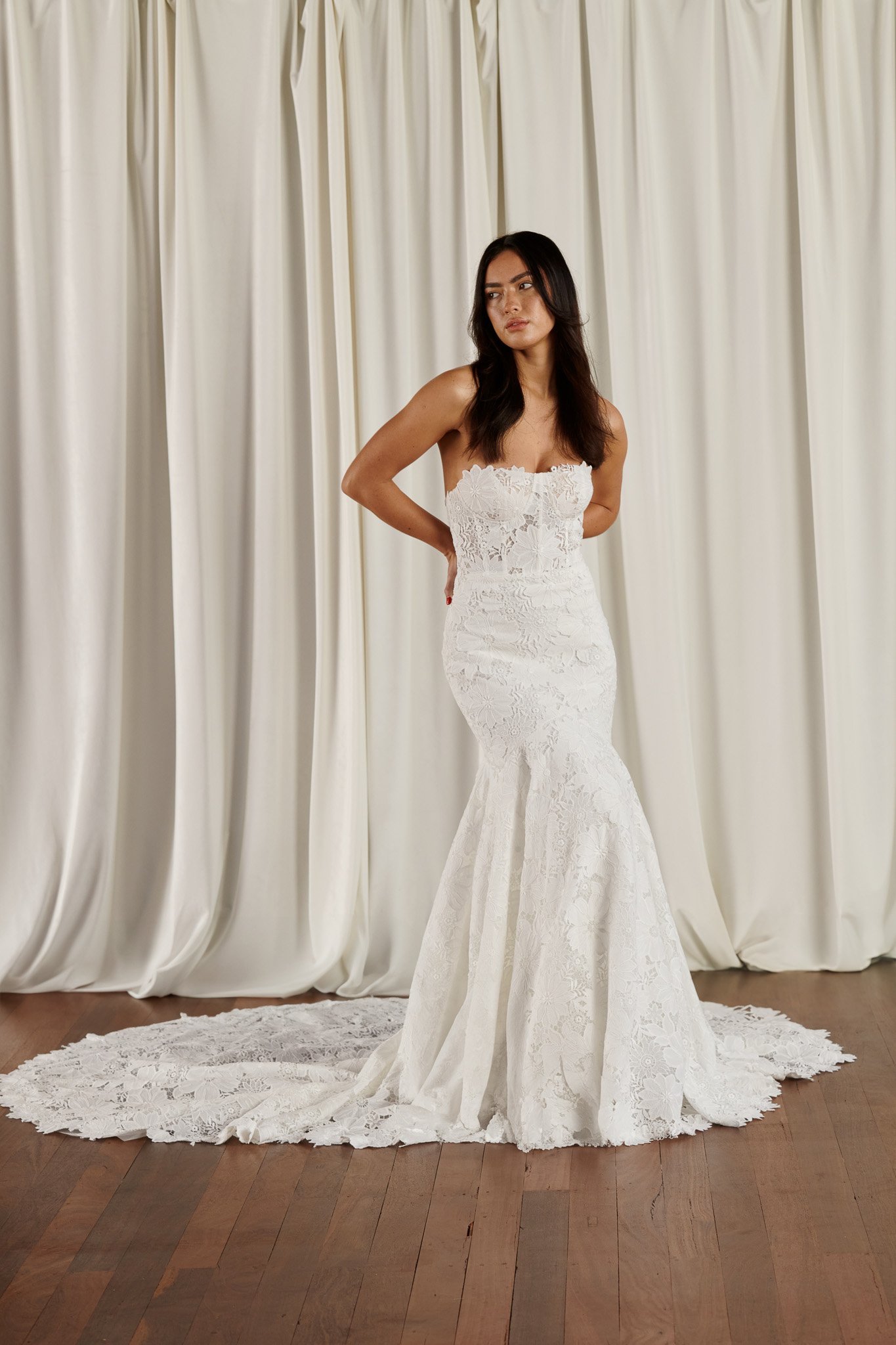 With intricate floral lace and a fit and flare skirt, this is a simple yet elevated boho gown