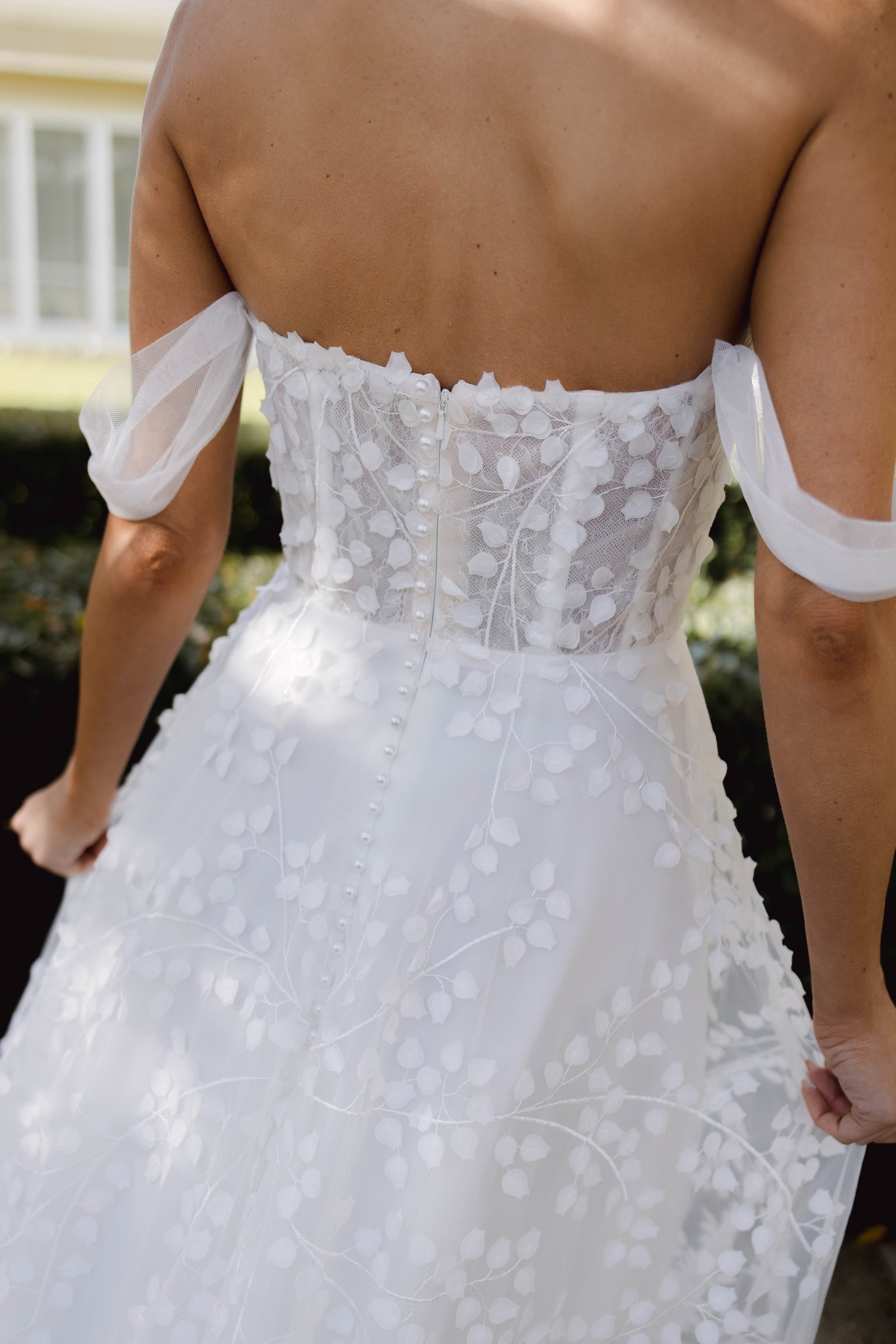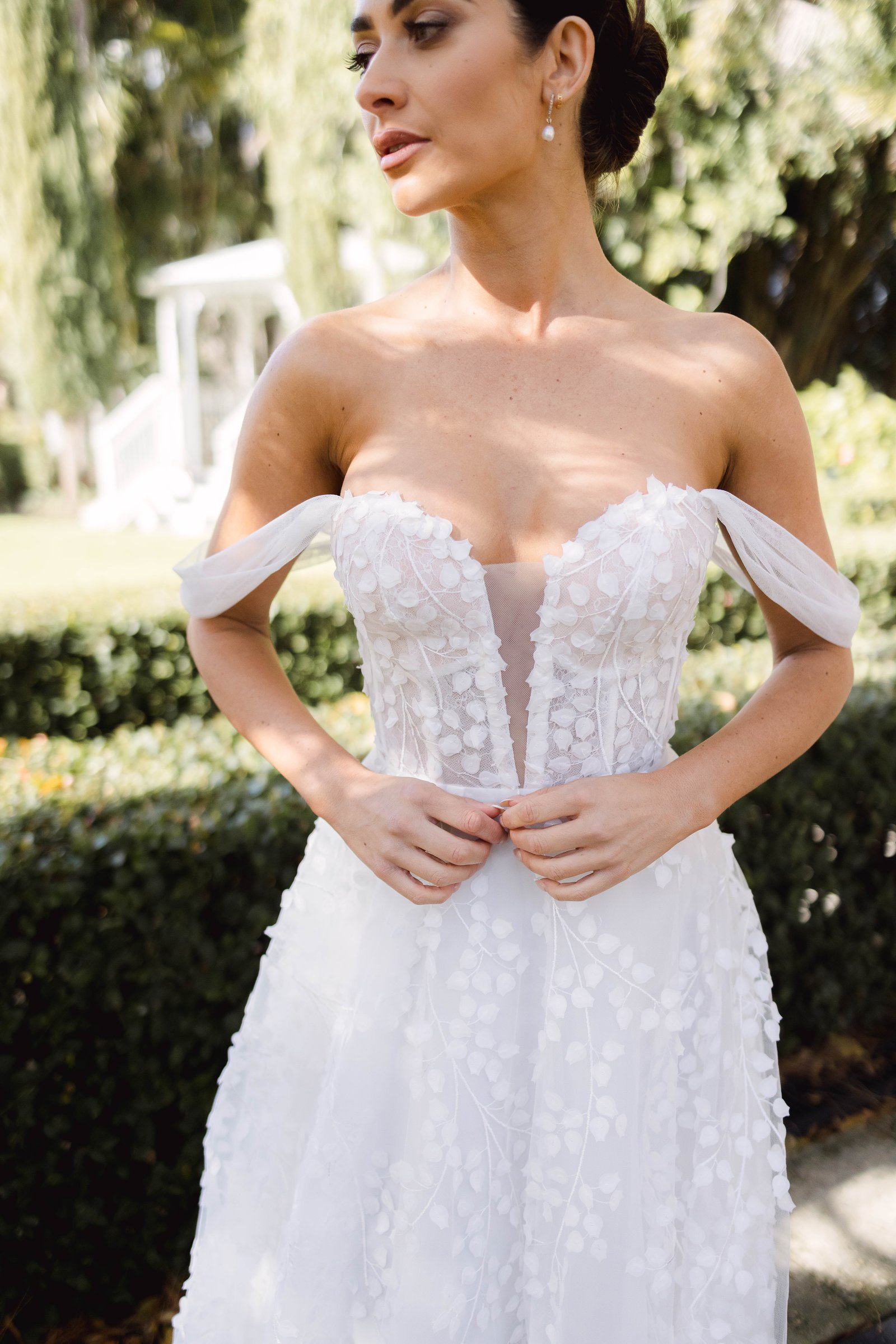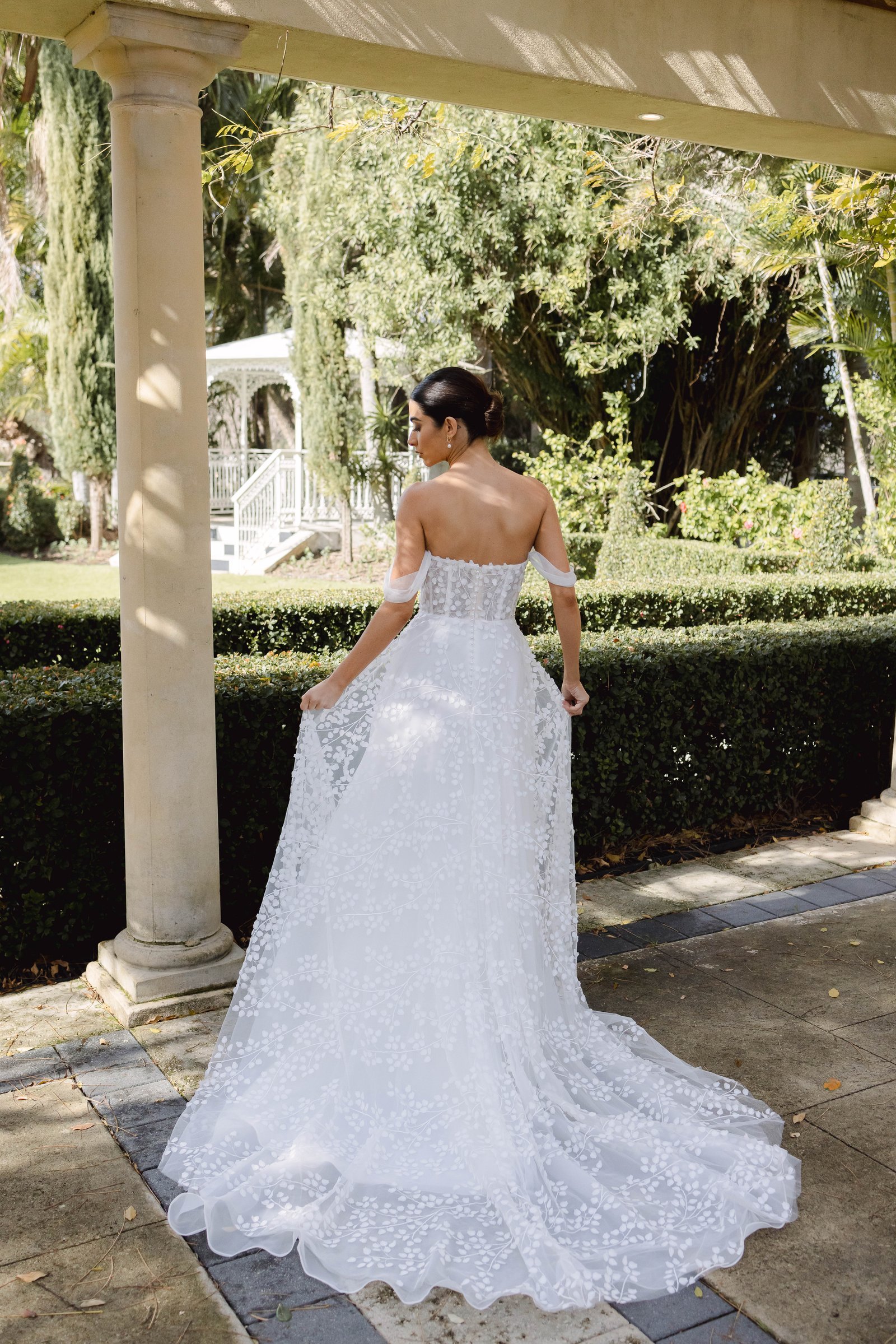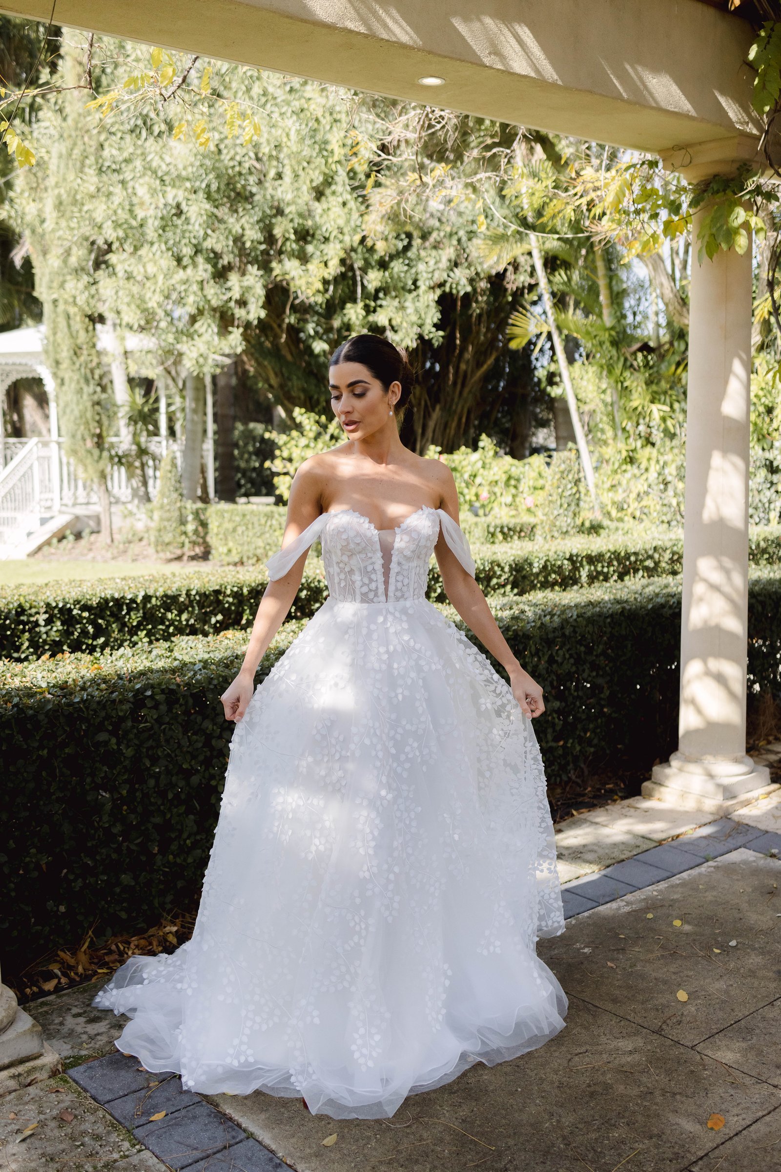 A beautiful princess a-line style gown featuring off shoulder straps and a sweetheart neckline.