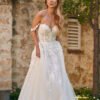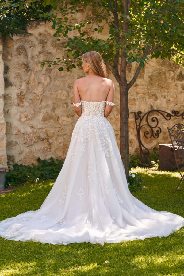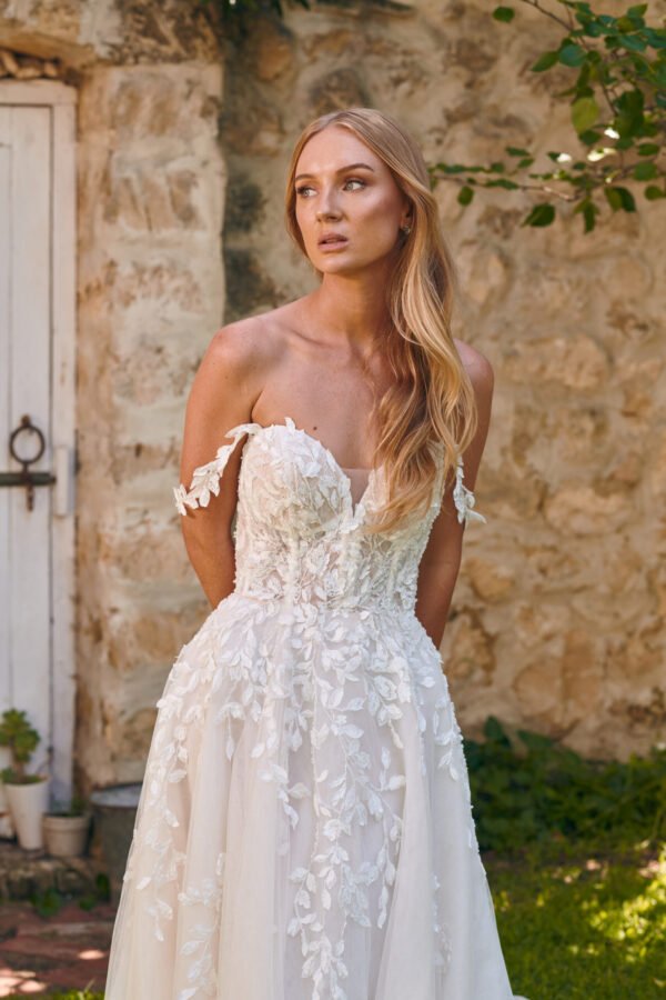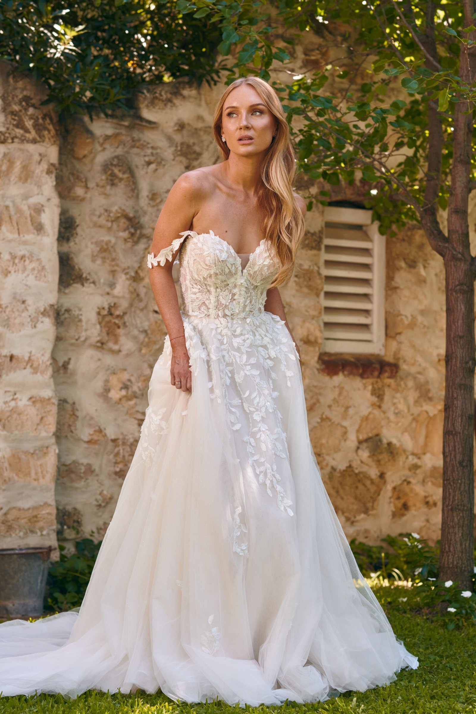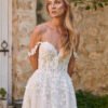 Featuring breathtaking boho lace, off-shoulder straps, and a flowy a-line skirt.