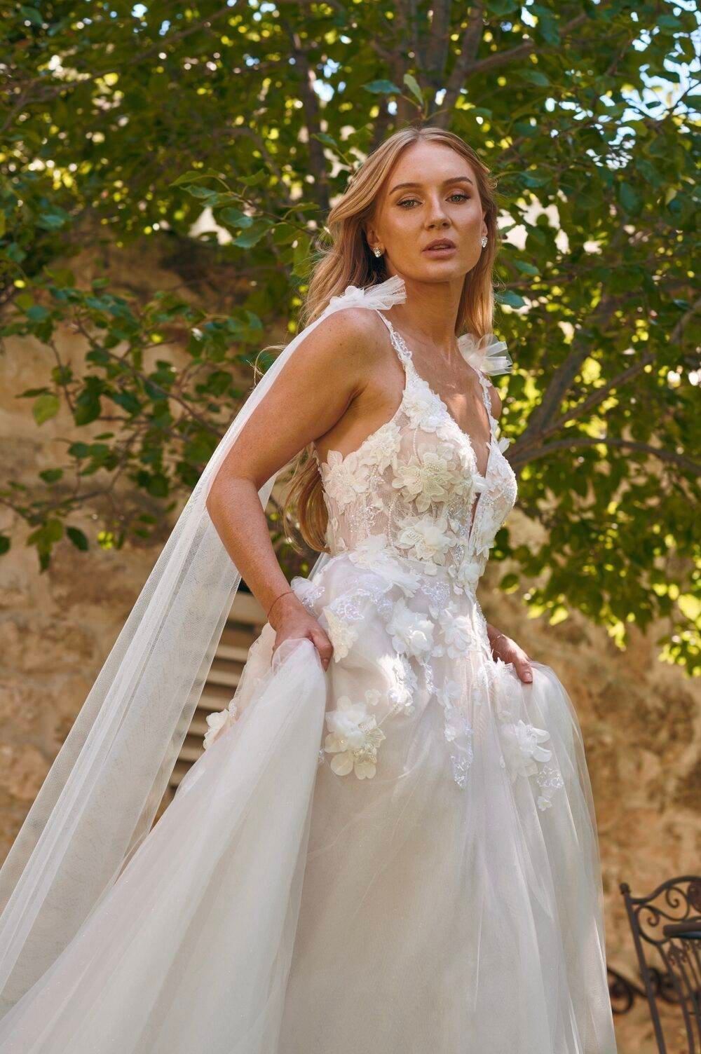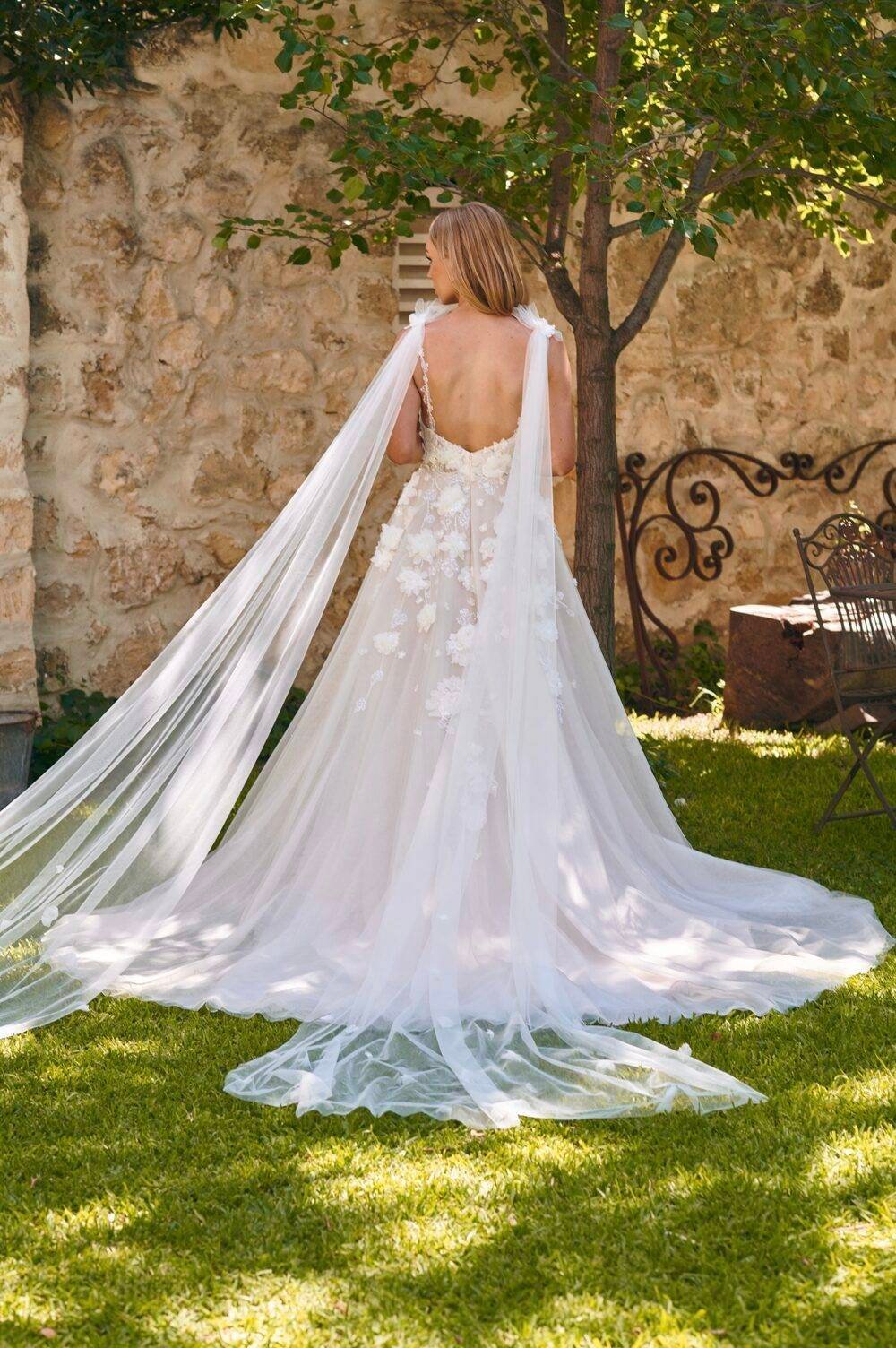An stunning whimsical gown, with floral lace, soft tulle, detachable wings and an aline silhouette.