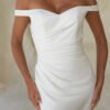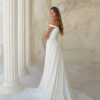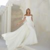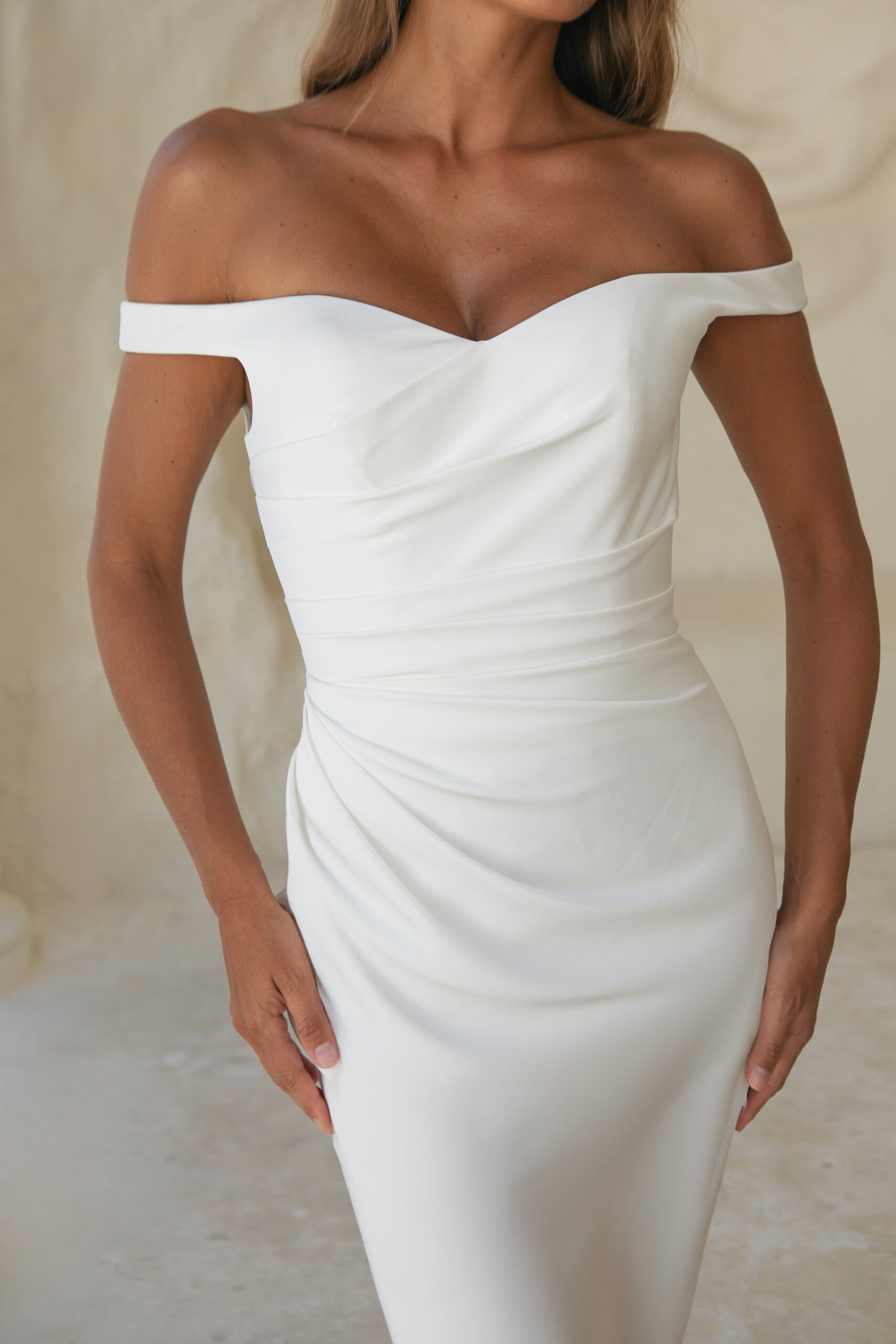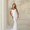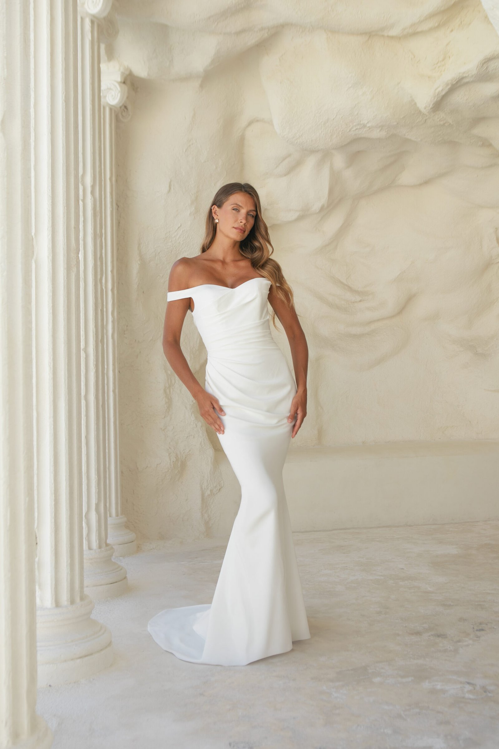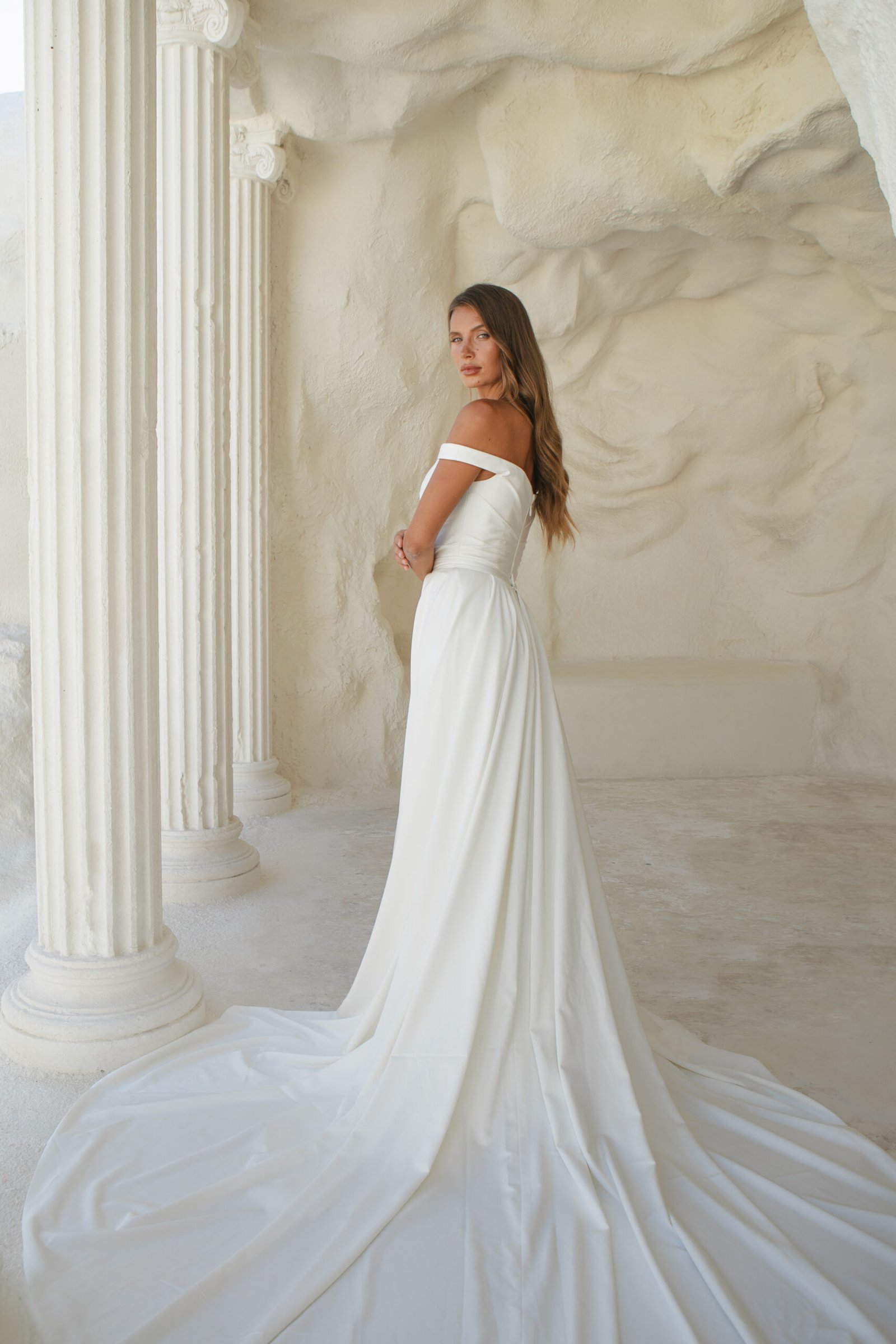 THIS VERSATILE GOWN OFFERS TWO STUNNING LOOKS, FEATURING A ROMANTIC OFF-SHOULDER NECKLINE WITH ELEGANT GATHERING ACROSS THE BODICE. IT BOASTS A SLEEK BASE DRESS BEAUTIFULLY COMPLEMENTED BY A DRAMATIC, FLOWING OVERSKIRT, CREATING A GRAND SILHOUETTE FOR TRANSFORMATIVE STYLE.