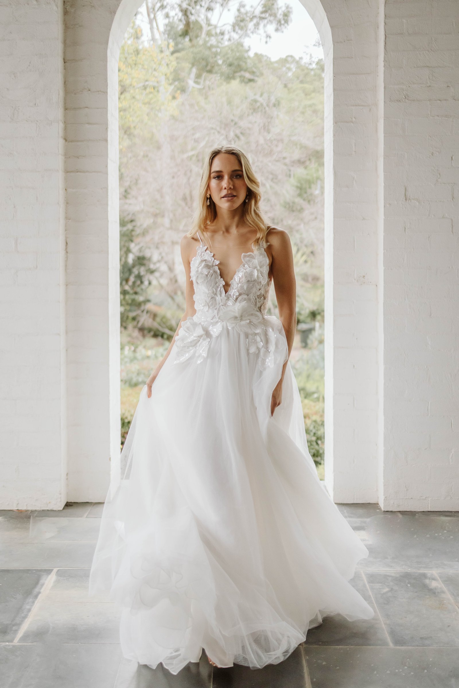 A gorgeous a-line gown with a 3D floral appliqué bodice and a full tulle skirt.