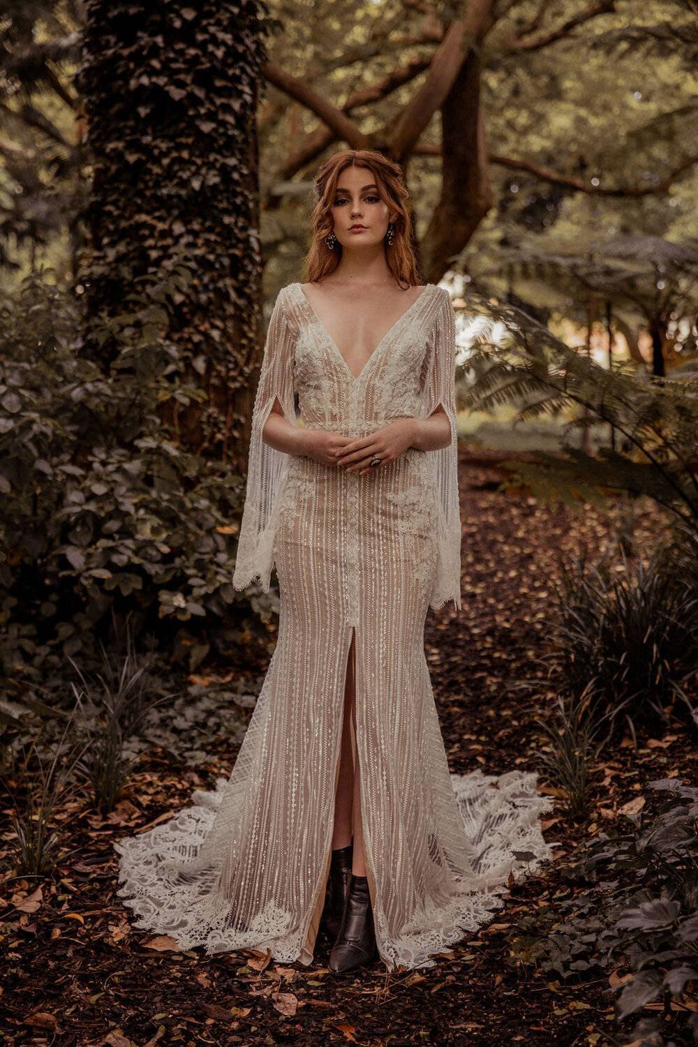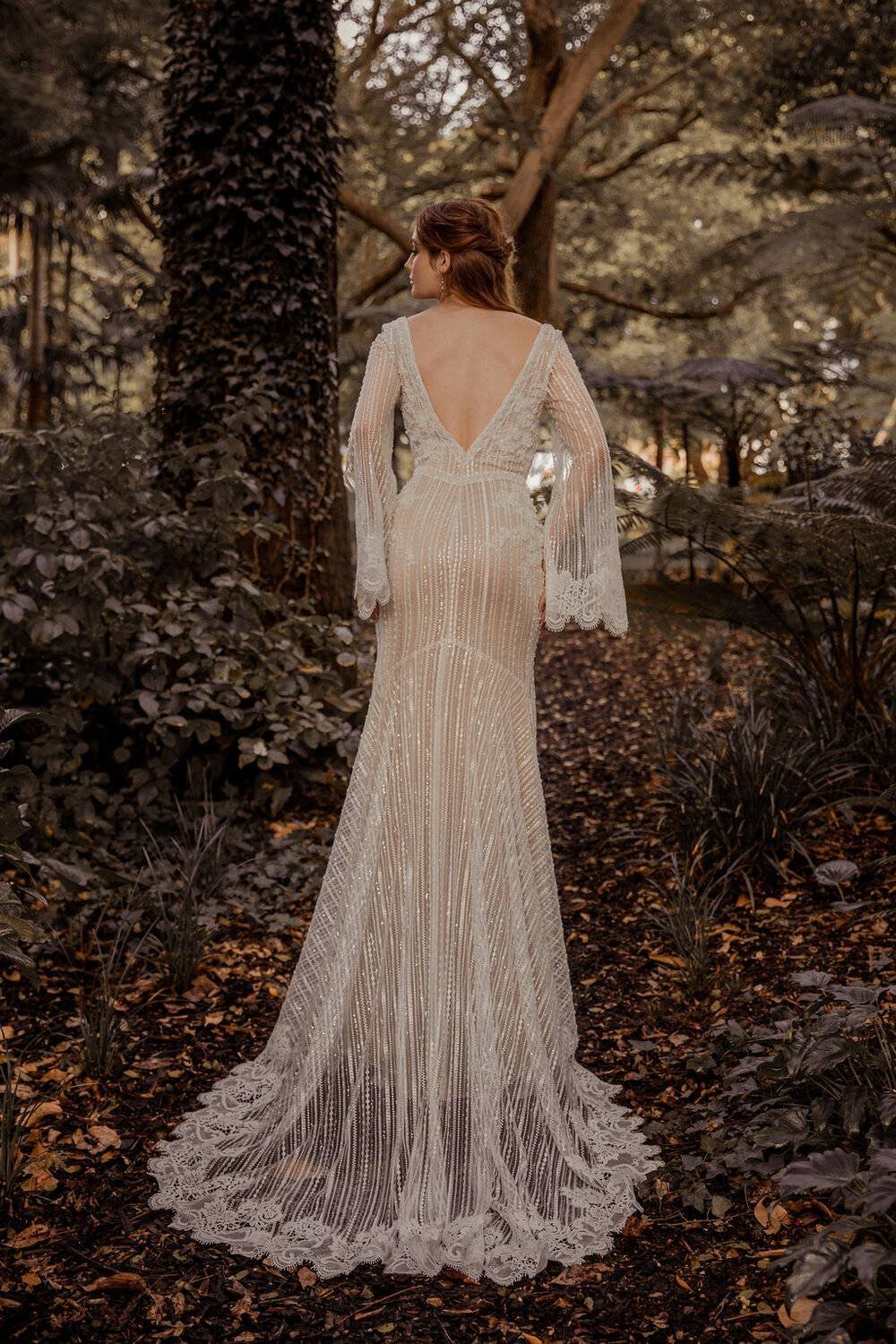 A feminine gown featuring long bell sleeves and beaded lacework.