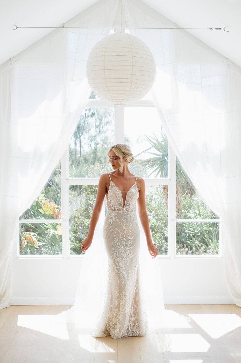 A stunning plunging neckline with a low V-back featuring detachable wings.