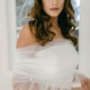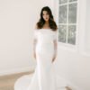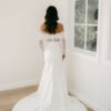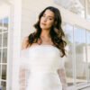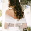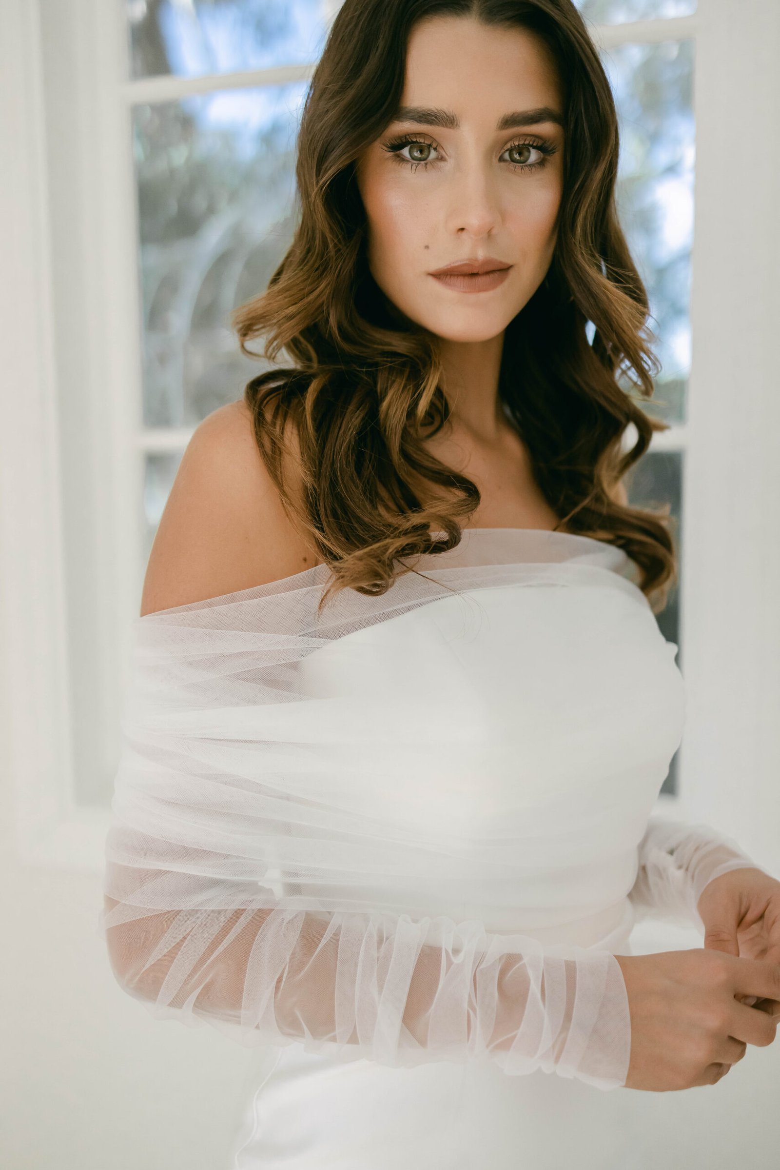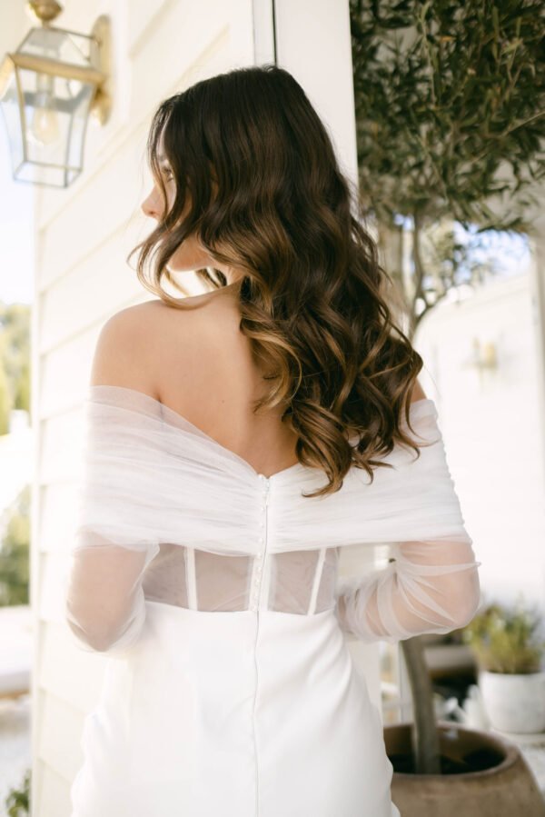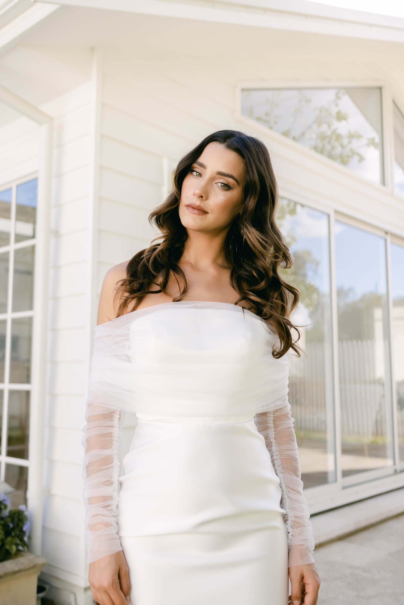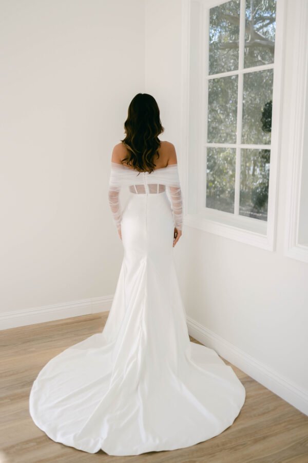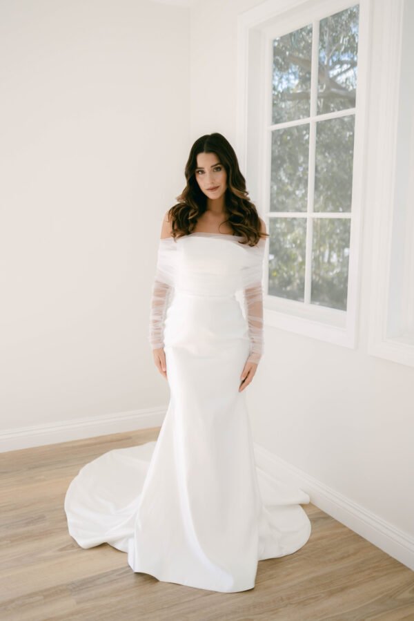 THIS DEFINITION OF THIS DRESS IS CHIC. A GORGEOUS STRAPLESS DRESS FEATURING REMOVABLE TULLE LONG SLEEVES AND TULLE WRAPPED AROUND THE BODICE TO GIVE THE DRESS A SOFT TOUCH.