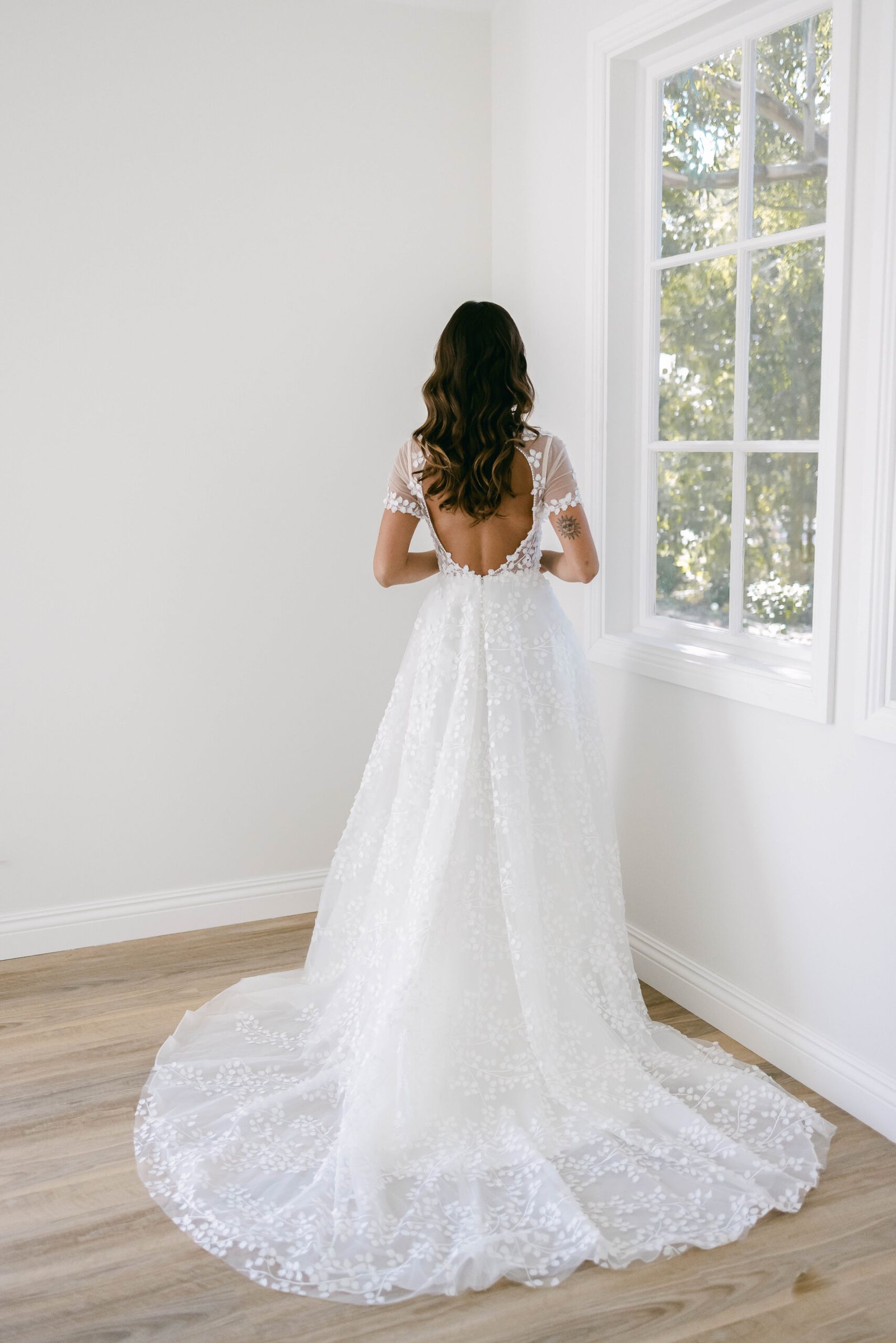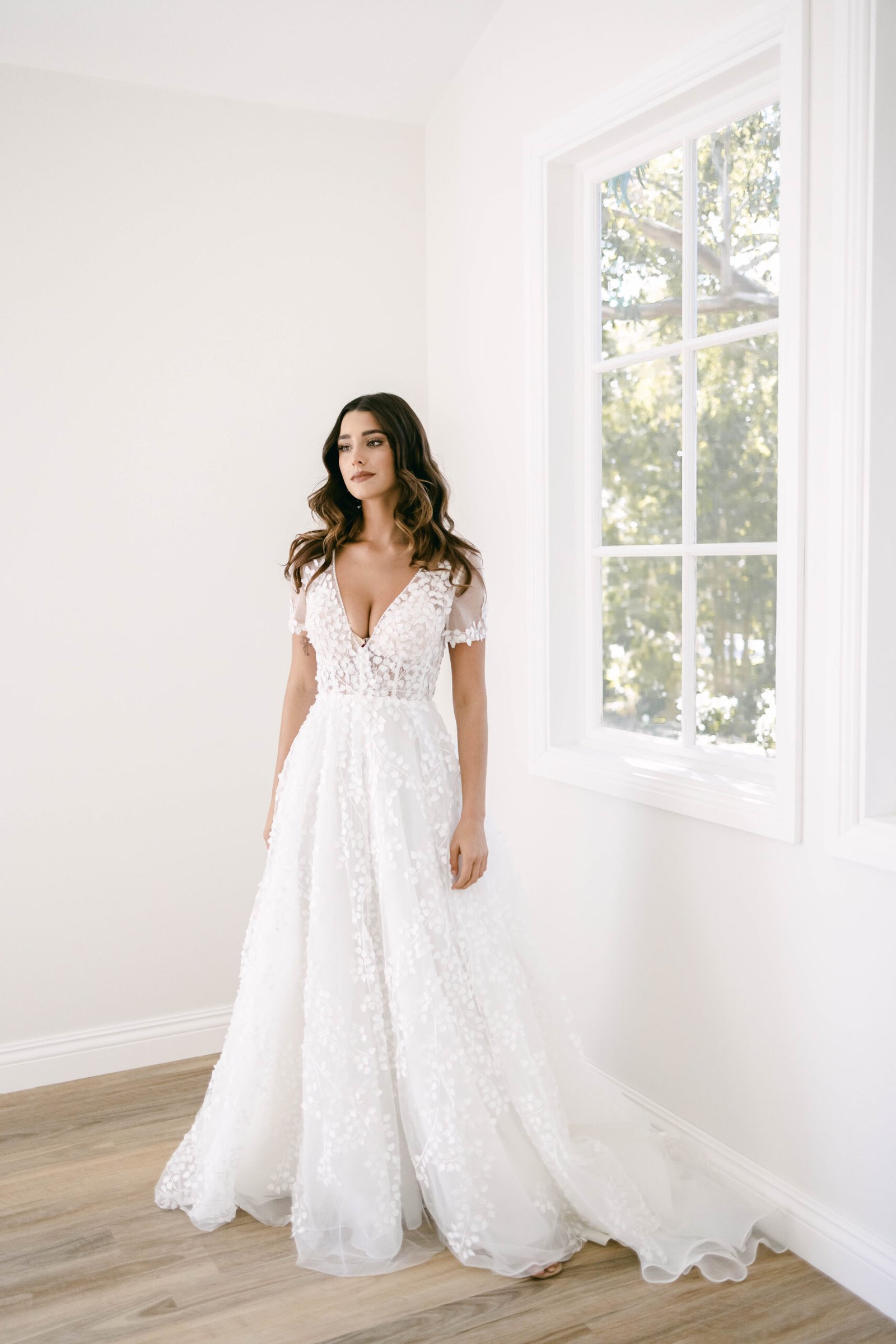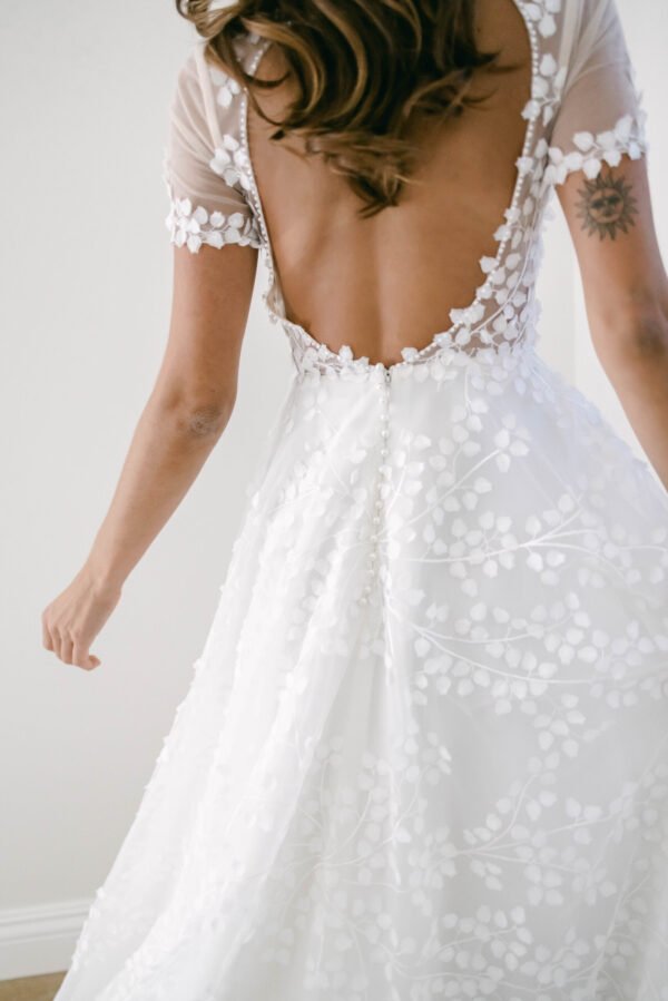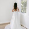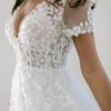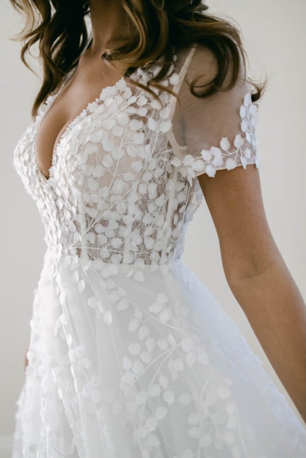 FOR THE ROMANTIC BRIDE WITH A MODERN TOUCH. SHE HAS A PLUNGE NECKLINE WITH A SHEER BODICE THAT FEATURES EXPOSED BONING OFFERING SUPPORT IN THE BUST. A KEY HOLE BACK WITH EDGE BEADING TO MAKE A STATEMENT AND BE THE ONLY SHOWSTOPPER ON YOUR SPECIAL DAY. A BREATHTAKING SILHOUETTE THAT WILL CAPTIVATE EVERYONE IN THE ROOM! FEEL CONFIDENT, CHIC, AND READY TO MAKE MEMORIES THAT WILL LAST A LIFETIME.
