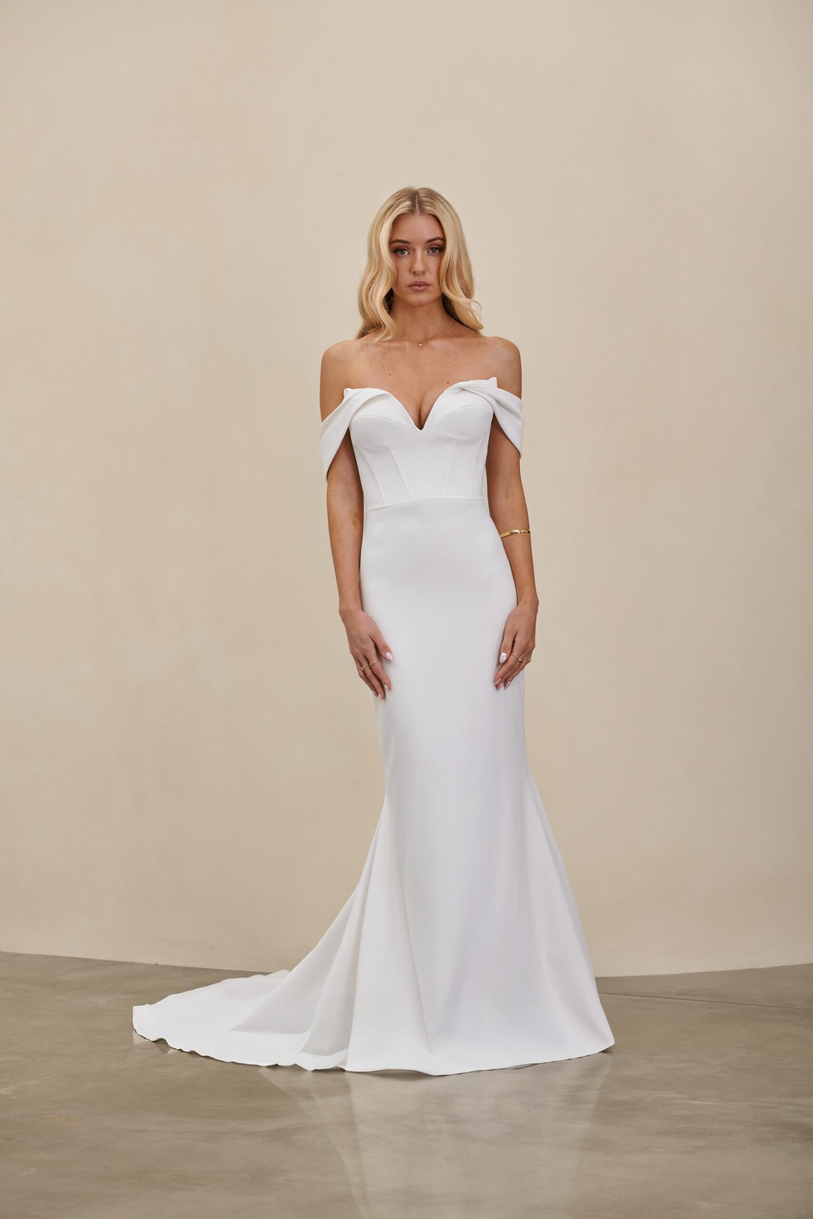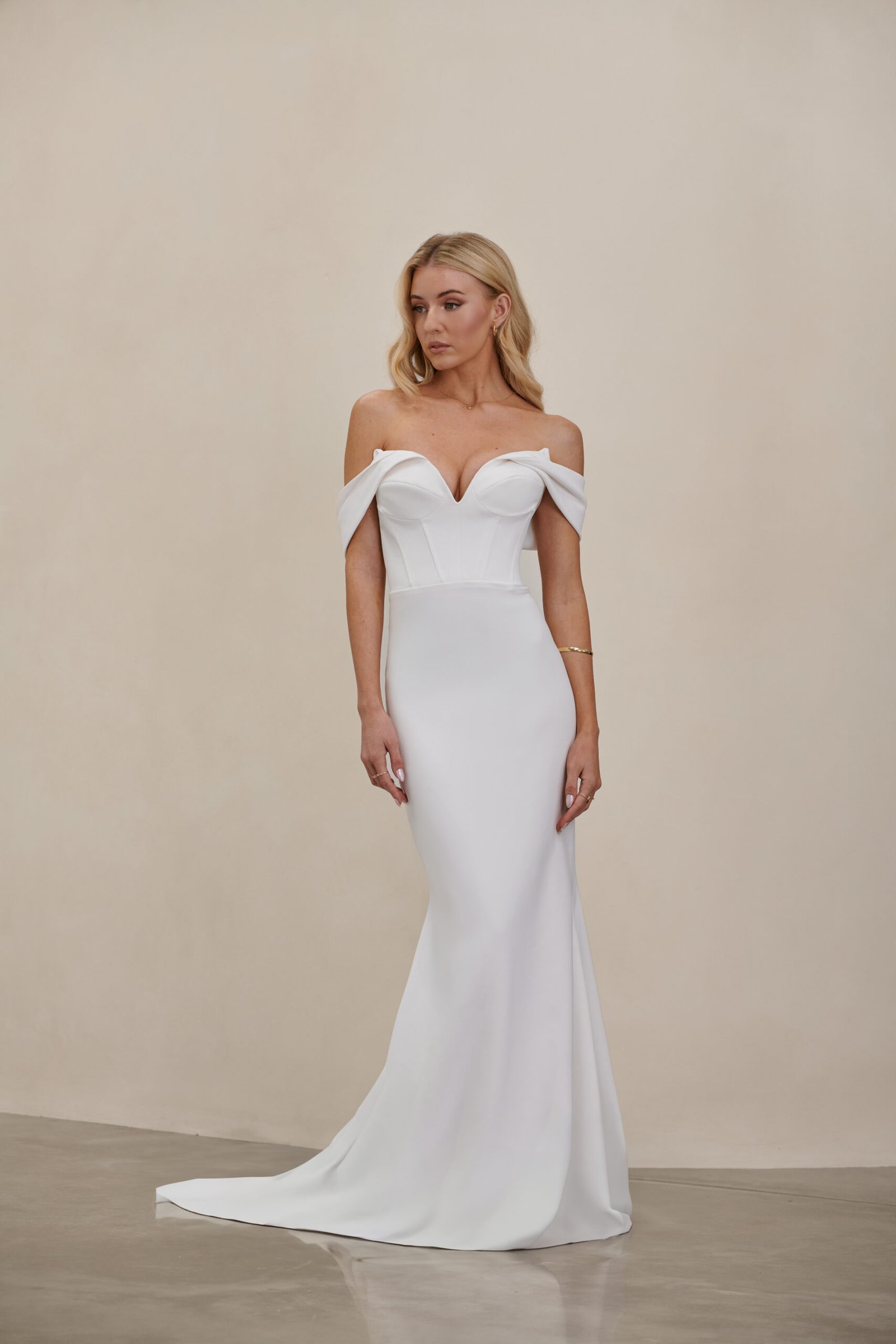 THIS IS THE PERFECT DRESS, FEATURING A ROMANTIC SWEETHEART NECKLINE, A STRUCTURED BODICE WITH STRAPS FALLING GRACEFULLY OFF YOUR SHOULDERS. THE CREPE MATERIAL PERFECTLY SCULPTS THE BODY MAKING IT EFFORTLESSLY CHIC YET ELEGANT.