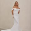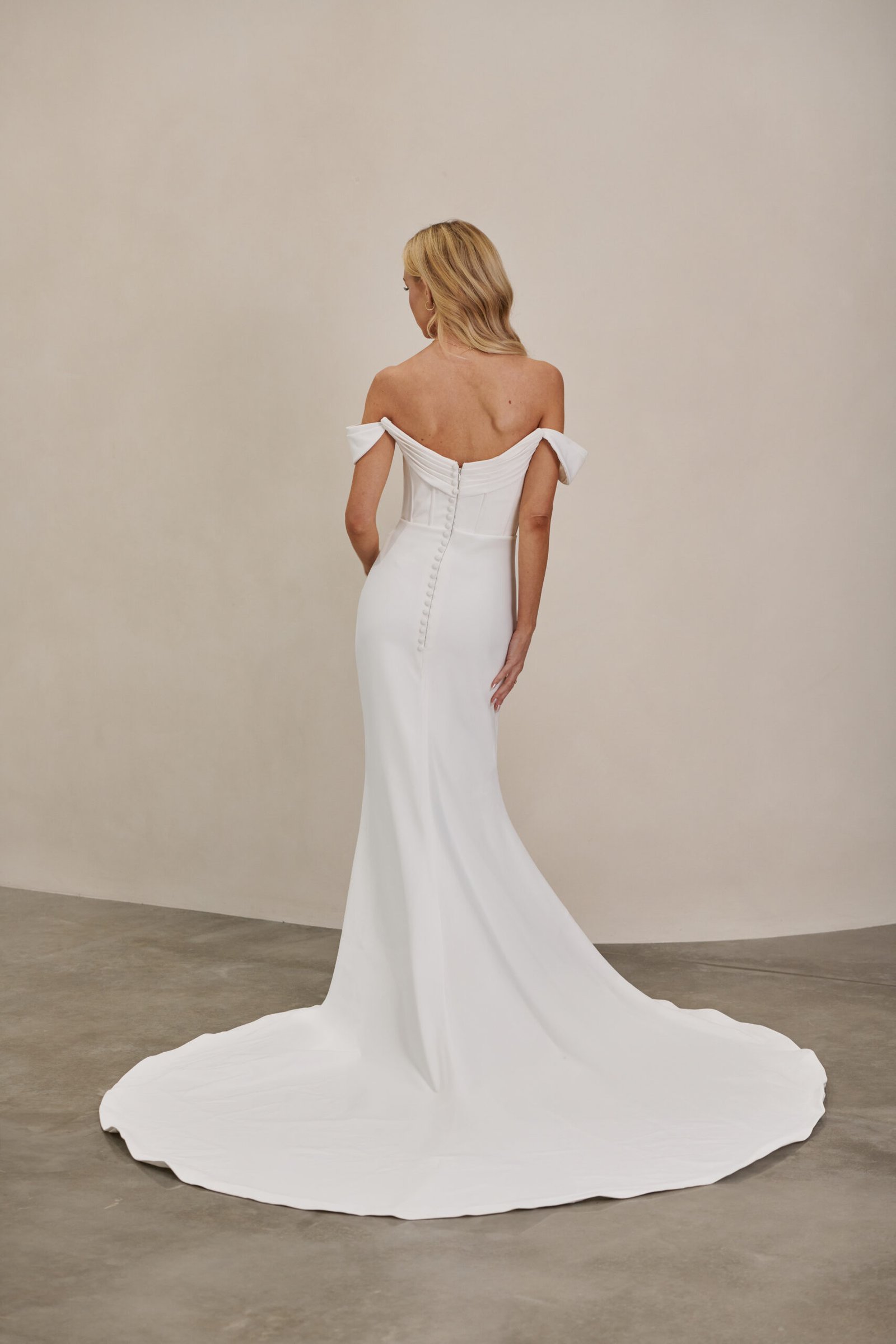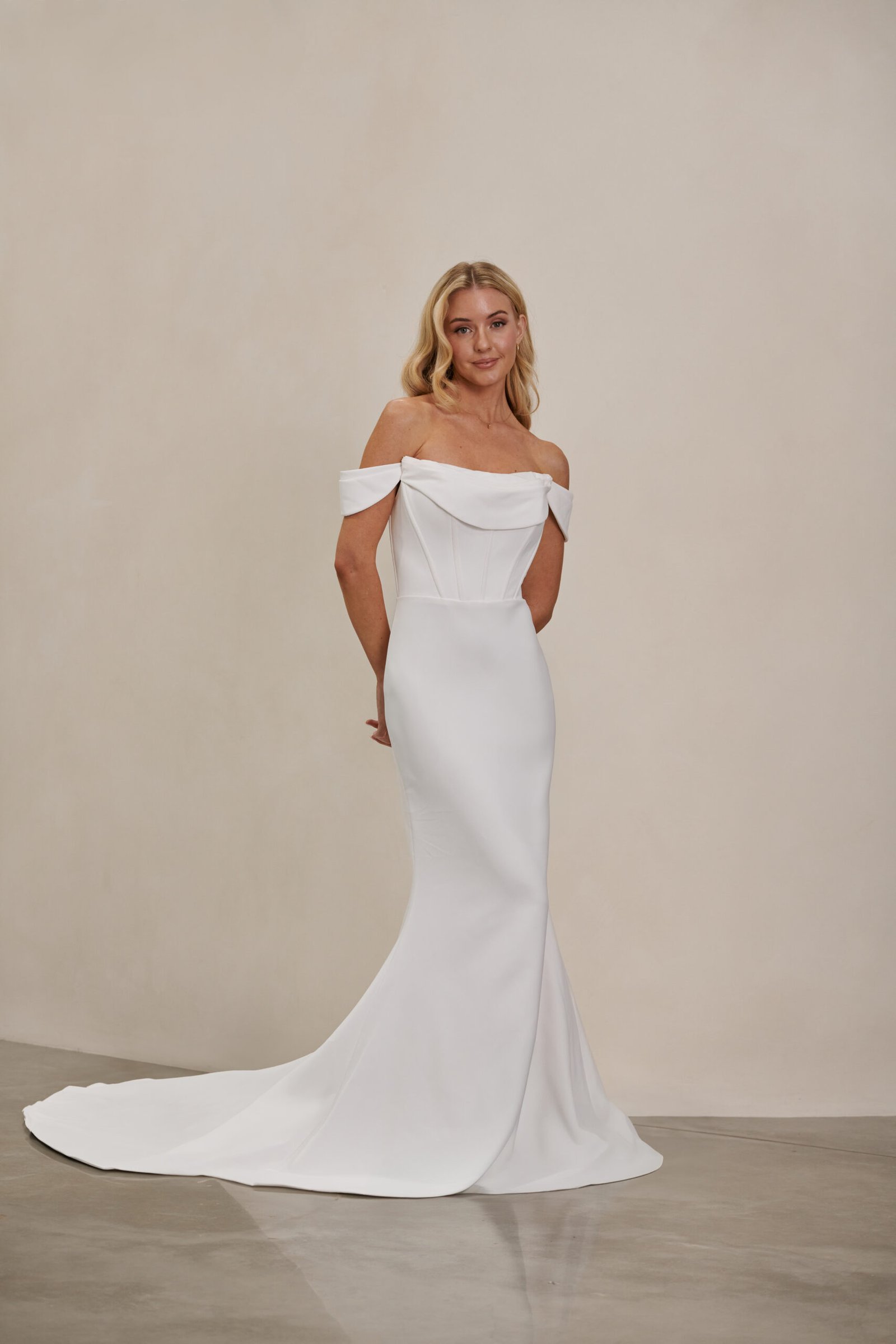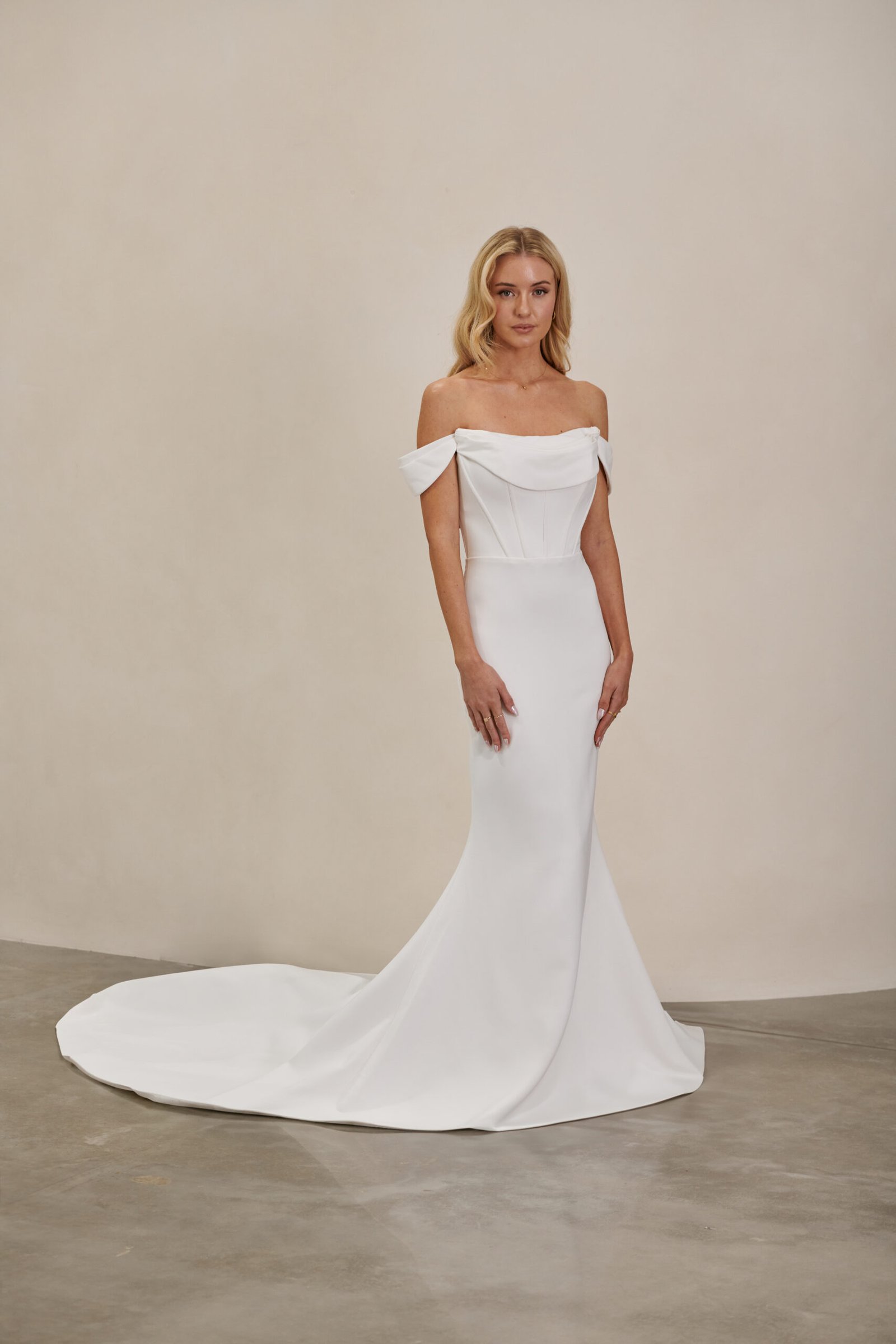 AN OFF THE SHOULDER MOMENT, STRAIGHT SKIRT GOWN. FEATURING A DRAPE DETAIL WITH BONING DOWN THE BODICE AND A SCOOP BACK GIVING YOU AN ELEGANT YET MODERN LOOK.