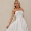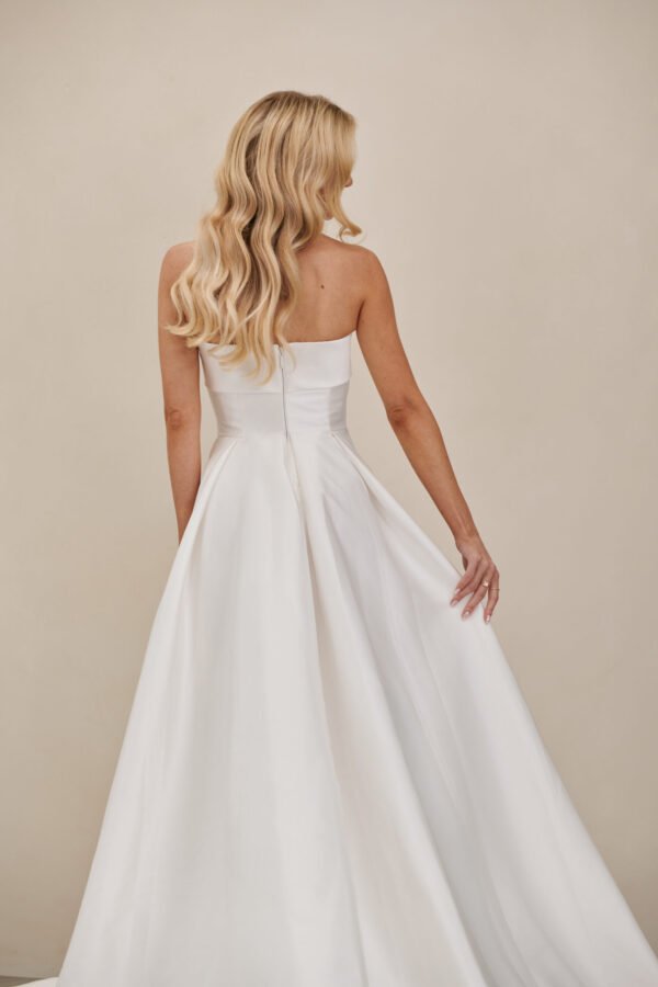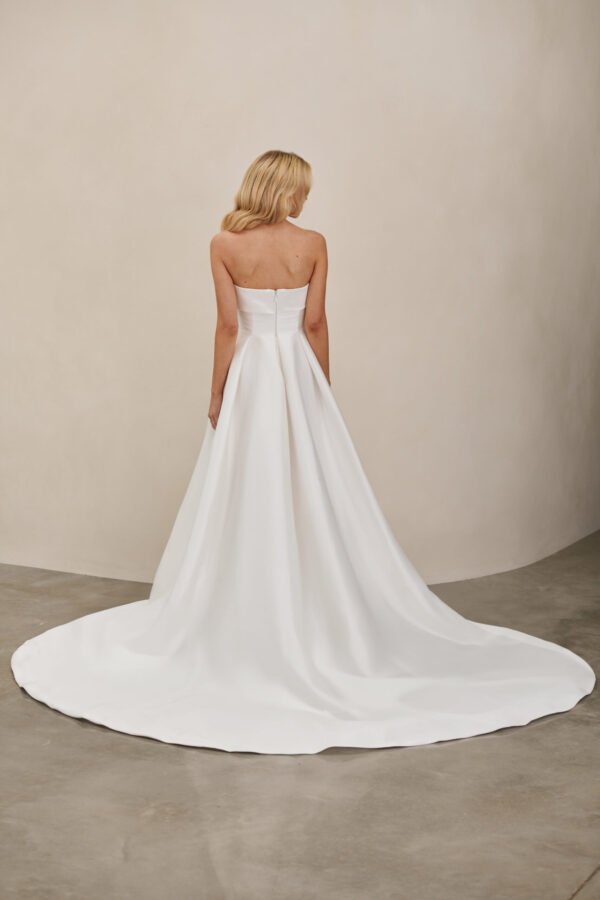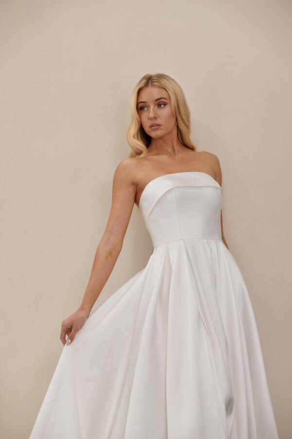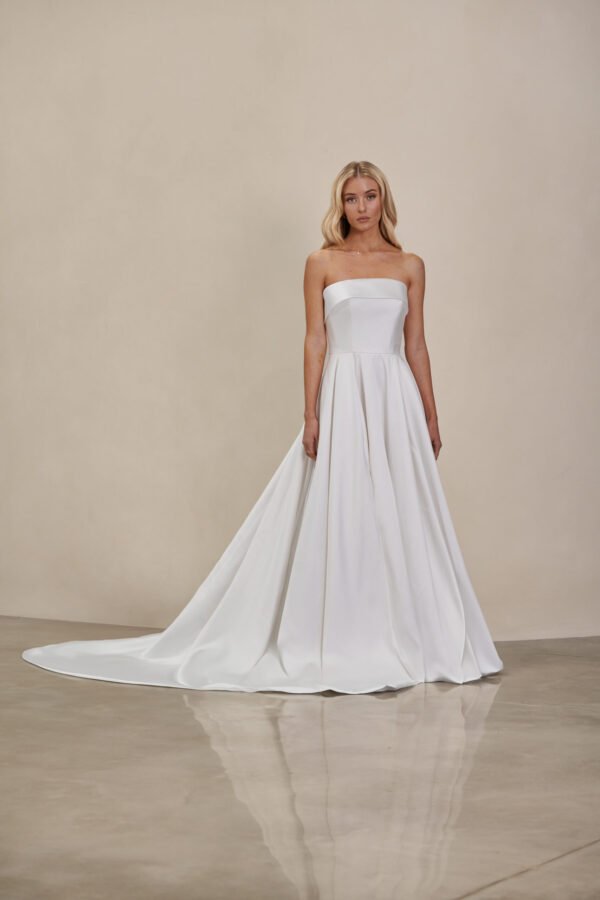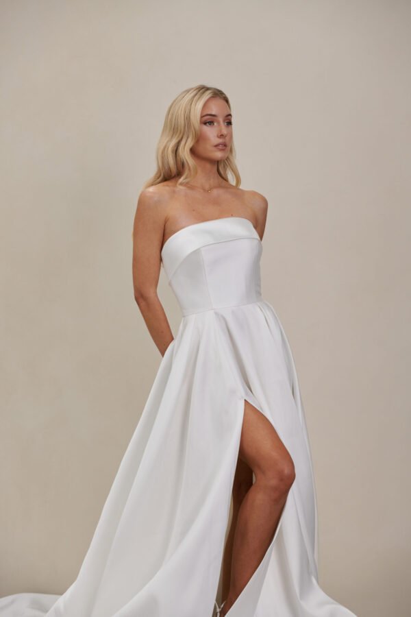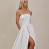 A STUNNING STRAPLESS DRESS FEATURING AN A-LINE SILHOUETTE. THE BODICE AND SKIRT MAKE A CLASSIC AND FLATTERING DRESS. A SPLIT IS LOCATED AT THE SKIRT THAT IS PERFECT FOR ALLOWING WEDDING HEELS TO PEEK THROUGH.