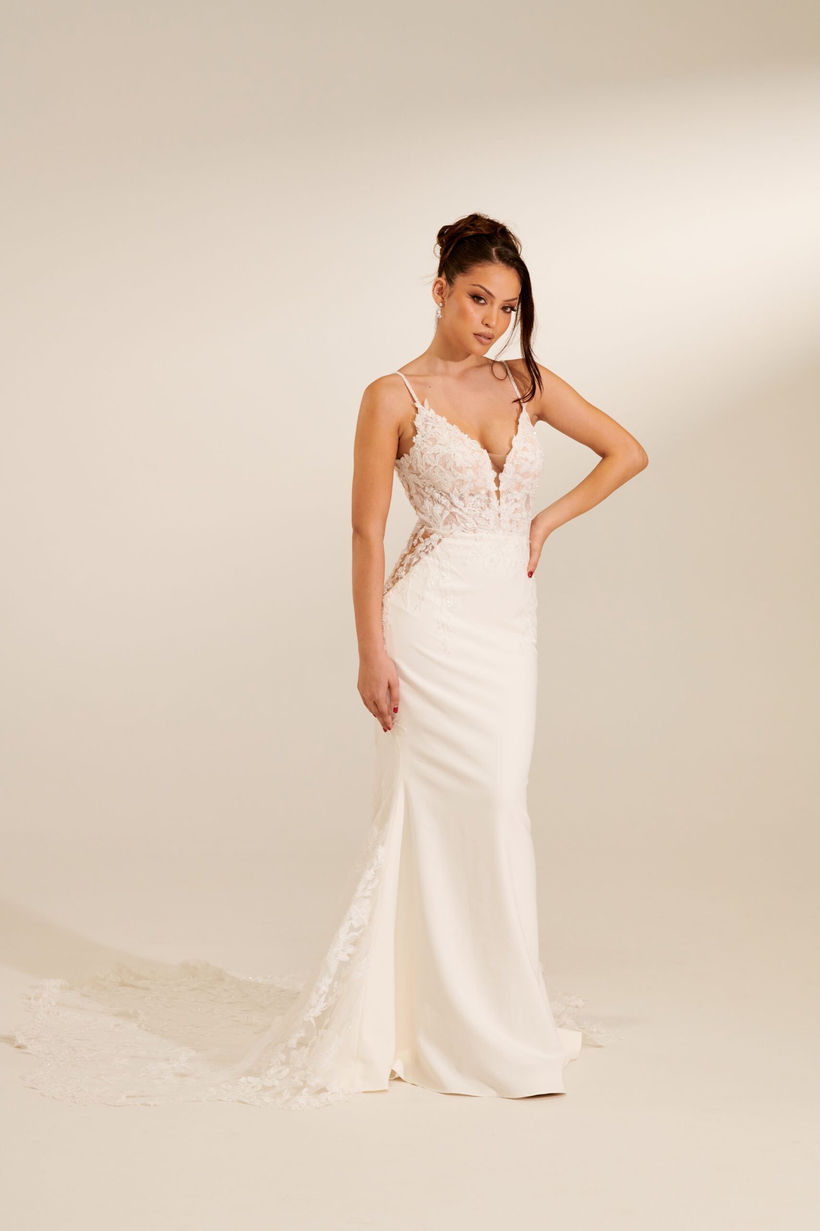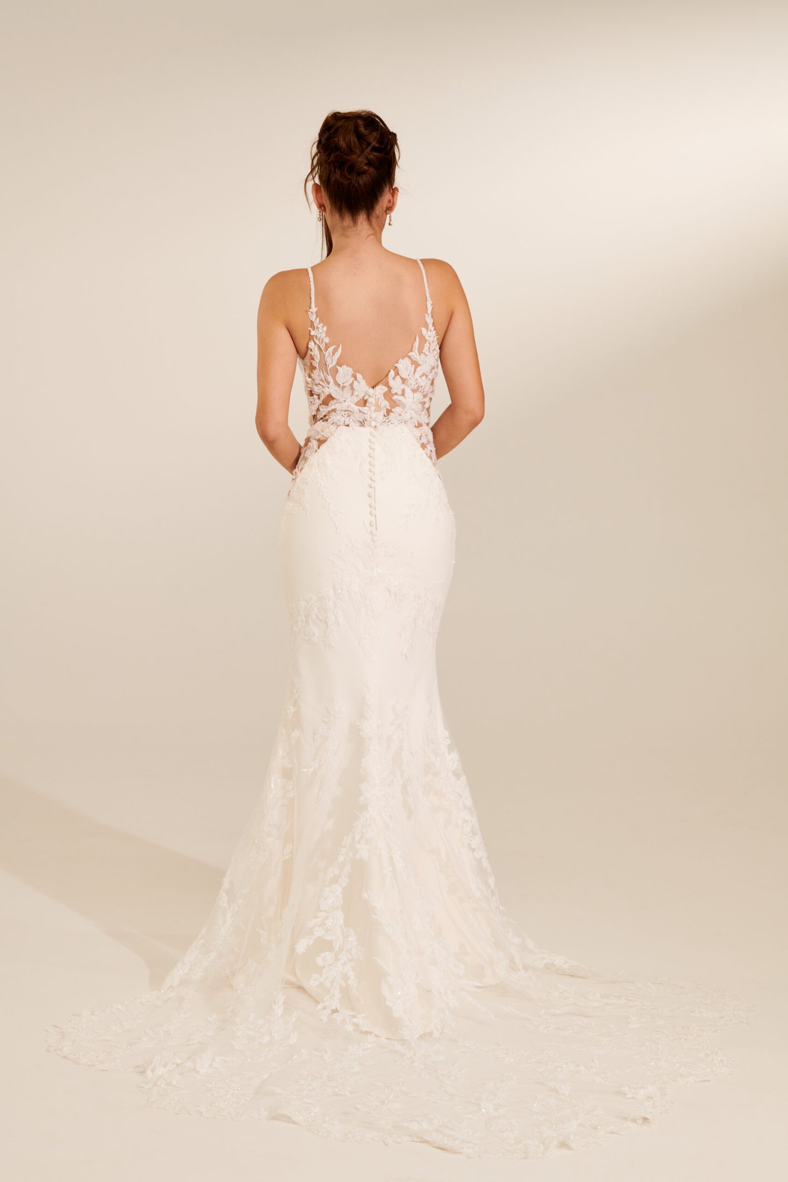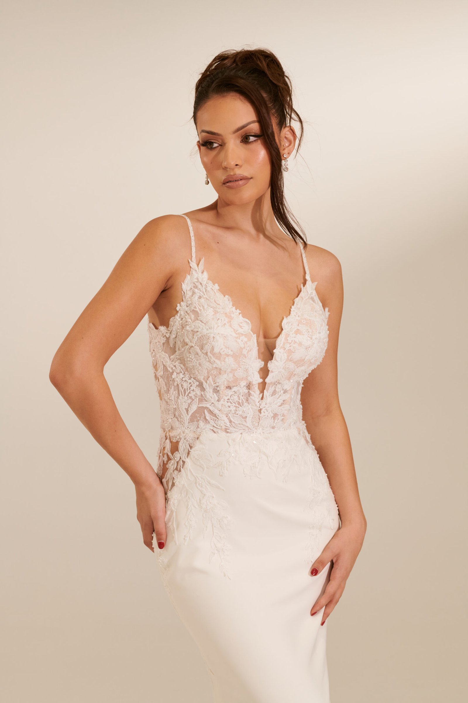 A PLUNGING V-NECK WEDDING GOWN FEATURING A MERMAID STYLE SKIRT AND BEAUTIFUL LACEWORK CASCADING THROUGHOUT.