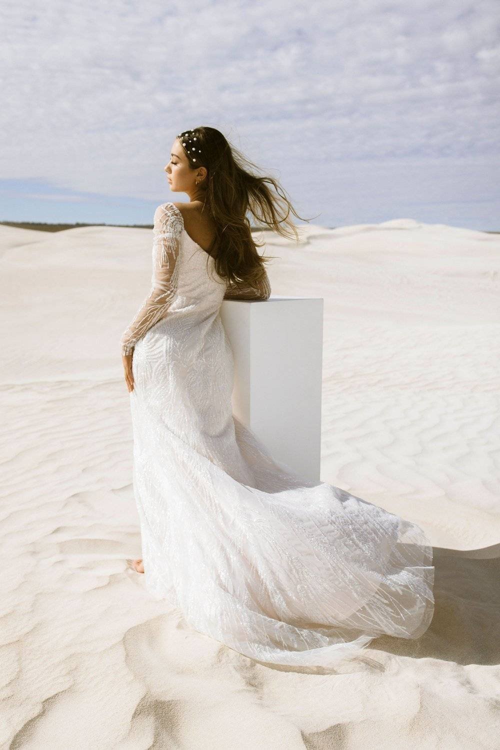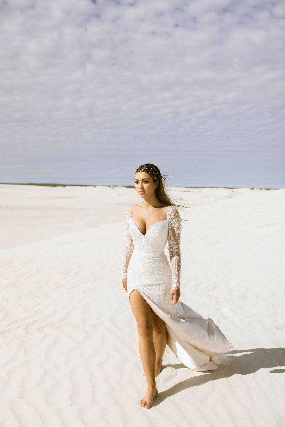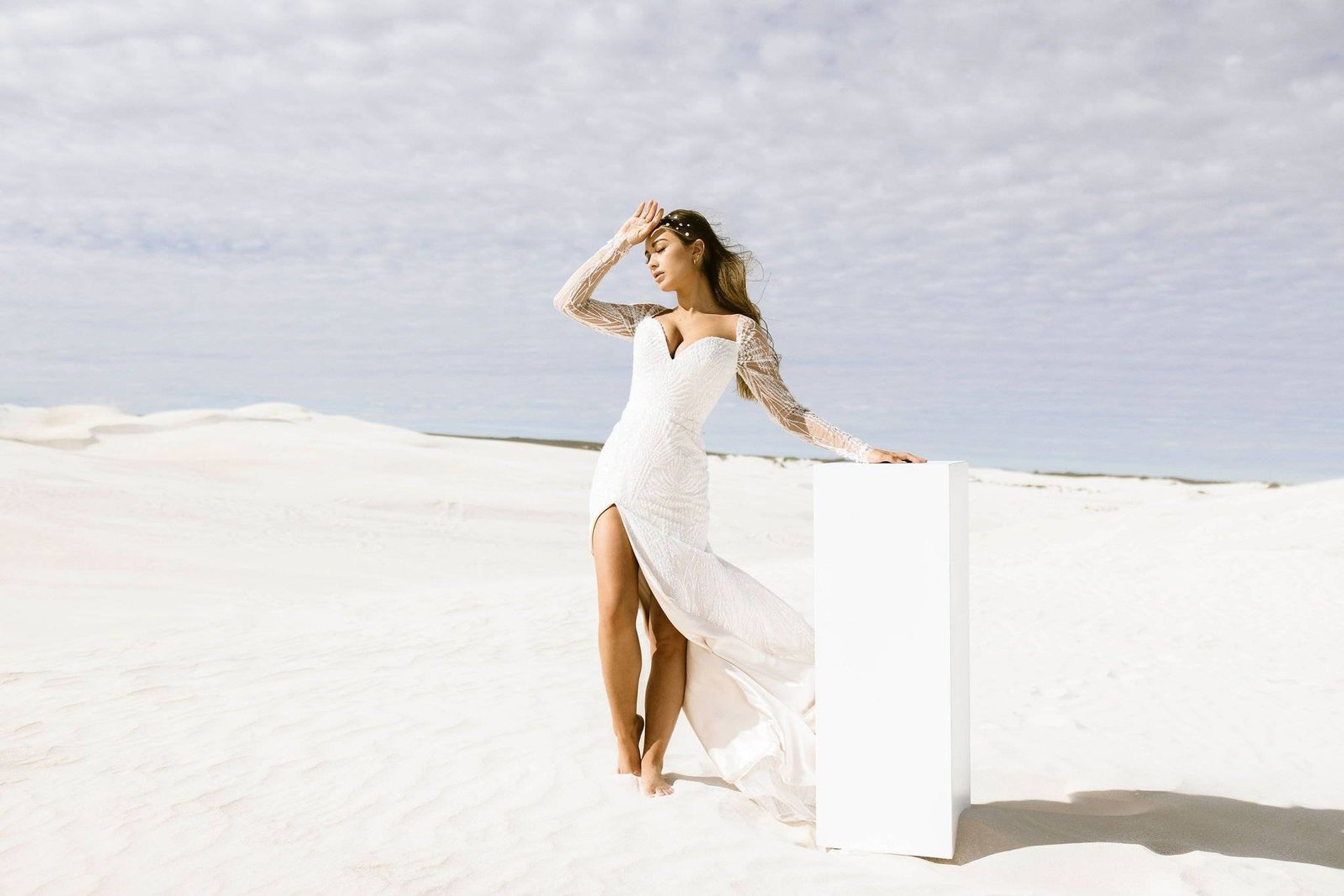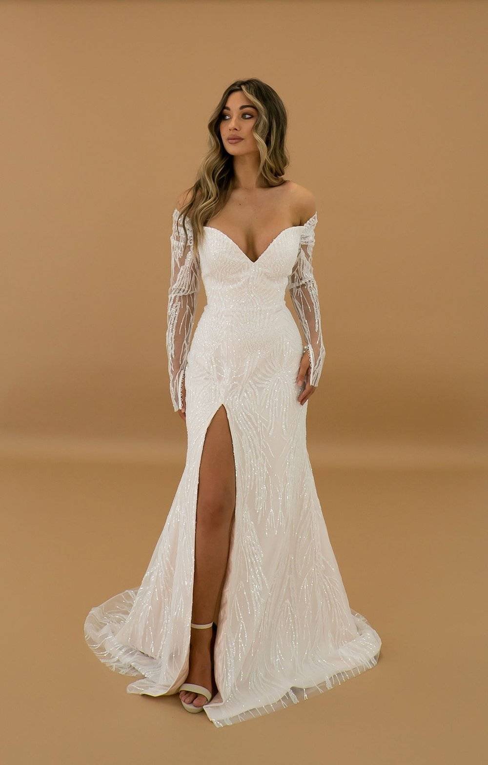 A flattering off the shoulder gown featuring a high leg slit, long sleeves, delicate beaded detailing and a sweetheart neckline.