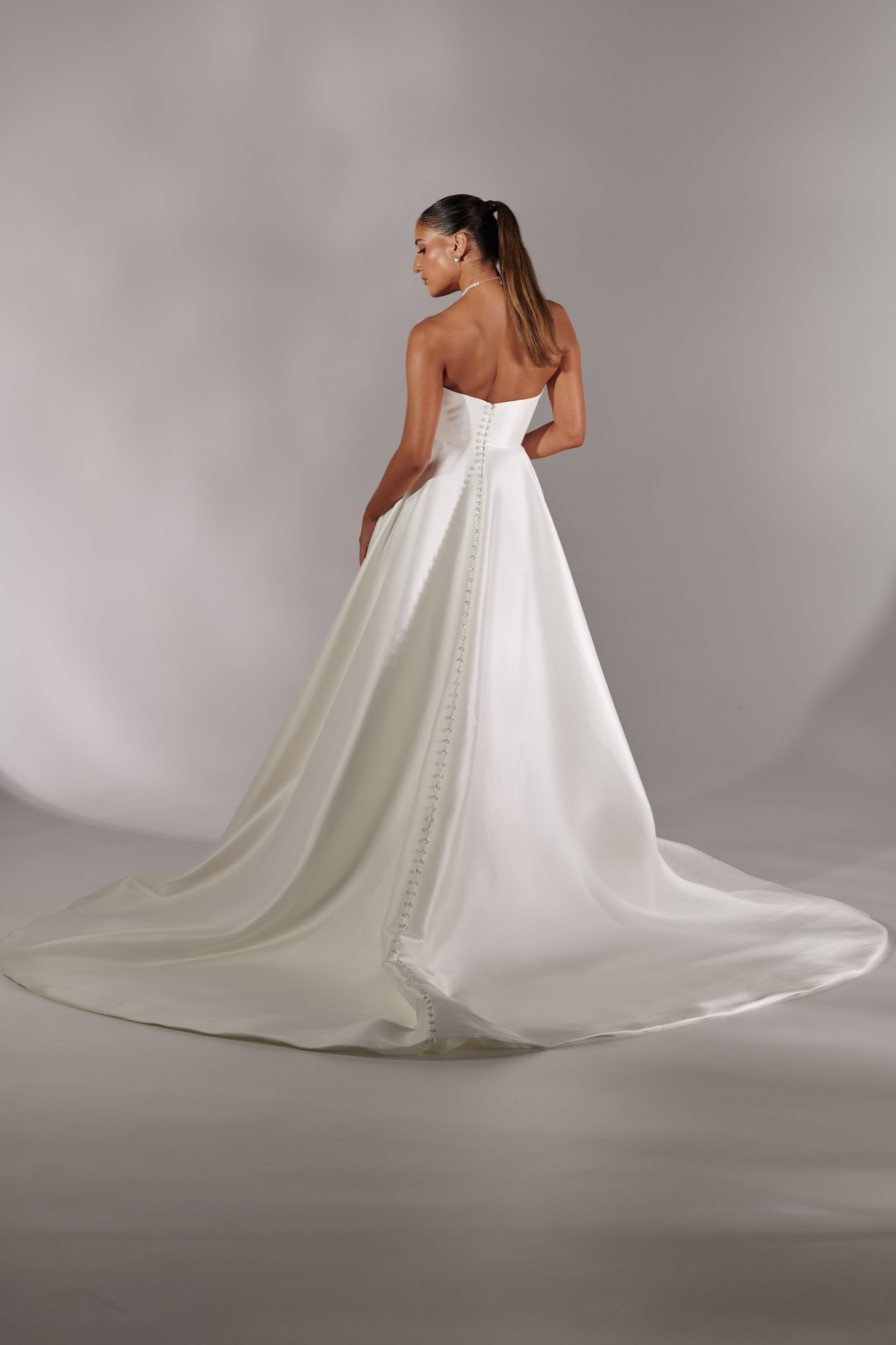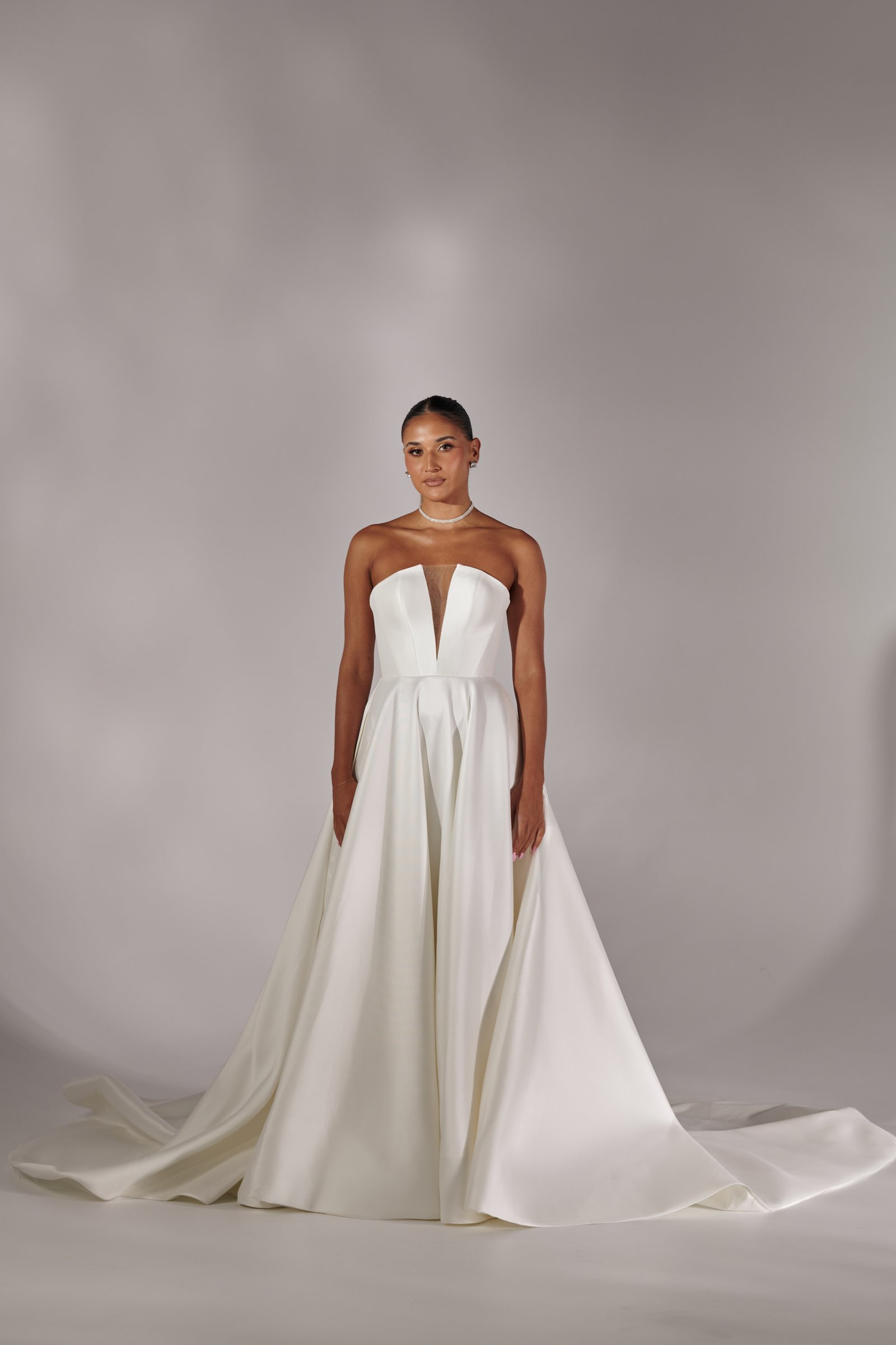 A stunning strapless crepe gown that features a statement plunging neckline.