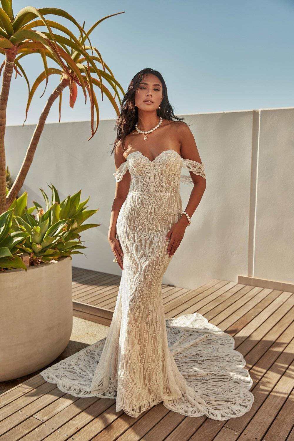 A beautiful gown embellished in beaded lace, off-shoulder straps, and a flattering mermaid skirt.